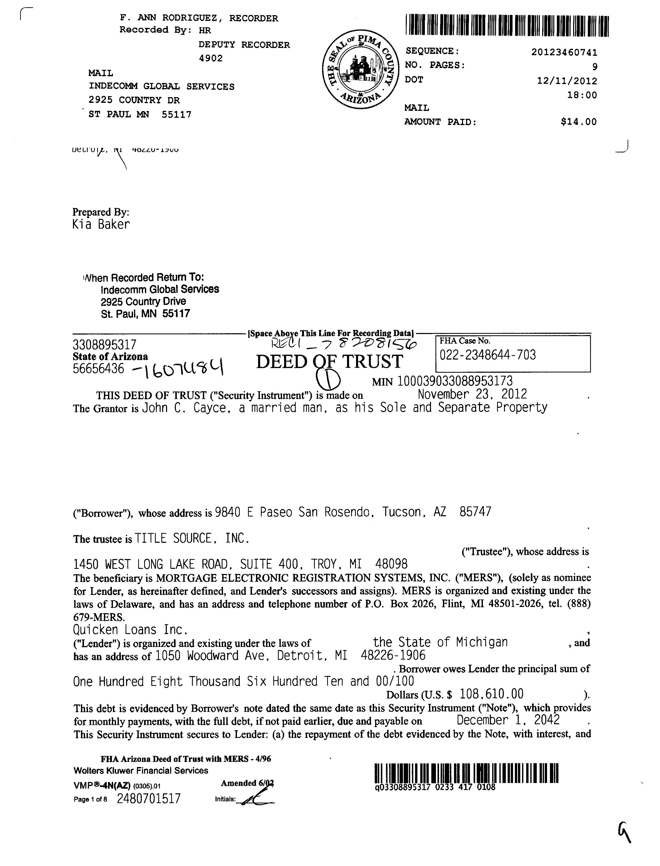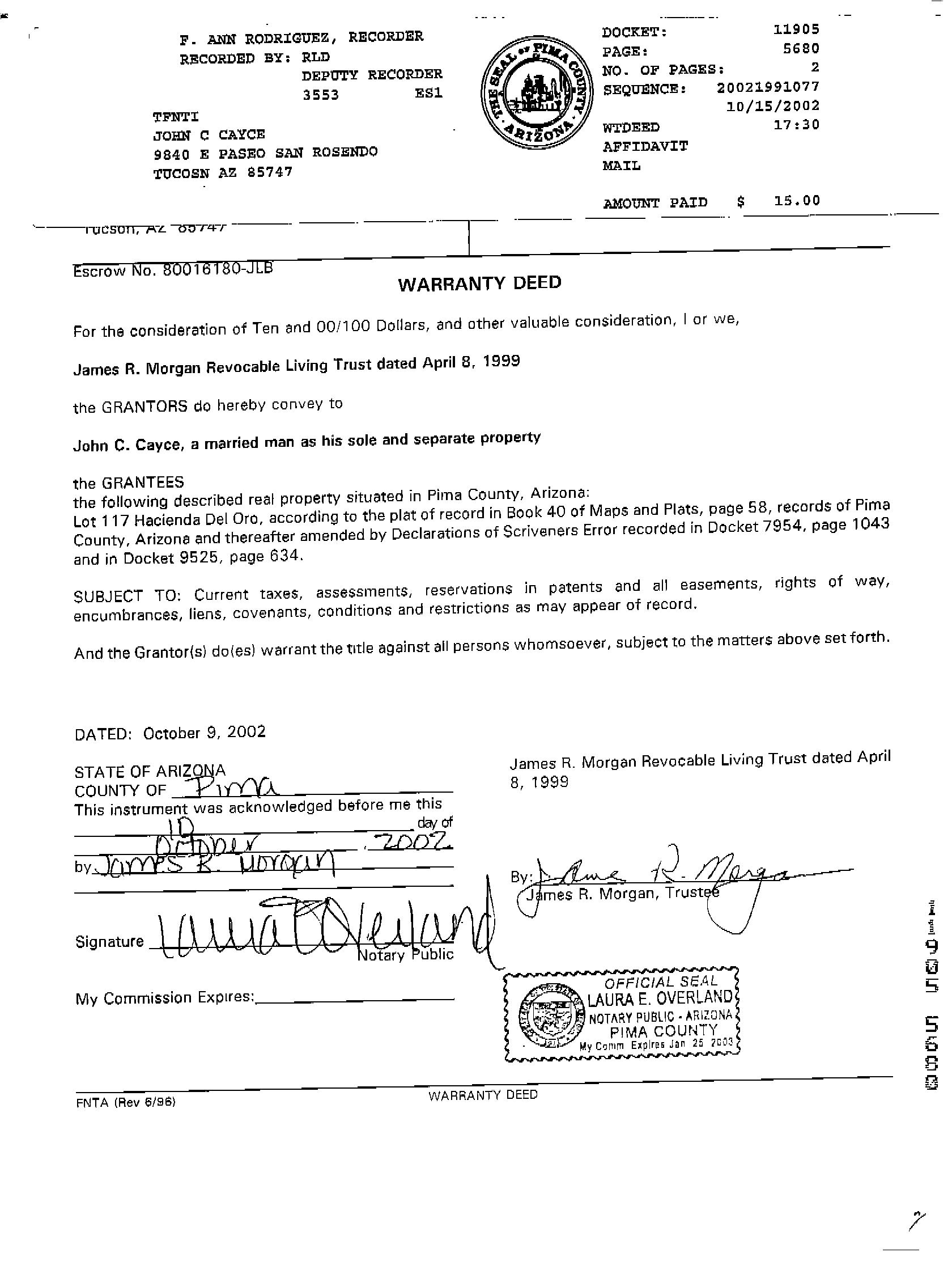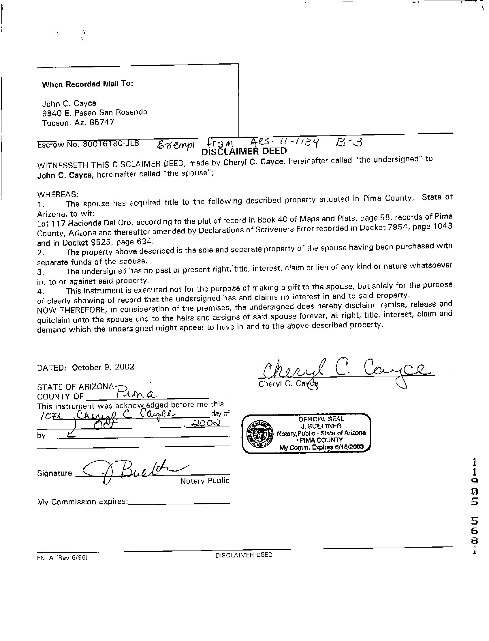 Owner Name : Cayce John C / Cayce Cheryl C Mailing Address : 9840 E Paseo San Rosendo, Tucson AZ 85747-9135 R051
