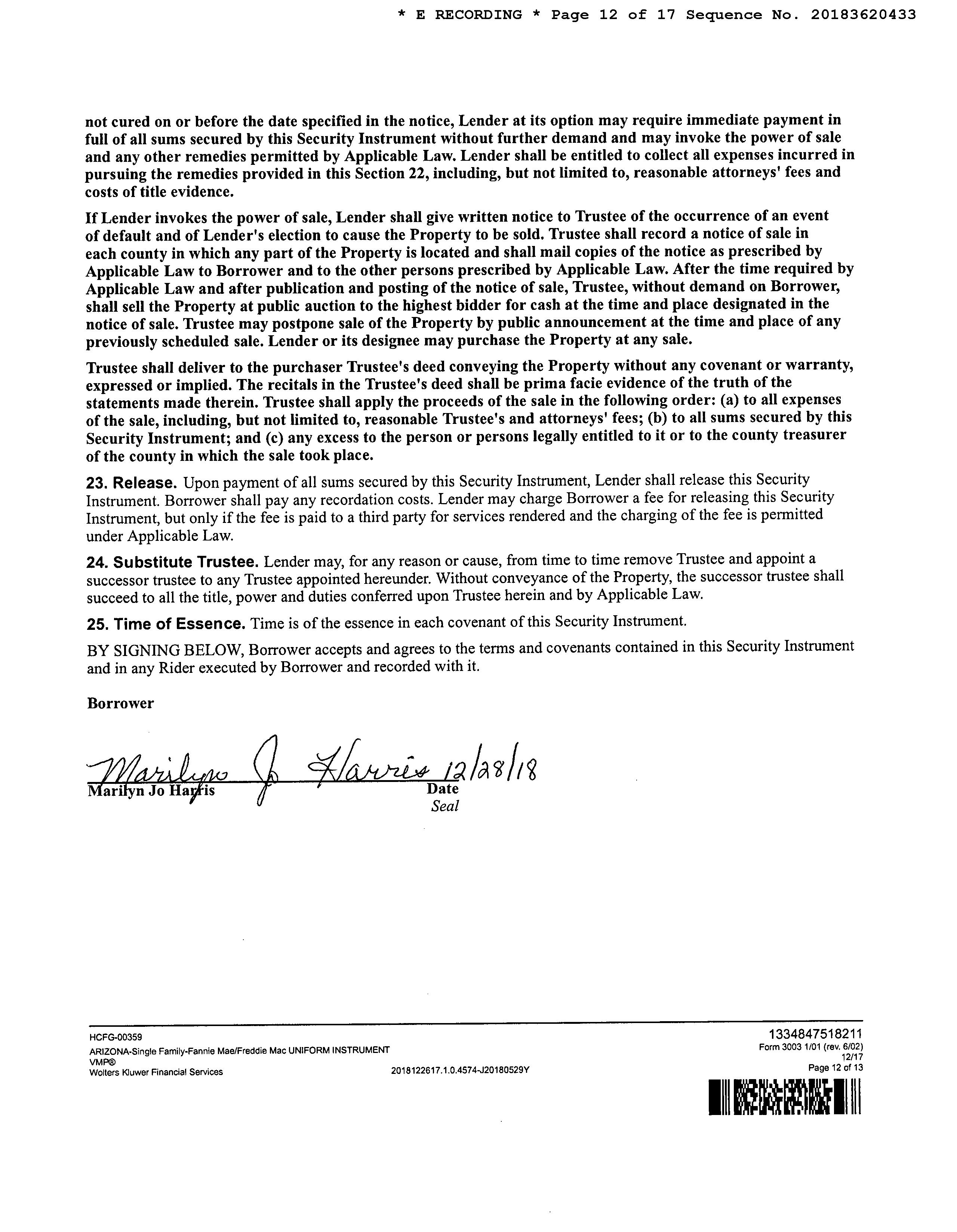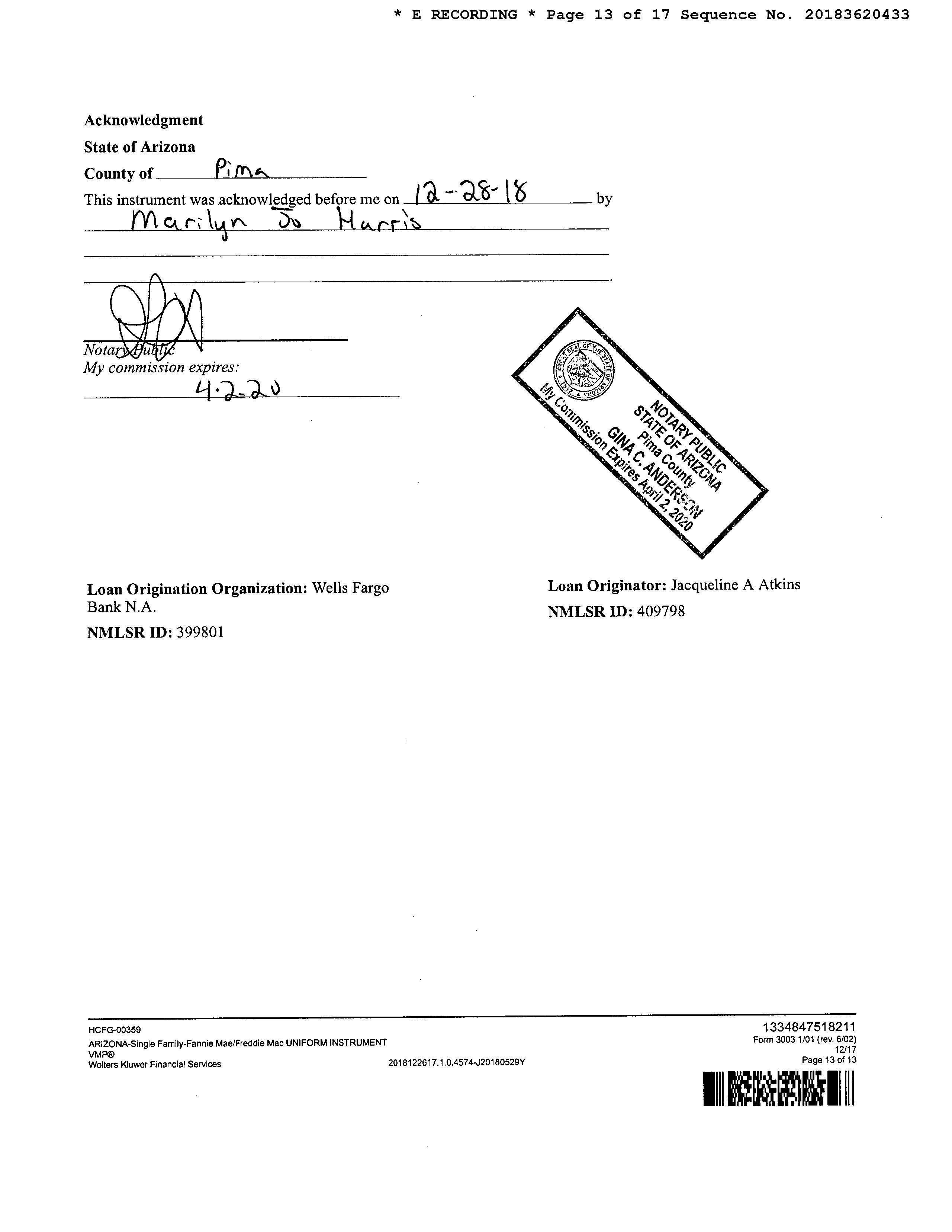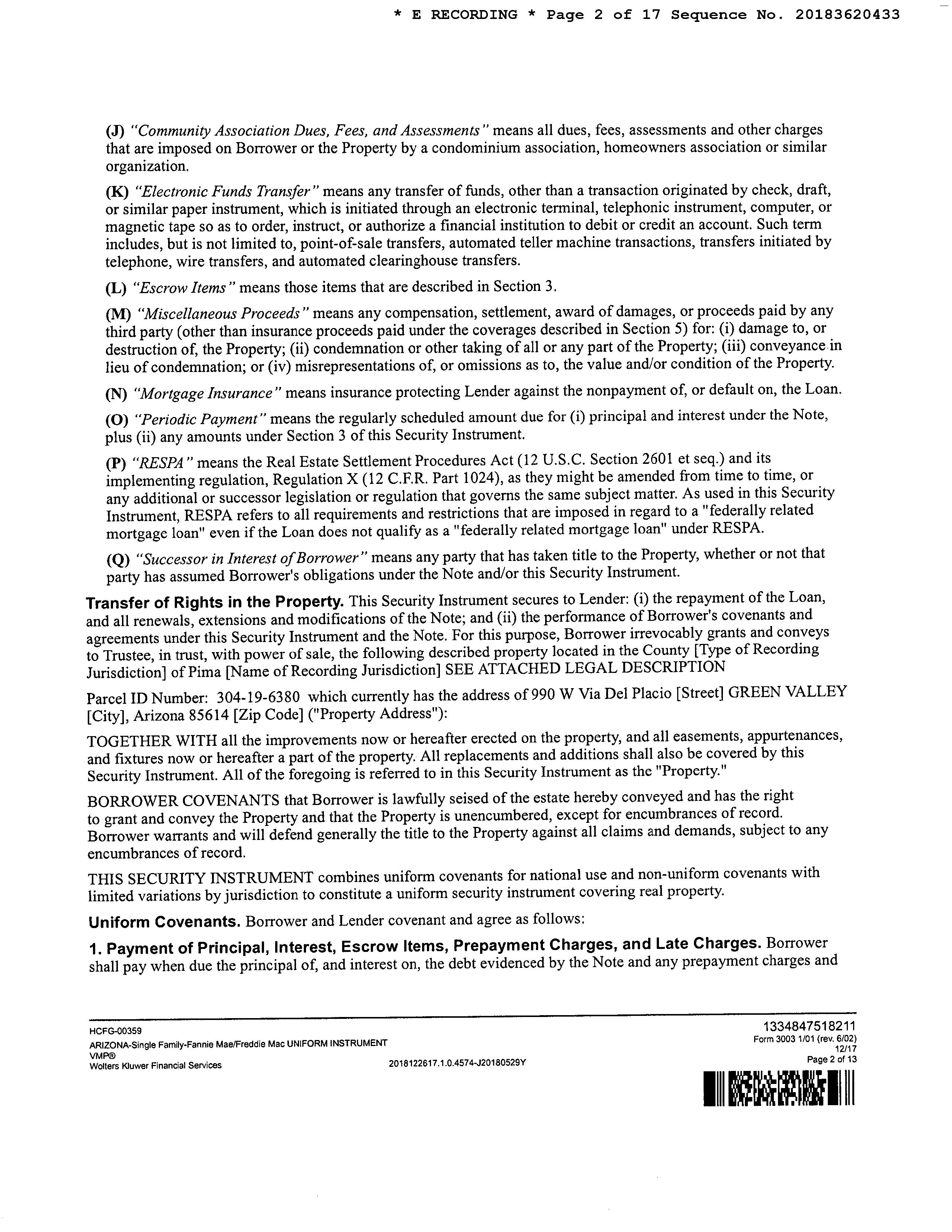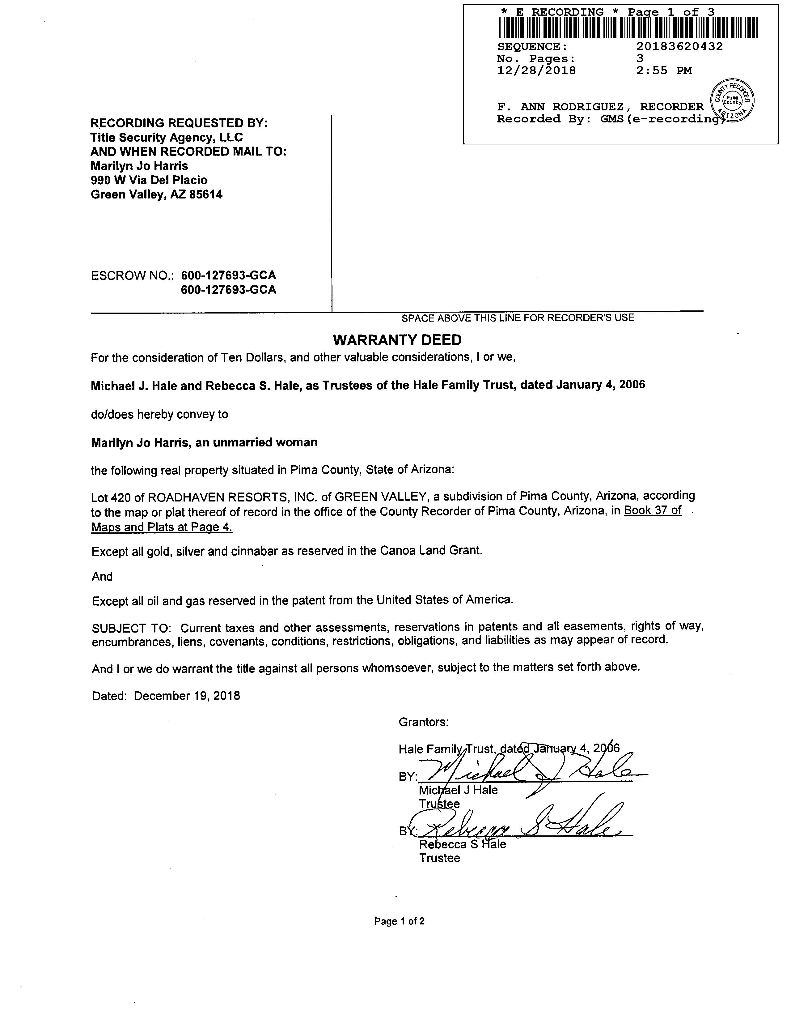 Owner Name : Harris Marilyn Jo Mailing Address : 990 W Via Del Placio, Green Valley AZ 85614-5862 C055
