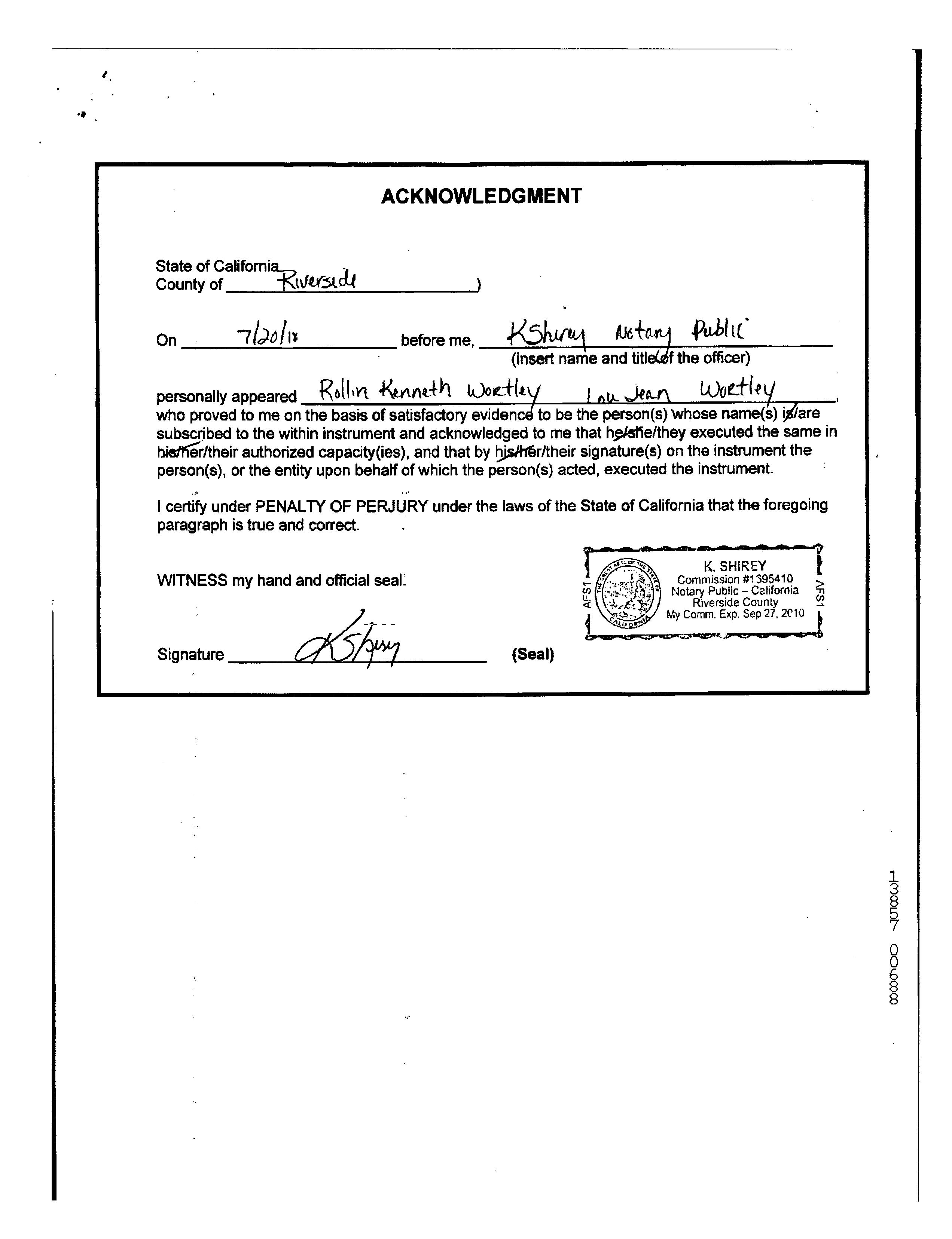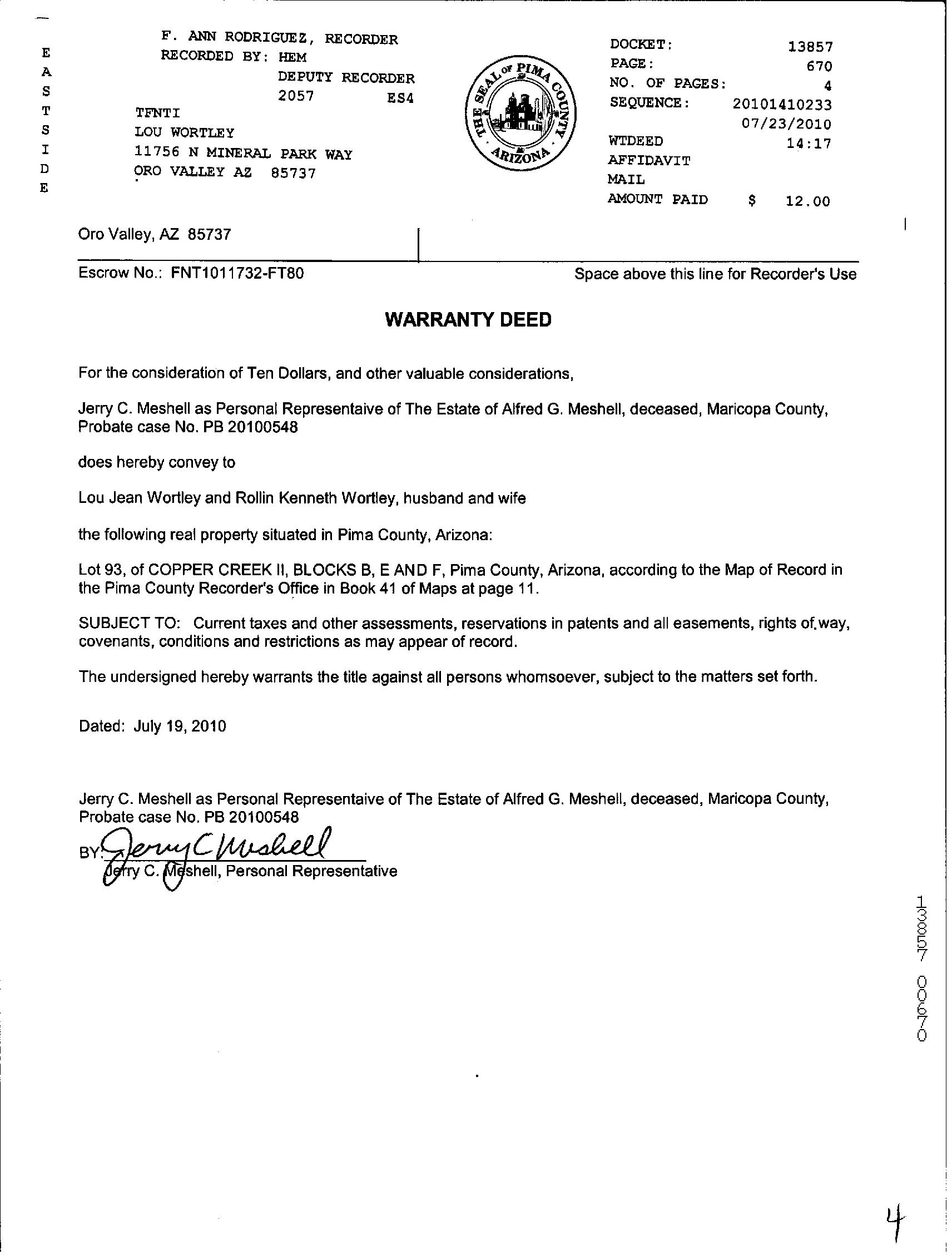 Owner Name: Wortley Rollin Kenneth /Wortley Lou Jean APN / Alternate APN: 224-05-0930 / Deed Type: Warranty Deed Land Use: Sfr Subdivision / Tract: Copper Creek 02 / Lot Size: 6,131 Year Built / Eff: 1995 / Rec. Date / Price: 07/23/2010 / $168,000 Living Area: 1,340 # of units:
