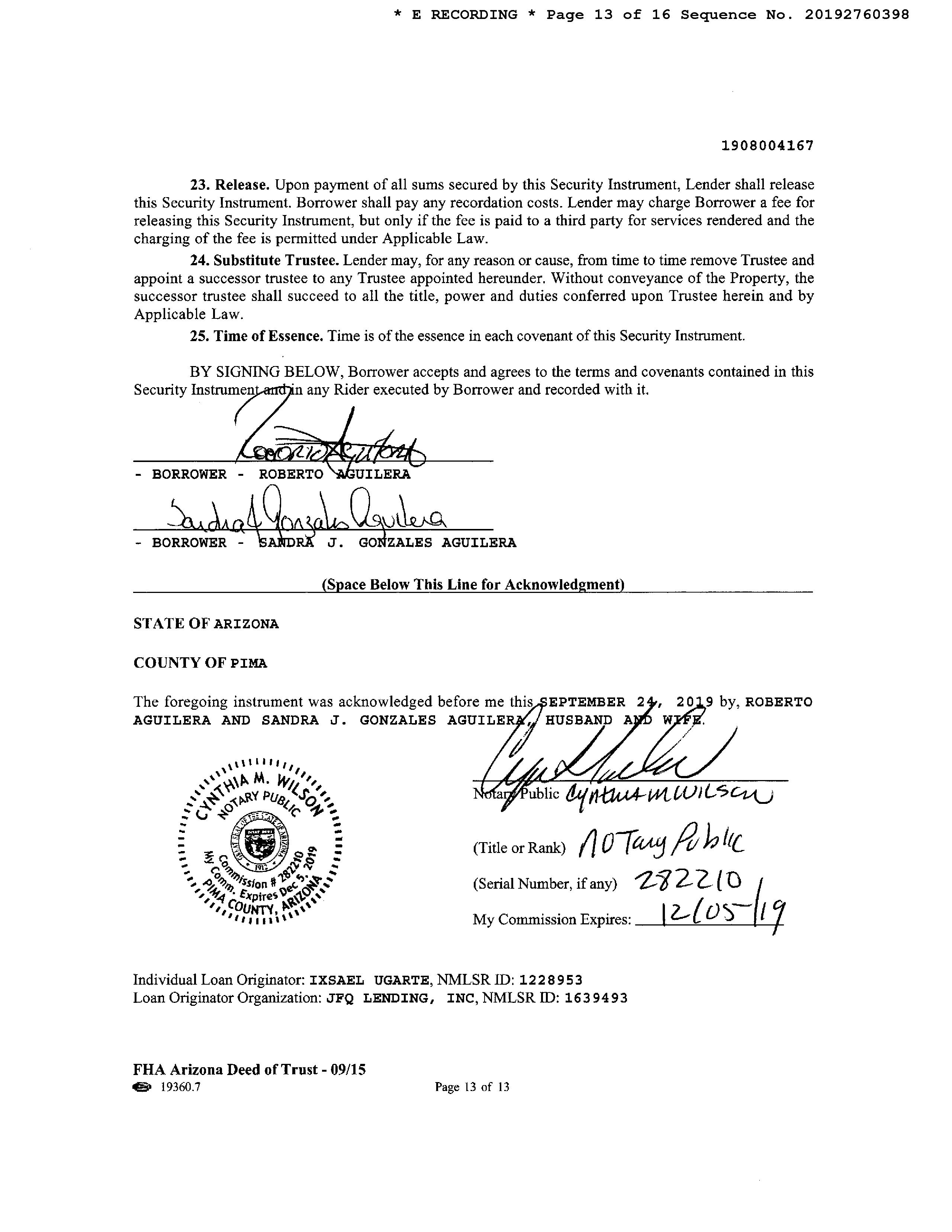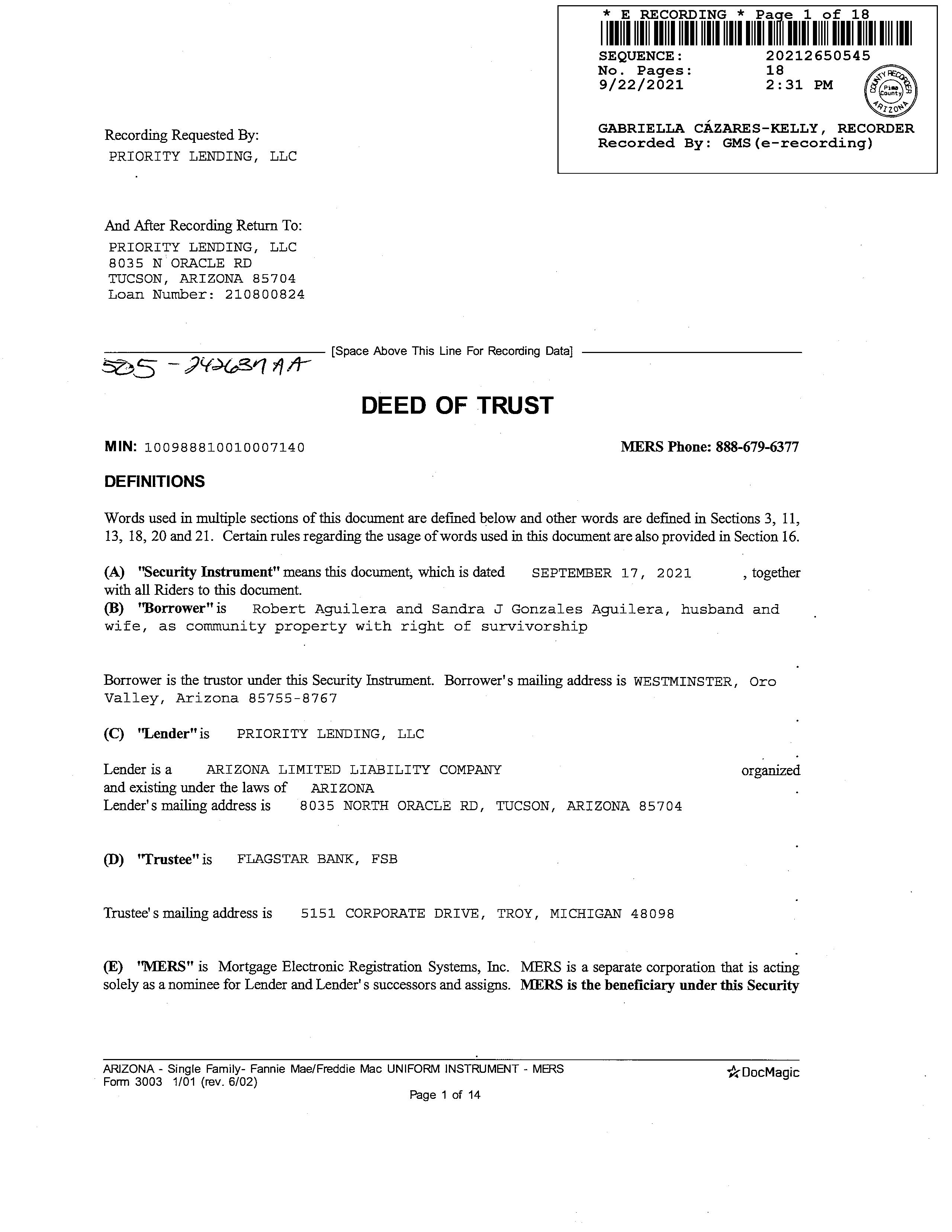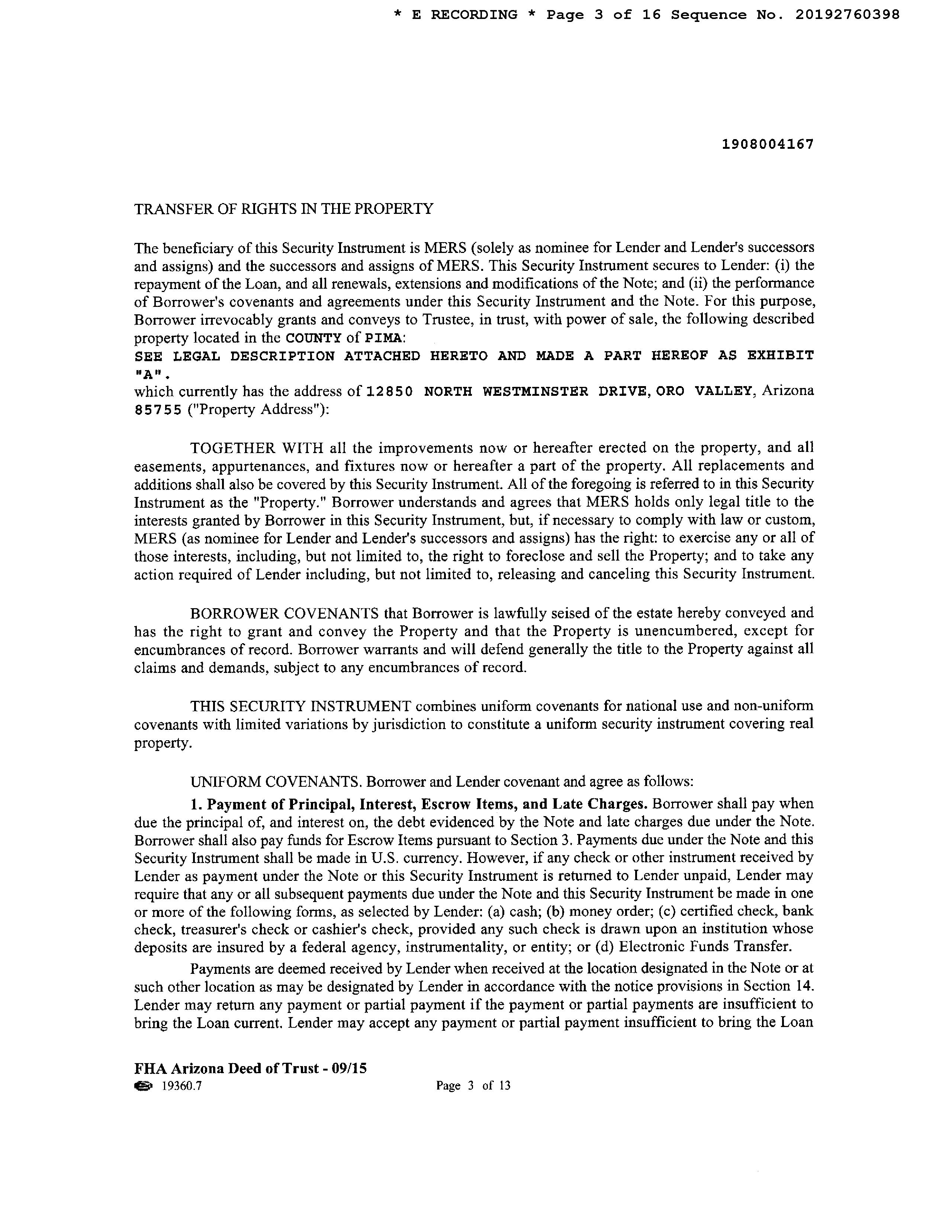 Subject Property : 12850 N Westminster Dr Oro Valley AZ 85755 Owner Information Owner Name : Aguilera Roberto / Aguilera Gonzales Sandra J Rs Mailing Address : 12850 N Westminster Dr, Oro Valley AZ 85755-8767 R139 Vesting Codes : / / Community Property Owner OccupiedIndicator : O Location Information Legal Description : Rancho Vistoso Ngbh 10 Pcl S U & V Lot 111 County : Pima, Az APN : 219-23-1920 Census Tract / Block : 46.40 / 4 Subdivision : Vistoso Rho Nbrhd 10 Pcls S U Township-Range- Sect : 11S-13E-26 Map Reference : 26-11S-13E Legal Book/Page : 60-74 School District : Amphitheater Legal Lot : 111 Munic/Township : Amphitheater Market Area : 423 Owner Transfer Information Recording/Sale Date : 10/03/2019 / 09/25/2019 Deed Type : Quit Claim Deed Document # : 2760397 1st Mtg Document # : 2760398 Last Market Sale Information Recording/Sale Date : 04/08/2016 / 04/05/2016 1st Mtg Int. Rate/Type : 9.38% / Adjustable Int Rate Loan Sale Price : $219,000 1st Mtg Document # : 990672 Document # : 990671 1st Mtg Term : 30 Deed Type : Warranty Deed Price Per SqFt : $134.11 1st Mtg Amount/Type : $175,200 / Cnv Title Company : Signature Title Agcy/az Llc Seller Name : Gray Shaun M & Hannah L Prior Sale Information Prior Rec/Sale Date : 12/18/2014 / 12/16/2014 Prior Deed Type : Warranty Deed Prior Sale Price : $202,400 Prior Lender : Access Cap Grp Prior Doc Number : 3520528 Prior 1st Mtg Amt/Type : $206,530 / Conv Customer Name : Kariann Keomaka Customer Company Name : First American Title Insurance Company Prepared On : 08/23/2022 © 2022 CoreLogic. All rights reserved