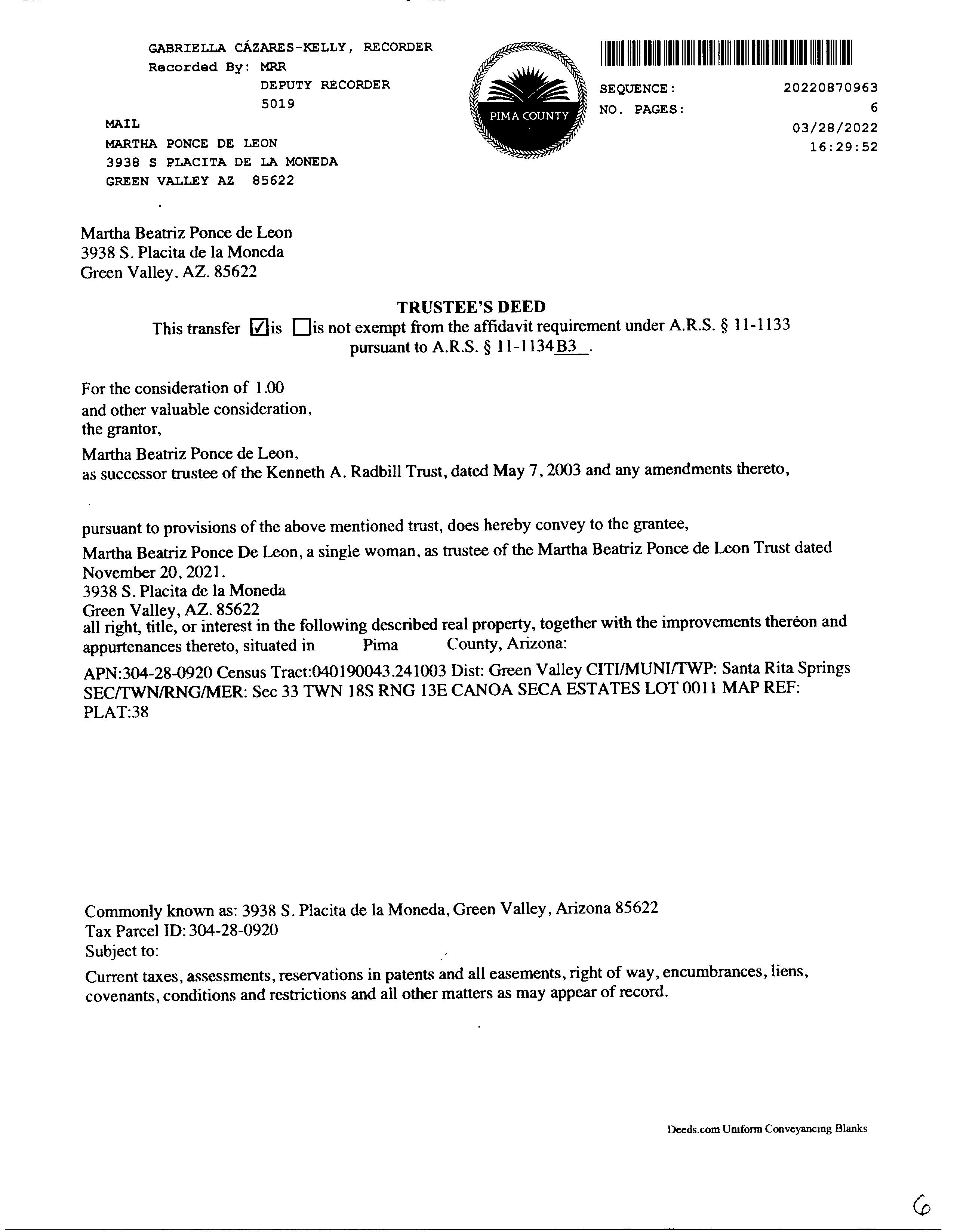 Owner Name: De Leon Martha B P Trust / APN / Alternate APN: 304-28-0920 / Deed Type: Warranty Deed Land Use: Condominium Subdivision / Tract: Canoa Seca Estates / Lot Size: 4,782 Year Built / Eff: 1989 / Rec. Date / Price: 03/29/2021 / $283,000 Living Area: 1,750 # of units: