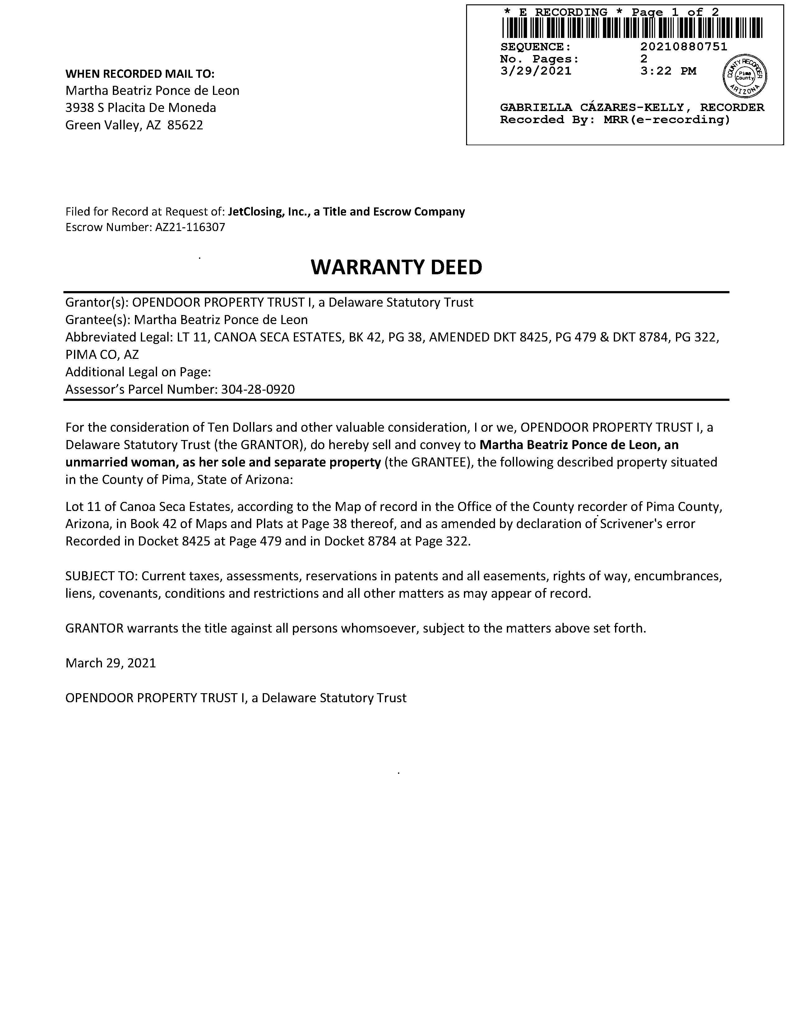 Owner Name: Opendoor Property Trust I / APN / Alternate APN: 304-28-1530 / Deed Type: Warranty Deed Land Use: Condominium Subdivision / Tract: Canoa Seca Estates / Lot Size: 4,588 Year Built / Eff: 1992 / Rec. Date / Price: 06/10/2022 / $317,200 Living Area: 1,750 # of units: