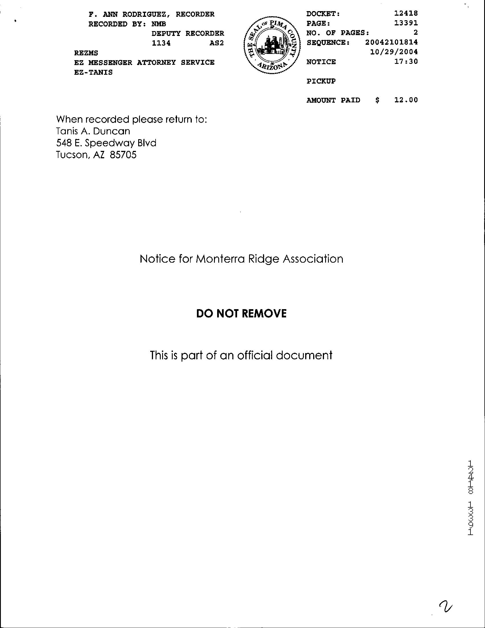 Owner Name: Wells Michael V & Michelle L /Wells Michelle L APN / Alternate APN: 219-54-0770 / Deed Type: Warranty Deed Land Use: Sfr Subdivision / Tract: Overlook/vistoso Rho Nbhrd 07 / Lot Size: 5,461 Year Built / Eff: 2001 / Rec. Date / Price: 02/18/2022 / $375,000 Living Area: 1,521
