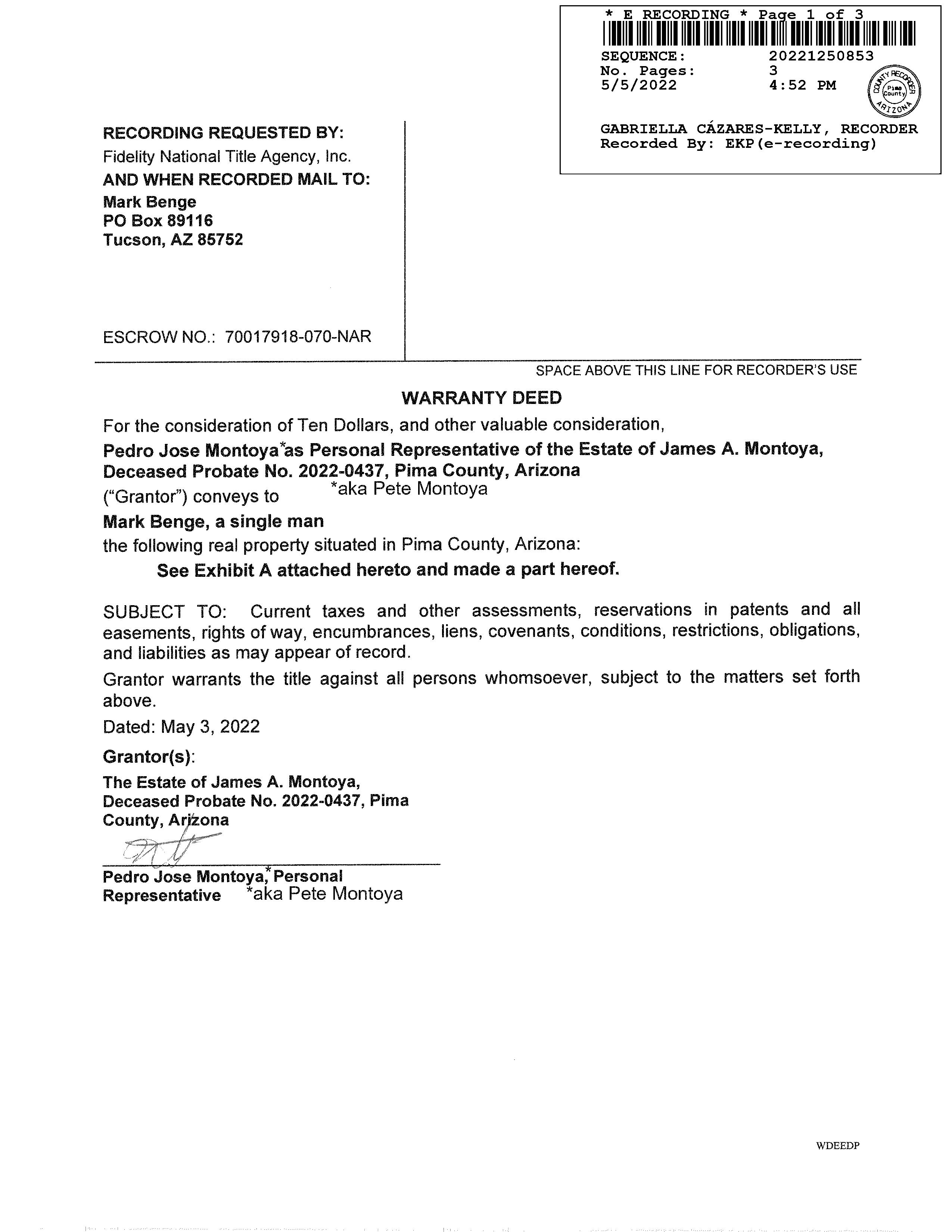 + FIRST AMERICAN TITLE, FC0, KWAL PIMA, AZ 08/29/2022 11:26AM TCI1 INVESTIGATIVE SEARCH RESULTS PAGE 1 OF 1 SEARCH PARAMETERS PARCEL: 140-13-2160 PARCEL: 140-13-2160 INSTRUMENT REC DATE OWNER: BENGE MARK AFFIDAVIT 2022 853 05/05/2022 SITUS: 5150 S JASMINE WAY TUCSON MAIL: PO BOX 89116 PLAT: LOT 00213 BLOCK 0 LEGAL: DESERT SHADOWS LOT 213 CURRENT TAXES INFORMATION THROUGH 07/28/2022 LAND IMPR EXEMPT RATE AREA SPECIAL DISTRICTS PRIMARY 10,731 0 0 9.6927 1250 SECONDARY 50 13,467 0 3.4043 2021 TOTAL TAX BILLED 1,226.21 2021 TAX AMT TAX DUE INTEREST DATE PAID TOTAL DUE FIRST HALF 613.11 0.00 0.00 10/04/2021 0.00 SECOND HALF 613.10 0.00 0.00 03/07/2022 0.00 TOTAL CURRENT TAXES DUE 08/22 0.00 09/22 0.00 IMPROVEMENTS RESIDENTIAL PHYSICAL CONDITION BELOW AVE BLDG SQFT 1,546 FULL CASH VALUE 135,167 YEAR BUILT 1978 LAND USE 01 31 NUMBER OF STORIES 1.0 LOT SIZE 1 STDLT STORIES HEIGHT 0 SCHOOL DISTRICT 1250 EXTERIOR WALLS SLUMP BLOCK LAND FULL CASH VALUE 502 GRADE MATERIALS IMPR FULL CASH VALUE 134,665 SALES SALE DATE SALE AMOUNT INSTRUMENT TYPE SELLER NAME VALIDITY 05/05/2022 221,750 2022 853 WD MONTOYA PEDRO JOSE ADDITIONAL PROPERTY INFORMATION STANDARD LAND USE: SFR END SEARCH