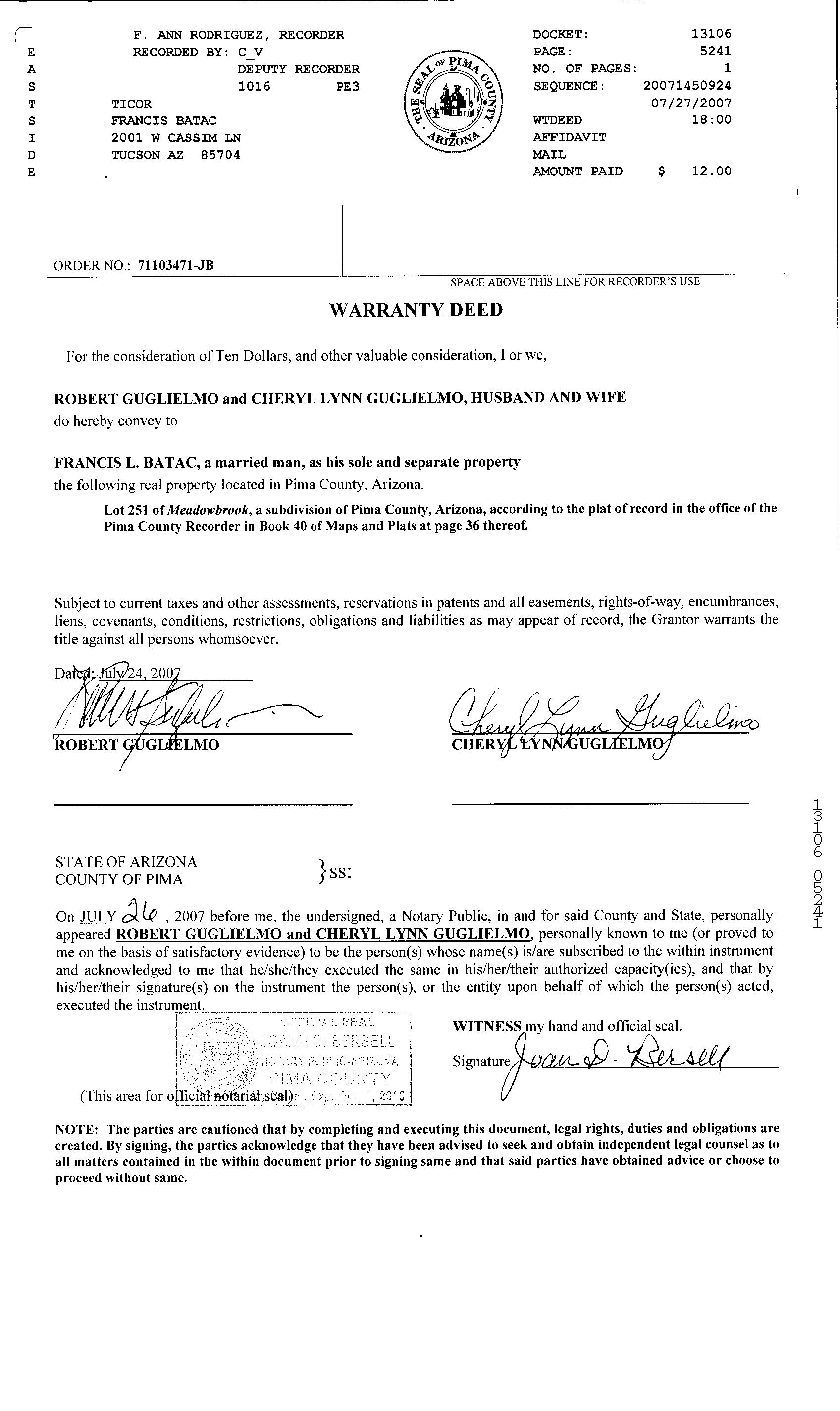 Owner Name: Batac Francis L / APN / Alternate APN: 101-11-2780 / Deed Type: Warranty Deed Land Use: Sfr Subdivision / Tract: Meadowbrook / Lot Size: 7,644 Year Built / Eff: 1987 / Rec. Date / Price: 07/27/2007 / $150,000 Living Area: 1,066 # of units: Document #: 13106-5241 Bedrooms: Pool: Total Tax Value: $130,474 Bath(F/H): /