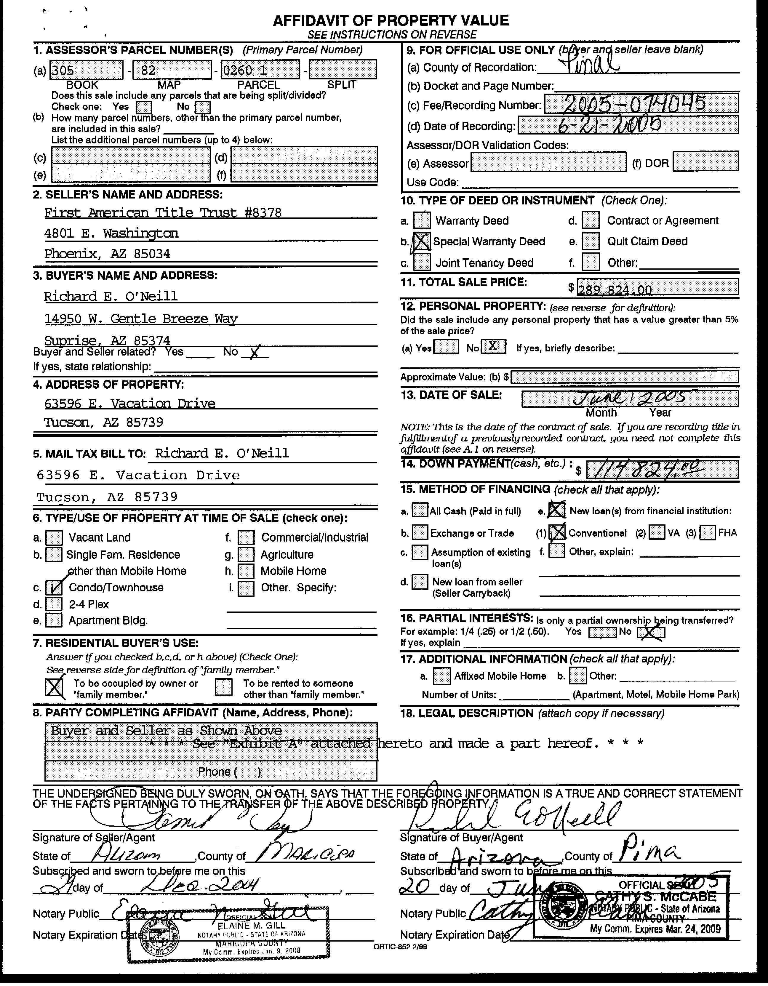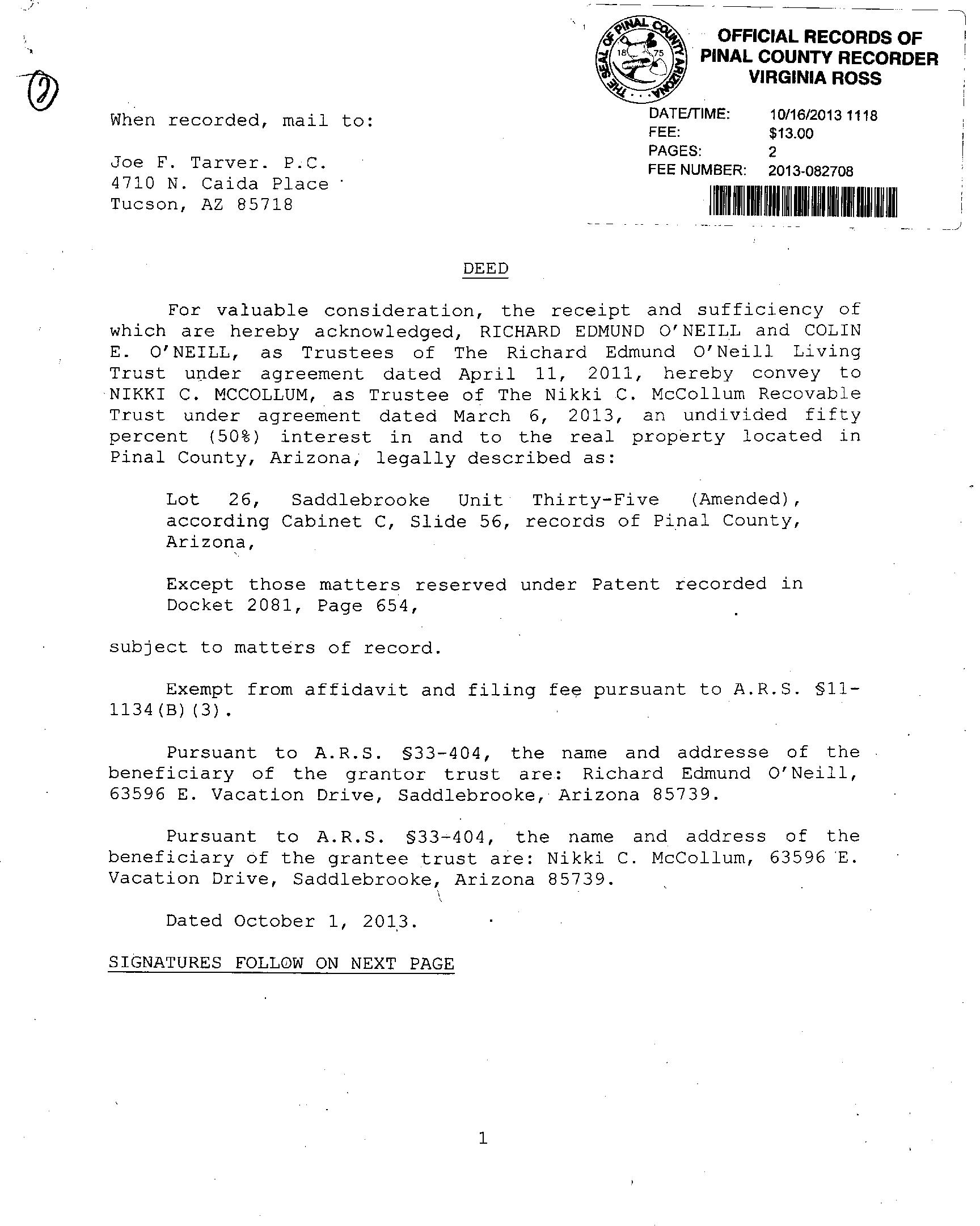 Owner Name: O Neill Richard Edmund (te) /O Neill Colin E (te) APN / Alternate APN: 305-82-026 / Deed Type: Special Warranty Deed Land Use: Condominium Subdivision / Tract: Saddlebrooke 35 Amd / Lot Size: 4,246 Year Built / Eff: 2005 /