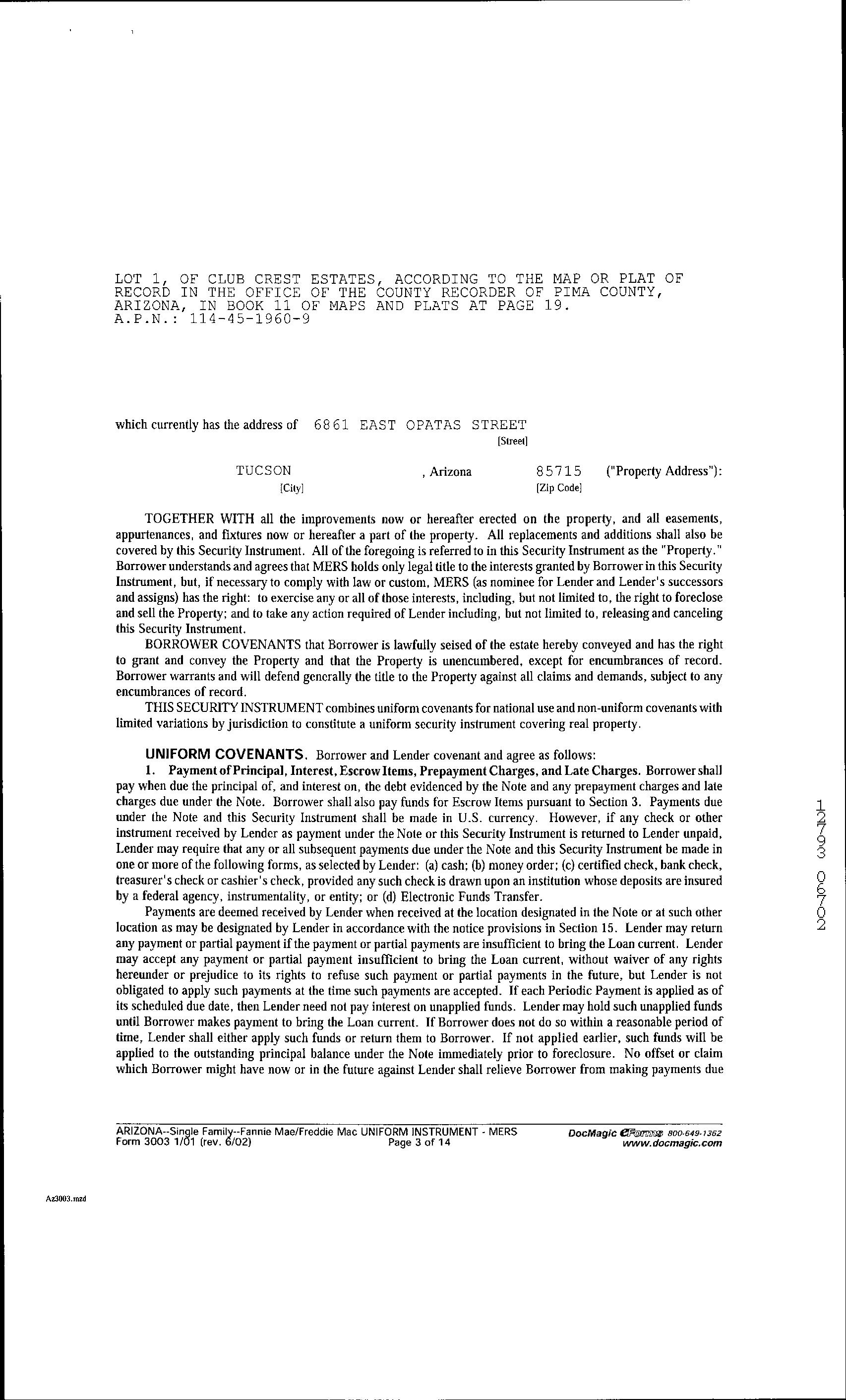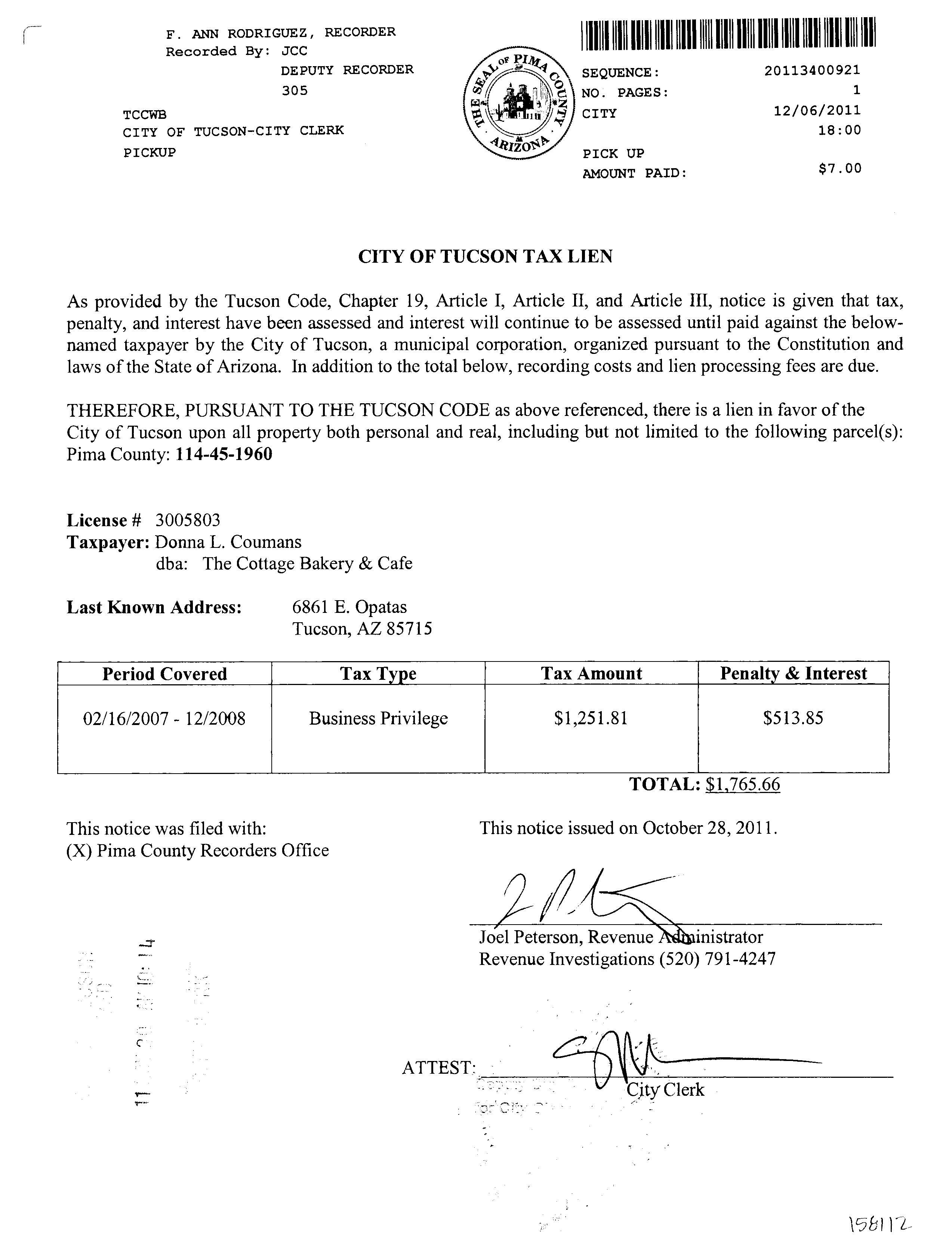 Mailing Address : 6861 E Opatas St, Tucson AZ 85715-3339 C035