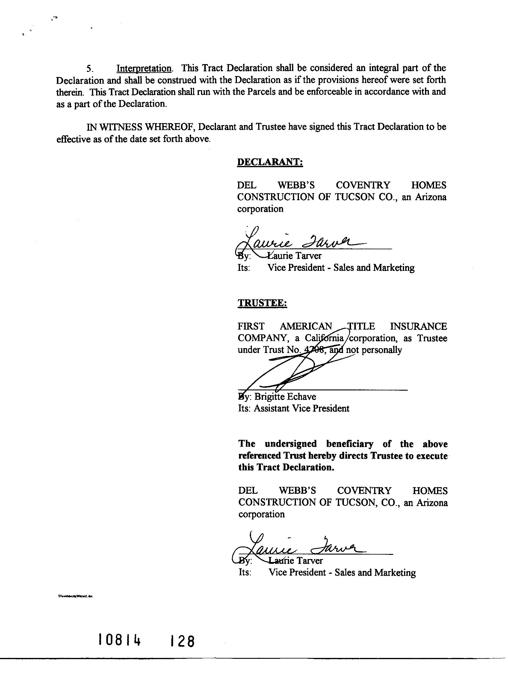 ConditionsCovenants,&Restrictions Thank you for the opportunity to be of service. Restrictions indicating a preference, limitation or discrimination based on race, color, religion, sex, handicap, familial status, or national origin are hereby deleted to the extent such restrictions violate 42 USC 3604(c). This information is furnished without fee and without benefit of a complete title search. No liability is assumed by First American Title or Title Security. If it is desired that liability be assumed, you may apply for a policy of title insurance with First American Title Insurance Company.