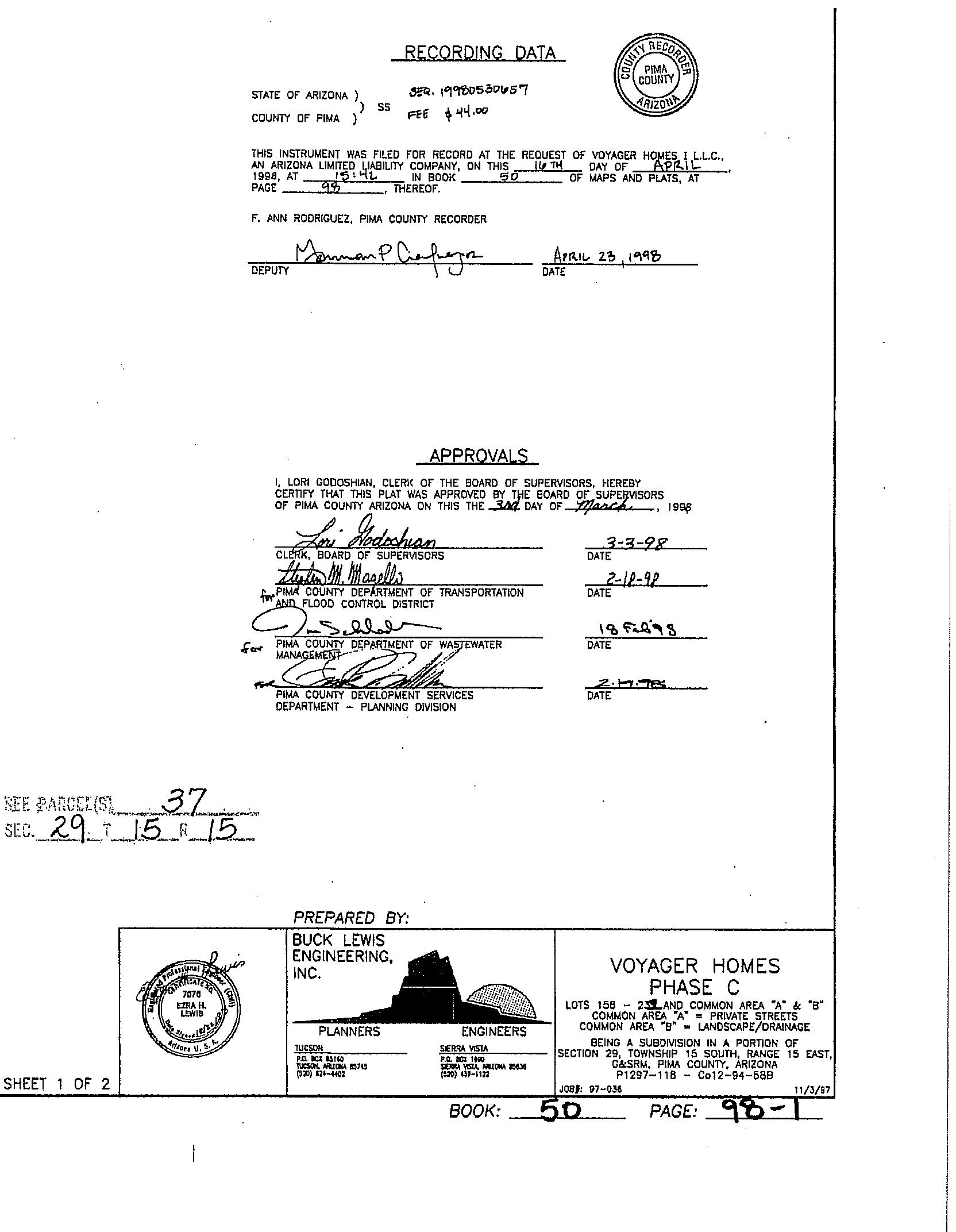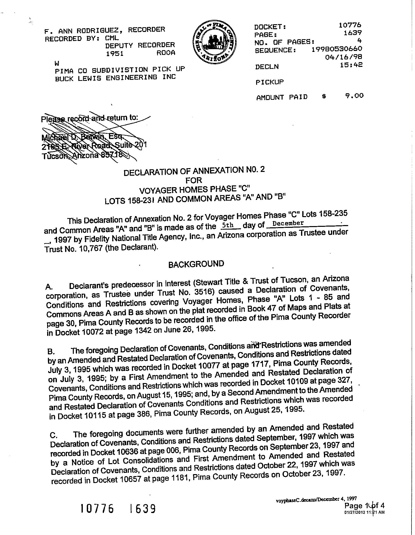 + FIRST AMERICAN TITLE, FC0, KWAL PIMA, AZ 08/22/2022 01:53PM TCI1 INVESTIGATIVE SEARCH RESULTS PAGE 1 OF 1 SEARCH PARAMETERS PARCEL: 141-23-1800 PARCEL: 141-23-1800 INSTRUMENT REC DATE OWNER: ALVERSON LIVING TR 12446 3536 12/10/2004 SITUS: 7415 E MARITIME DR PC MAIL: ATTN: RICHARD C & MARGUERITE I ALVERSON TR TUCSON AZ 85706 PLAT: LOT 00173 BLOCK LEGAL: VOYAGER HOMES - PHASE C LOT 173 CURRENT TAXES INFORMATION THROUGH 07/28/2022 LAND IMPR EXEMPT RATE AREA SPECIAL DISTRICTS PRIMARY 17,300 0 0 9.6792 2003 SECONDARY 50 18,567 0 4.5947 2021 TOTAL TAX BILLED 2,204.17 2021 TAX AMT TAX DUE INTEREST DATE PAID TOTAL DUE FIRST HALF 1,102.09 0.00 0.00 10/22/2021 0.00 SECOND HALF 1,102.08 0.00 0.00 02/09/2022 0.00 TOTAL CURRENT TAXES DUE 08/22 0.00 09/22 0.00 IMPROVEMENTS RESIDENTIAL BLDG SQFT 1,289 FULL CASH VALUE 186,170 YEAR BUILT 2001 LAND USE 07 37 NUMBER OF STORIES 4.0 LOT SIZE 1 STDLT STORIES HEIGHT 0 SCHOOL DISTRICT 2003 EXTERIOR WALLS FRAME WOOD LAND FULL CASH VALUE 502 GRADE MATERIALS IMPR FULL CASH VALUE 185,668 SALES SALE DATE SALE AMOUNT INSTRUMENT TYPE SELLER NAME VALIDITY 12/10/2004 182,500 12446 3536 WD WILDER JANE 04/17/2001 142,835 11529 517 SD FIDELITY NATIONAL TITLE AG ADDITIONAL PROPERTY INFORMATION STANDARD LAND USE: CONDOMINIUM END SEARCH