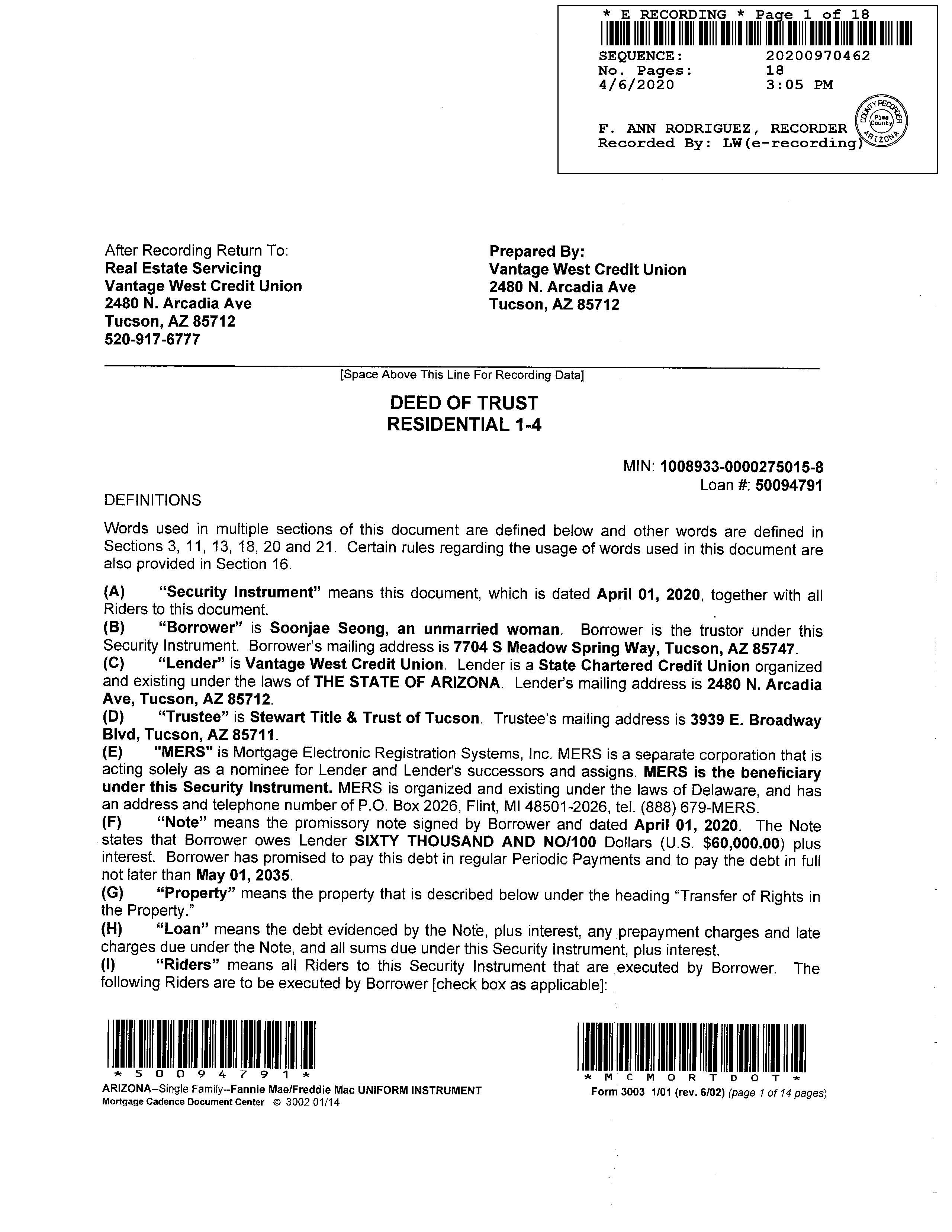 Subject Property : 7704 S Meadow Spring Way Tucson AZ 85747 Owner Information Owner Name : Seong Soonjae Mailing Address : 7704 S Meadow Spring Way, Tucson AZ 85747-5654 R098 Owner OccupiedIndicator : O Location Information Legal Description : Rincon Vista At Rita Ranch Lot 0126 County : Pima, Az APN : 141-11-1570 Census Tract / Block : 40.73 / 2 Subdivision : Rincon Vista At Rita Ranch Township-Range- Sect : 15S-15E-22 Map Reference : 22-15S-15E Legal Book/Page : 51-57 School District : Vail Legal Lot : 126 Munic/Township : Vail Market Area : 612 Last Market Sale Information Recording/Sale Date : 05/27/2015 / 05/21/2015 1st Mtg Amount/Type : $123,200 / Cnv Sale Price : $154,000 1st Mtg Document # : 1470263 Document # : 1470262 1st Mtg Term : 30 Deed Type : Warranty Deed Price Per SqFt : $100.13 Title Company : Long Title Agcy Inc Lender : Nova Fin'l & Inv Corp Seller Name : Sabin David W Prior Sale Information Prior Rec/Sale Date : 05/22/2008 / 05/20/2008 Prior Deed Type : Warranty Deed Prior Sale Price : $186,500 Prior Lender : Homecomings Fin'l Llc Prior Doc Number : 13312-2580 Prior 1st Mtg Amt/Type : $177,175 / Conv Customer Name : Kariann Keomaka Customer Company Name : First American Title Insurance Company Prepared On : 08/12/2022 © 2022 CoreLogic. All rights reserved