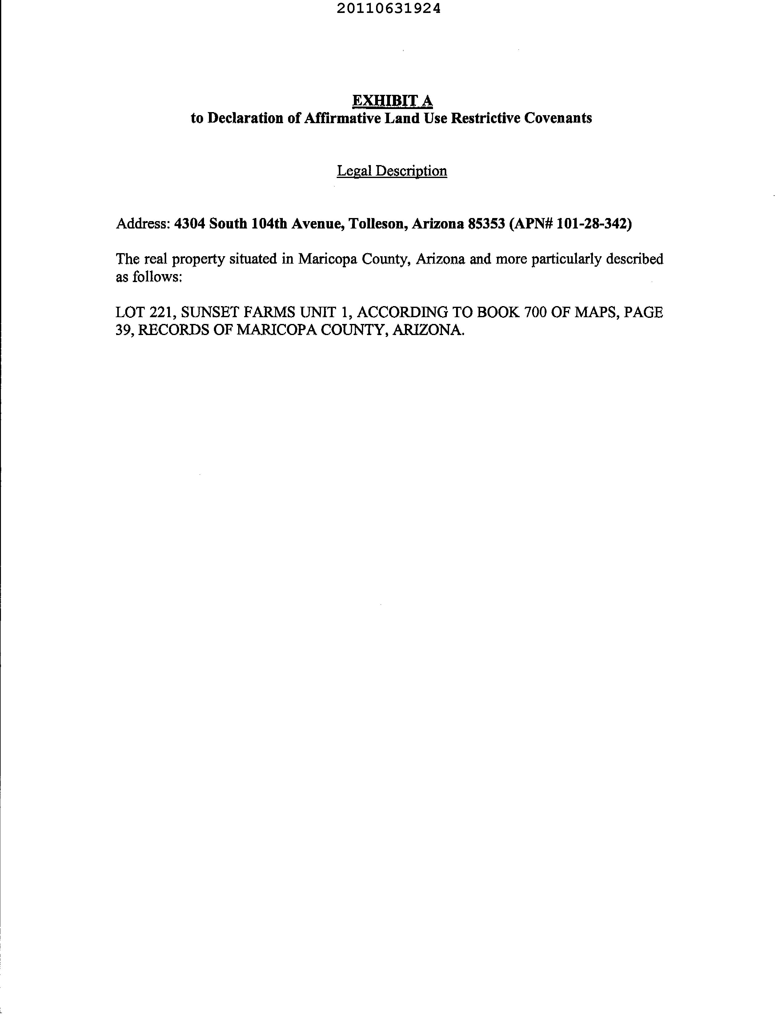 ©2021 First American Financial Corporation and/or its affiliates. All rights reserved. NYSE: FAF 05252610821 COVENANTS, CONDITIONS & RESTRICTIONS PREPARED FOR : First American Title Insurance Company, and the operating divisions thereof, make no express or implied warranty respecting the information presented and assume no responsibility for errors or omissions. First American, the eagle logo, First American Title, and firstam.com are registered trademarks or trademarks of First American Financial Corporation and/or its affiliates. 10354 W. Southgate Tolleson, AZ 85353