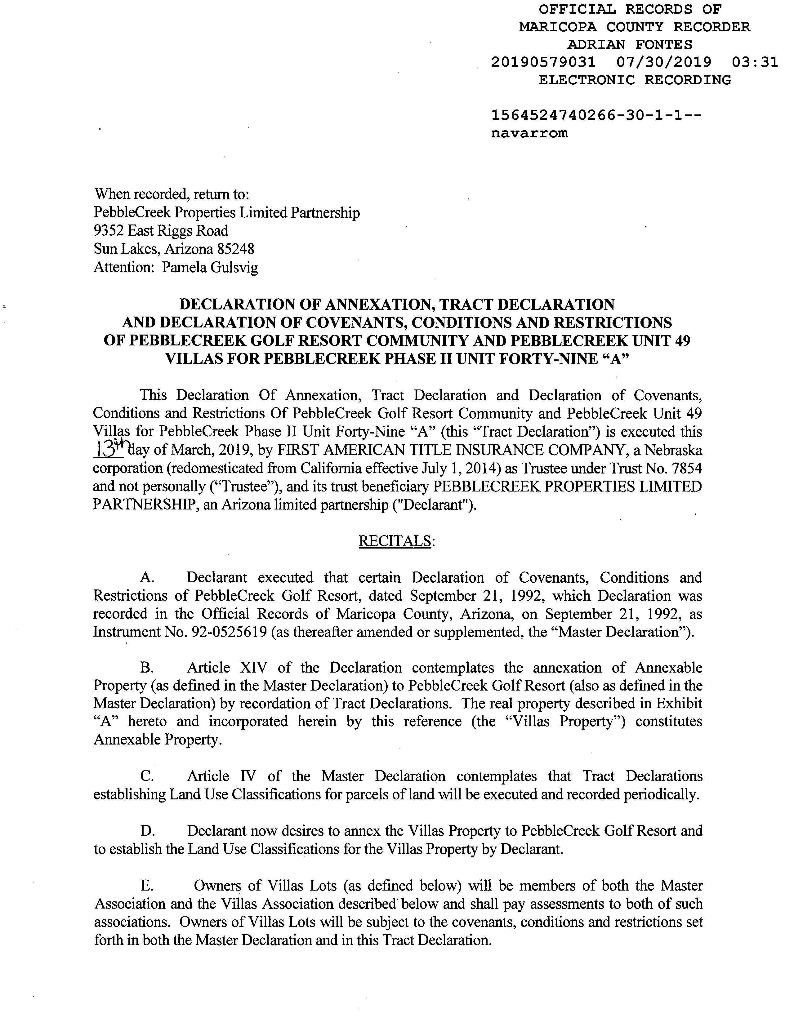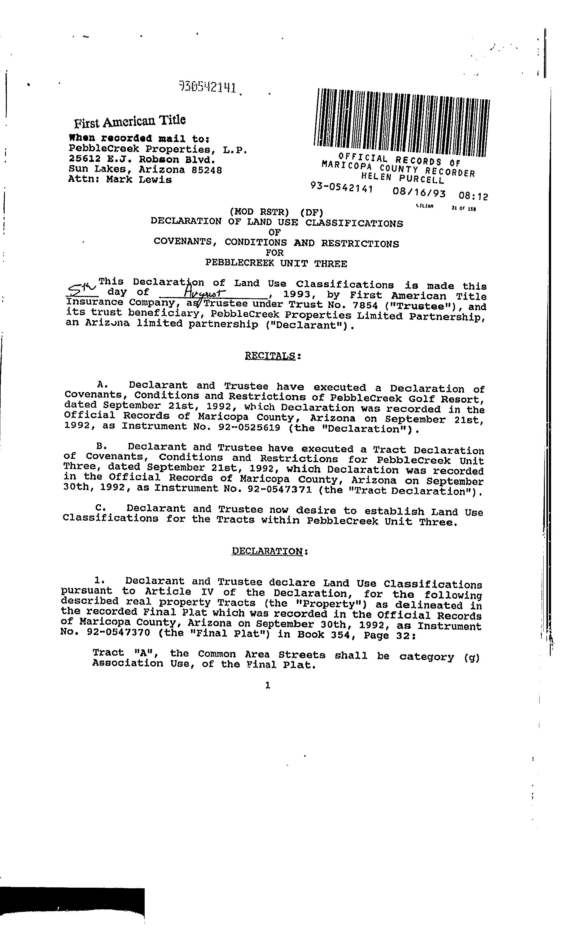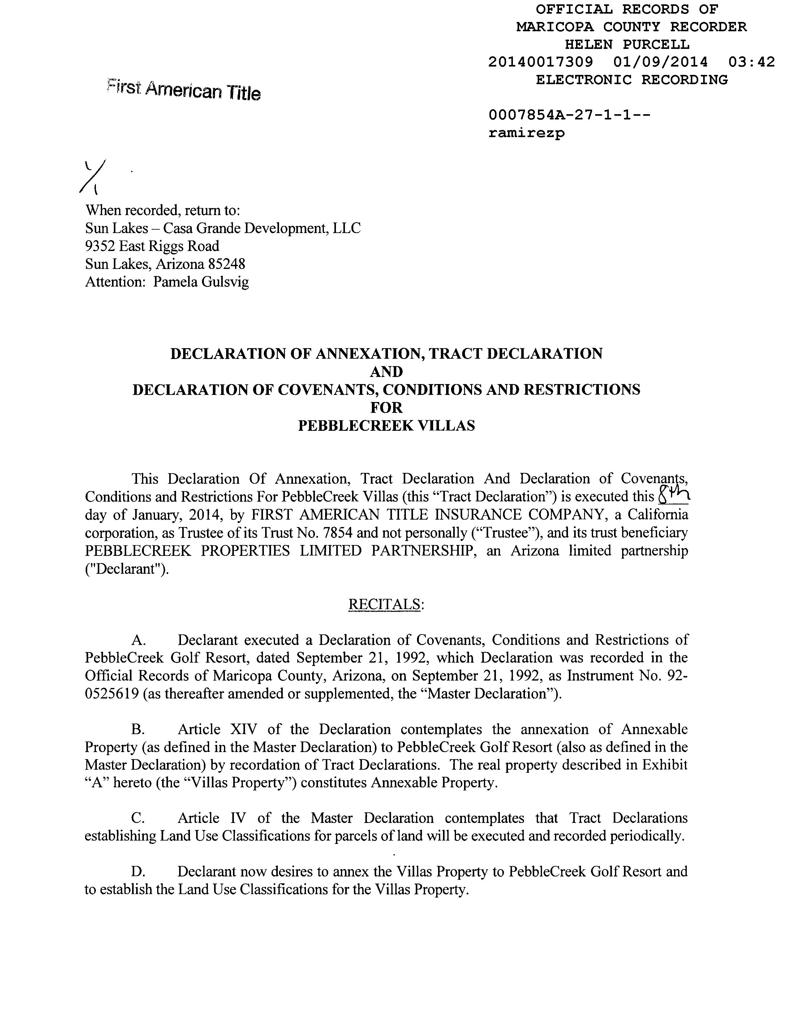 ©2021 First American Financial Corporation and/or its affiliates. All rights reserved. NYSE: FAF 05252610821 COVENANTS, CONDITIONS & RESTRICTIONS PREPARED FOR : First American Title Insurance Company, and the operating divisions thereof, make no express or implied warranty respecting the information presented and assume no responsibility for errors or omissions. First American, the eagle logo, First American Title, and firstam.com are registered trademarks or trademarks of First American Financial Corporation and/or its affiliates. 3819 N. 154th Lane Goodyear, AZ 85395