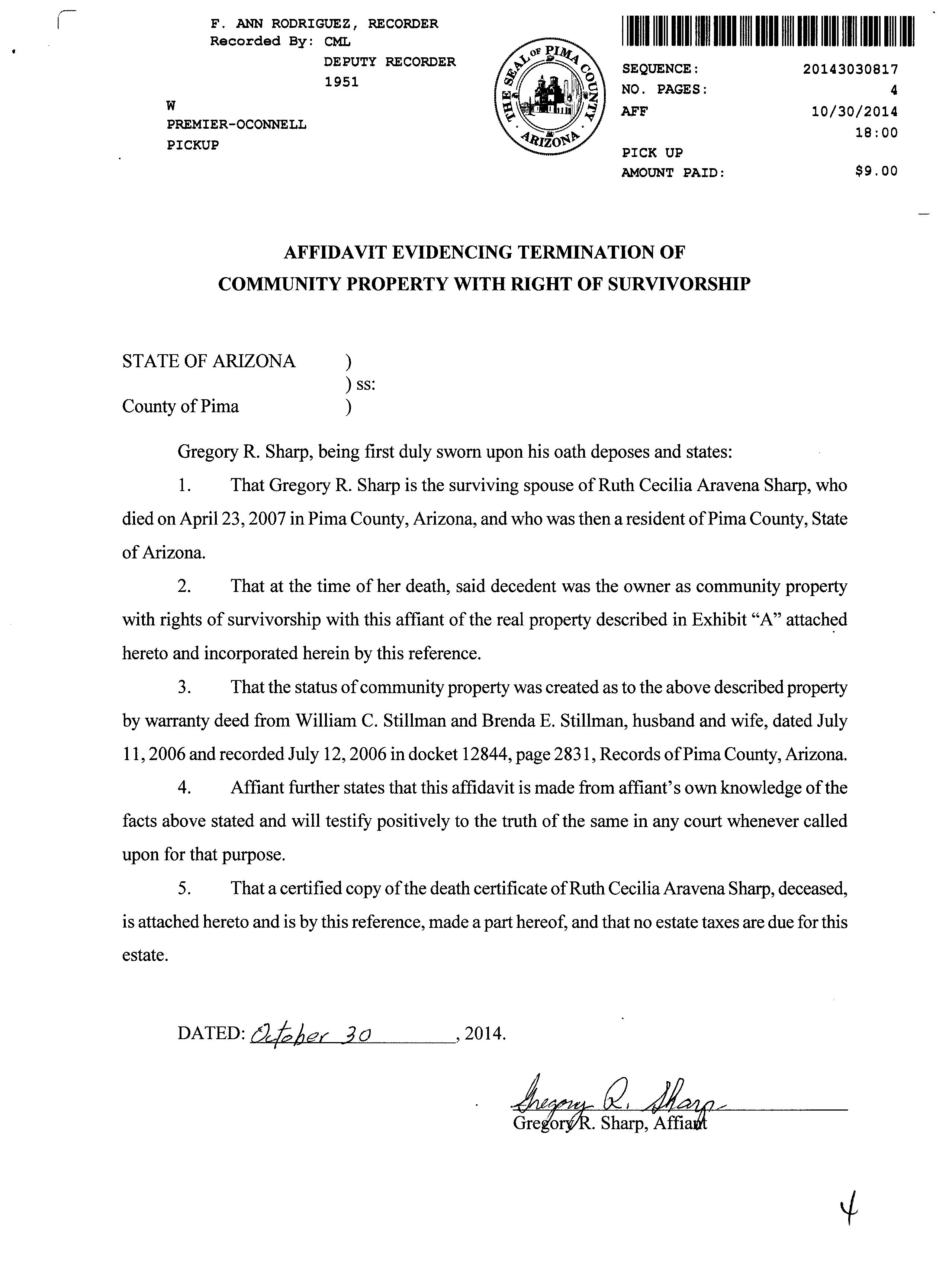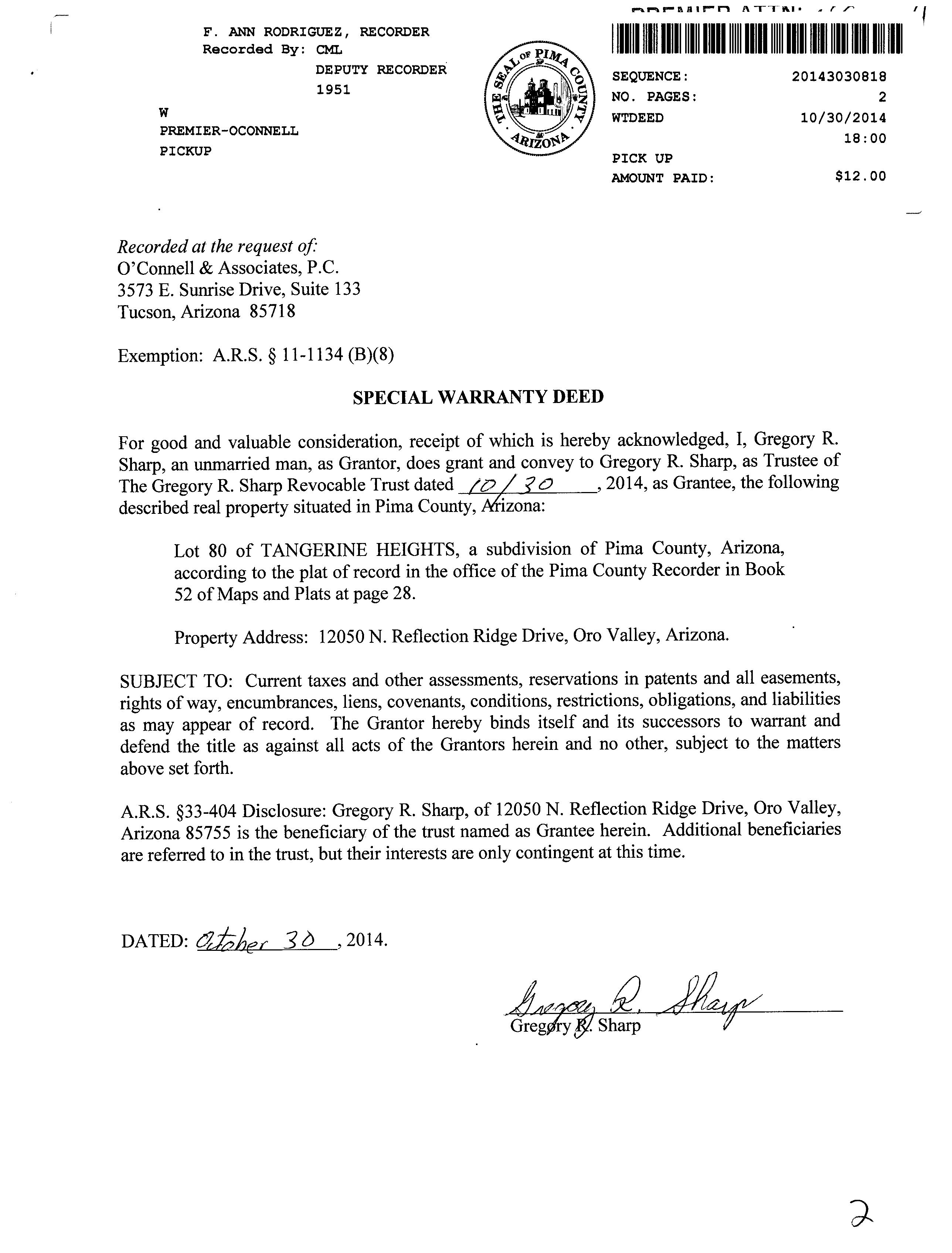 Subject Property : 12050 N Reflection Ridge Dr Oro Valley AZ 85755 Owner Information Owner Name : Sharp Gregory R Mailing Address : 12050 N Reflection Ridge Dr, Oro Valley AZ 85755-0837 R138 Vesting Codes : / / Revocable Trust Owner OccupiedIndicator : O Location Information Legal Description : Tangerine Heights Lot 0080 County : Pima, Az APN : 219-51-0870 Census Tract / Block : 46.41 / 1 Subdivision : Tangerine Heights Township-Range- Sect : 11S-13E-35 Map Reference : 35-11S-13E Legal Book/Page : 52-28 School District : Amphitheater Legal Lot : 80 Munic/Township : Amphitheater Market Area : 423 Owner Transfer Information Recording/Sale Date : 10/30/2014 / 10/30/2014 Deed Type : Special Warranty Deed Document # : 3030818 Last Market Sale Information Recording/Sale Date : 07/12/2006 / 07/10/2006 1st Mtg Amount/Type : $365,000 / Cnv Sale Price : $765,000 1st Mtg Document # : 12844-2834 Document # : 12844-2831 1st Mtg Term : 30 Deed Type : Warranty Deed Price Per SqFt : $248.70 Title Company : Catalina Title Lender : Franklin American Mtg Co Seller Name : Stillman William C & Brenda E Prior Sale Information Prior Rec/Sale Date : 08/15/2002 / 08/00/2002 Prior Doc Number : 11864-3959 Prior Sale Price : $424,000 Prior Deed Type : Warranty Deed Customer Name : Chantel Cortez Customer Company Name : FIRST AMERICAN TITLE Prepared On : 08/23/2022 © 2022 CoreLogic. All rights reserved