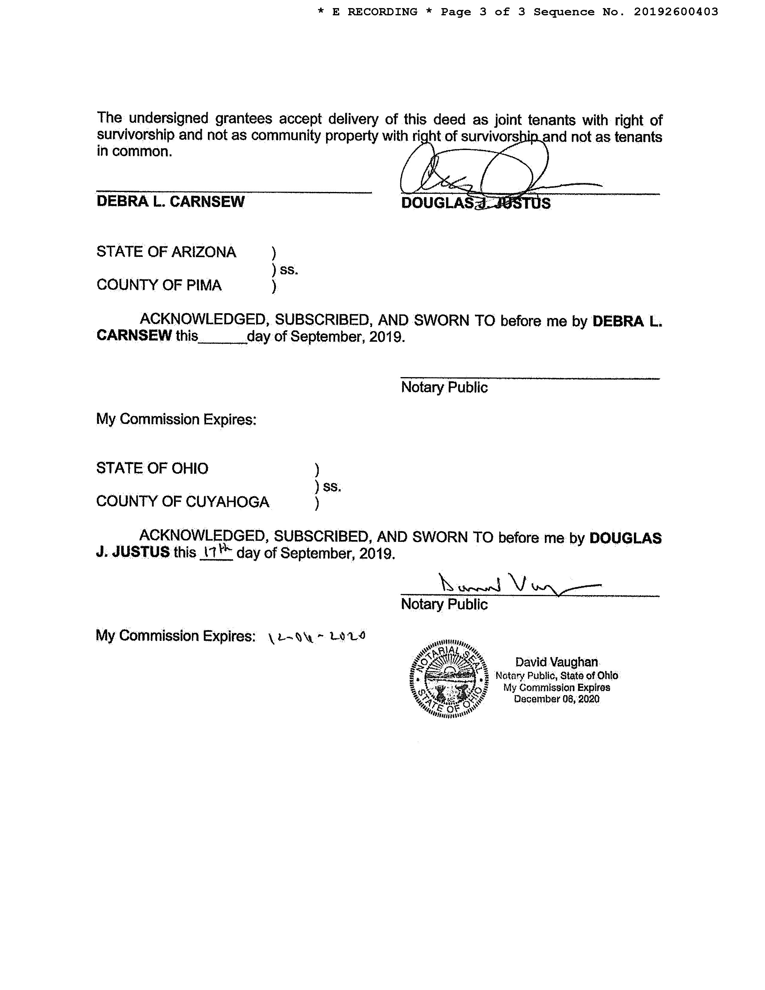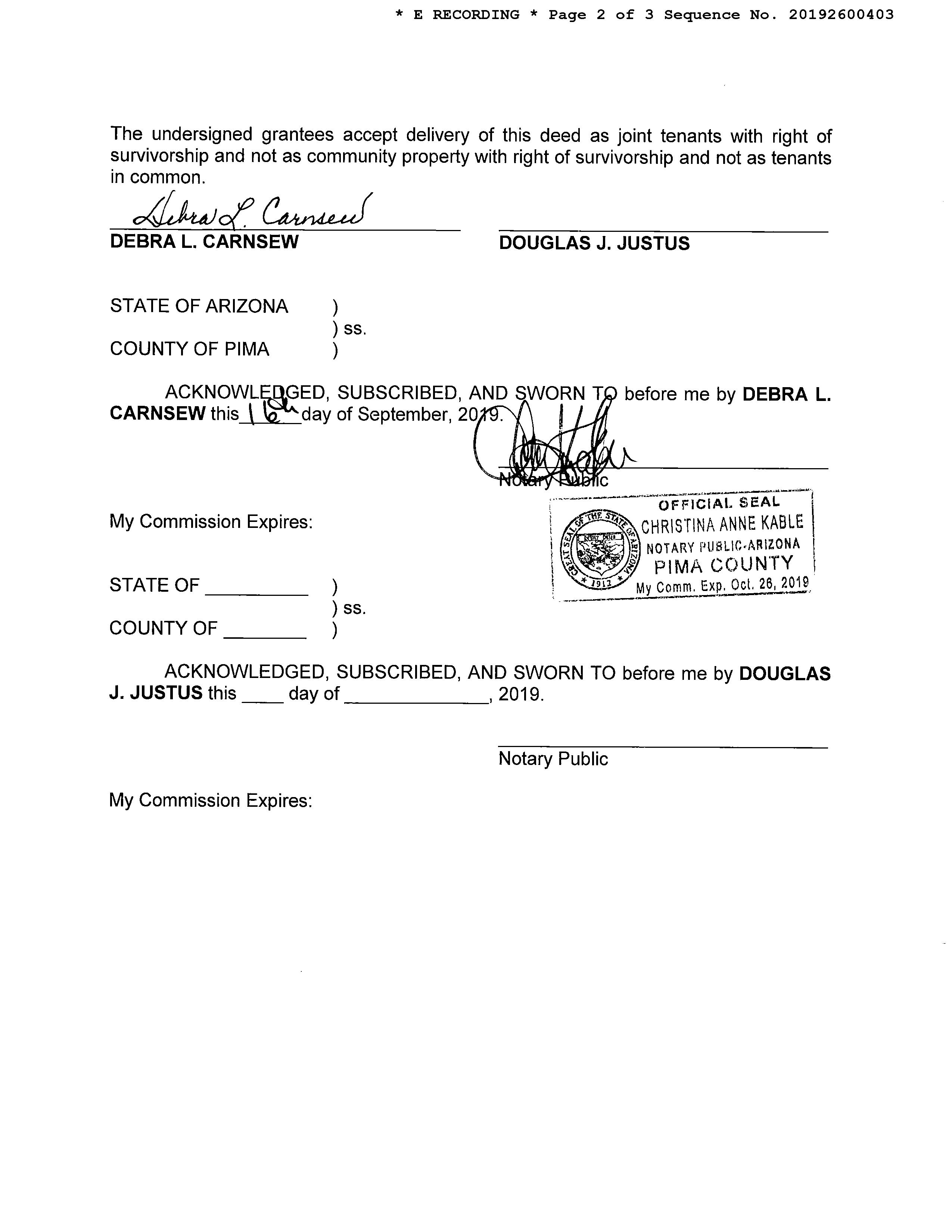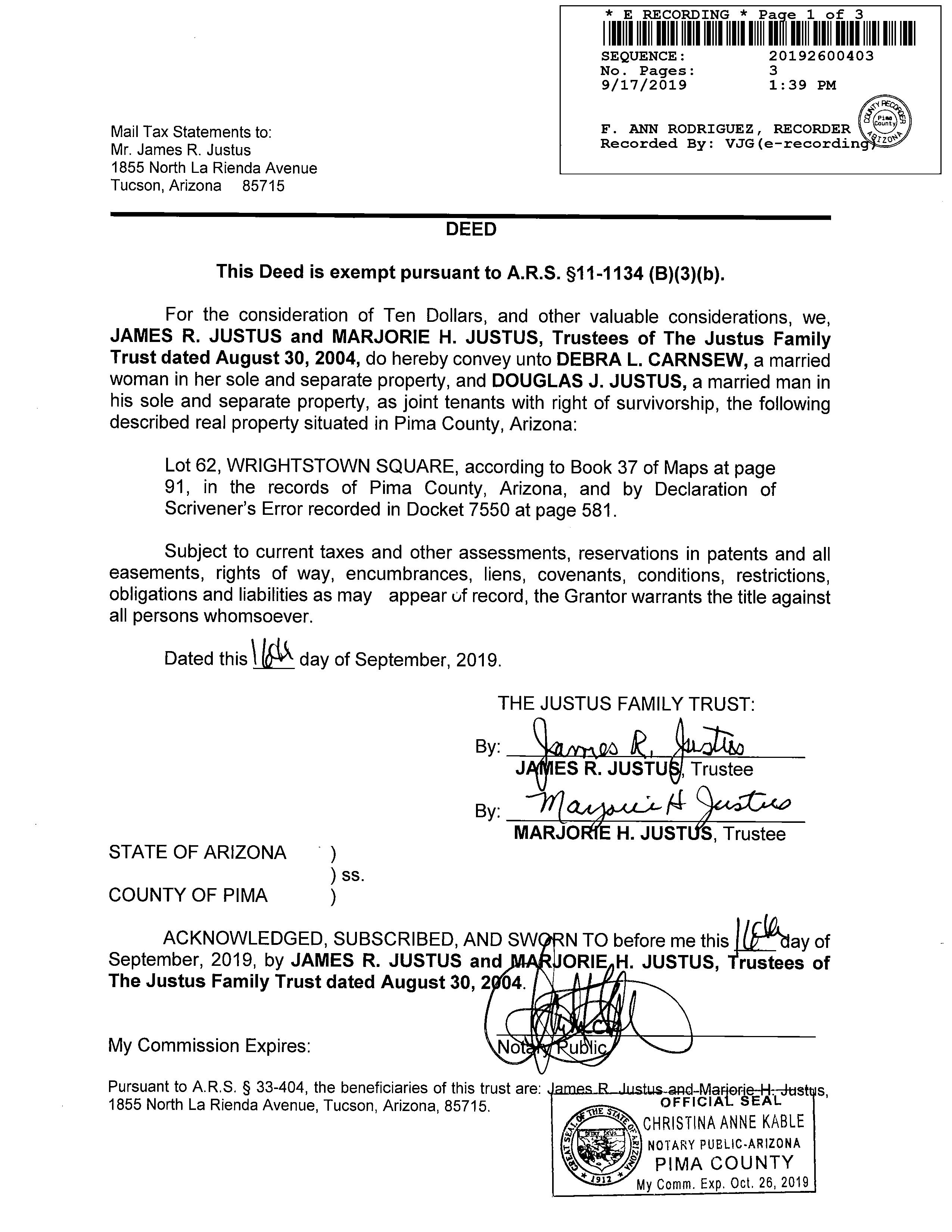Subject Property : 1855 N La Rienda Ave Tucson AZ 85715 Owner Information Owner Name : Carnsew Debra L / Justus Douglas J Mailing Address : 1855 N La Rienda Ave, Tucson AZ 85715-6805 C036 Vesting Codes : / / Joint Tenants Owner OccupiedIndicator : O Location Information Legal Description : Wrightstown Square Lot 62 County : Pima, Az APN : 133-07-2060 Census Tract / Block : 40.46 / 3 Subdivision : Wrightstown Square Township-Range- Sect : 14S-15E-4 Map Reference : 04-14S-15E Legal Book/Page : 37-91 School District : Tucson Unified Legal Lot : 62 Munic/Township : Tucson Unified Market Area : 91 Owner Transfer Information Recording/Sale Date : 09/17/2019 / 09/16/2019 Deed Type : Deed (reg) Document # : 2600403 Last Market Sale Information Recording/Sale Date : 03/20/1991 / 03/20/1991 Deed Type : Joint Tenancy Deed Sale Price : $76,893 Price Per SqFt : $68.47 Document # : 8999-1248 Prior Sale Information Prior Rec/Sale Date : / 03/00/1991 Prior Doc Number : 8999-1247 Prior Sale Price : $76,893 Prior Deed Type : Special Warranty Deed Property Characteristics Gross Area : 1,123 Capacity :Garage 2 Patio Type : Covered Patio Living Area : 1,123 Roof Material : Tile Air Cond : Refrigeration Year Built / Eff : 1991 Heat Type : Forced Air Quality : Fair # of Stories : 1 Cooling Type : Forced Air Condition : Excellent Parking Type : Garage Exterior wall : Frame Wood Bath Fixtures : 6 Customer Name : Chantel Cortez Customer Company Name : FIRST AMERICAN TITLE Prepared On : 08/12/2022 © 2022 CoreLogic. All rights reserved
