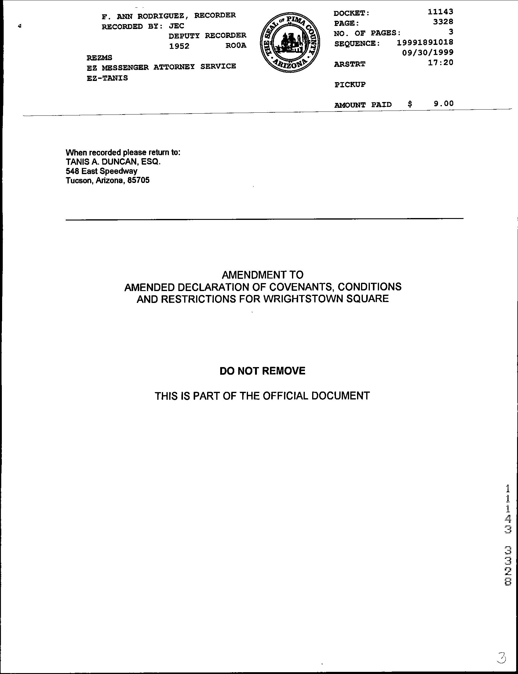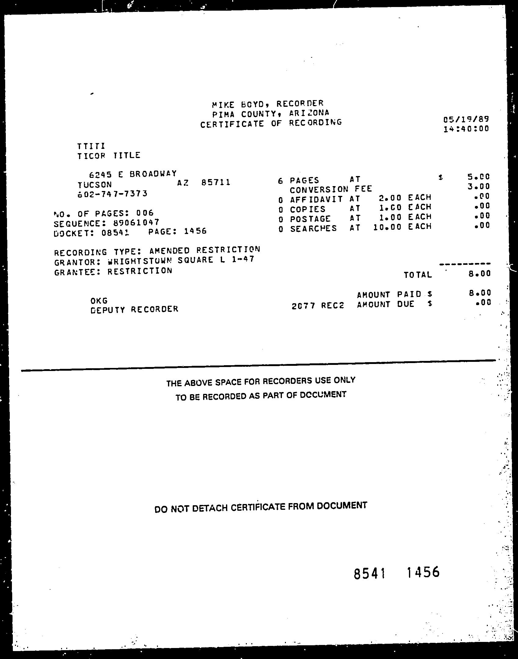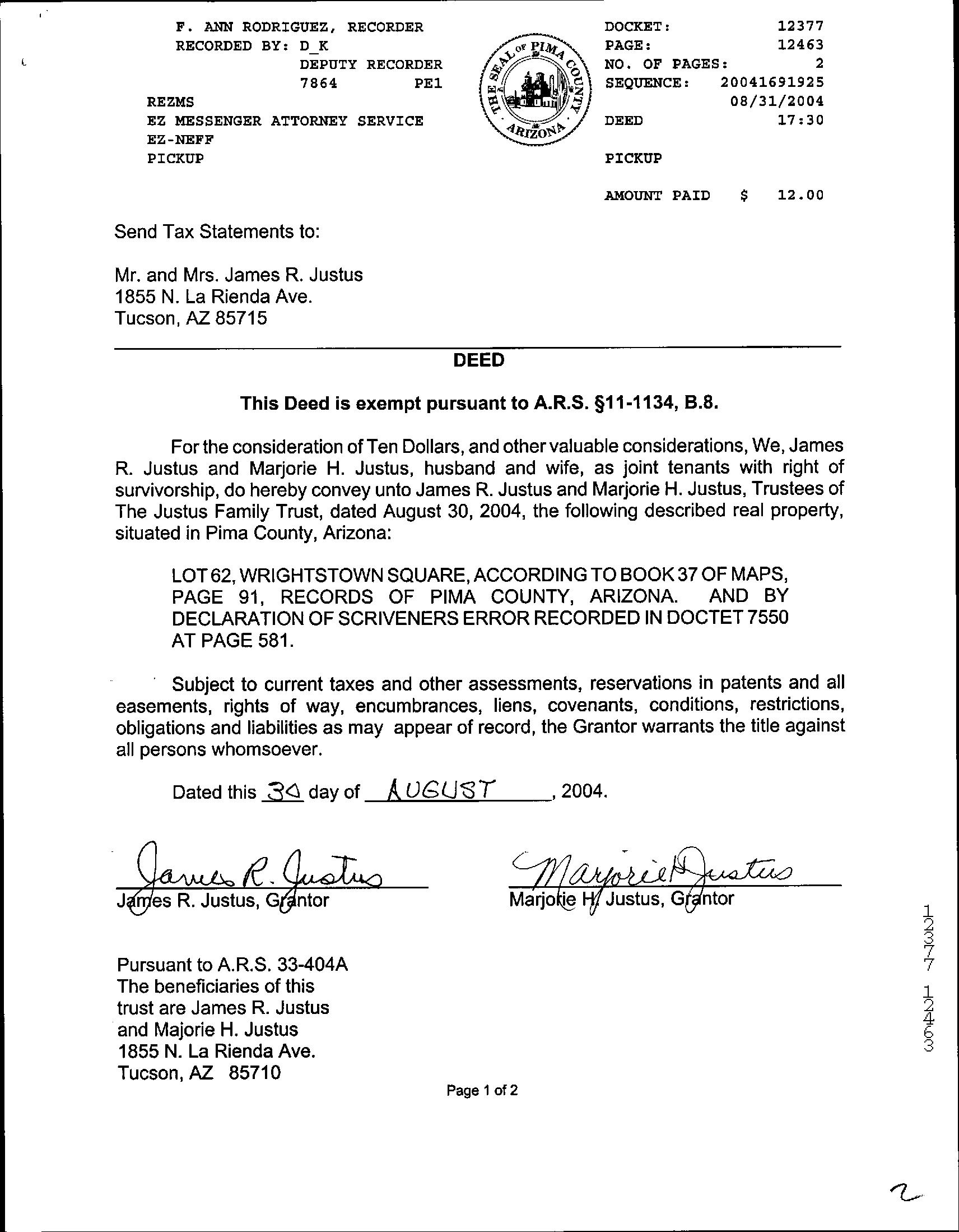 + FIRST AMERICAN TITLE, FC0, CCOR PIMA, AZ 08/12/2022 03:41PM AXDZ INVESTIGATIVE SEARCH RESULTS PAGE 1 OF 1 SEARCH PARAMETERS PARCEL: 133-07-2060 PARCEL: 133-07-2060 INSTRUMENT REC DATE OWNER: JUSTUS FAMILY TR 8999 1248 03/20/1991 SITUS: 1855 N LA RIENDA AV TUC MAIL: ATTN: JAMES R & MARJORIE H JUSTUS TR 1855 N LA RIENDA AVE TUCSON AZ 85710 PLAT: LOT 00062 BLOCK LEGAL: WRIGHTSTOWN SQUARE LOT 62 CURRENT TAXES INFORMATION THROUGH 07/28/2022 LAND IMPR EXEMPT RATE AREA SPECIAL DISTRICTS PRIMARY 13,350 0 0 11.6619 0150 SECONDARY 50 14,504 0 2.8778 2021 TOTAL TAX BILLED 1,718.12 2021 TAX AMT TAX DUE INTEREST DATE PAID TOTAL DUE FIRST HALF 859.06 0.00 0.00 10/04/2021 0.00 SECOND HALF 859.06 0.00 0.00 02/28/2022 0.00 TOTAL CURRENT TAXES DUE 08/22 0.00 09/22 0.00 IMPROVEMENTS RESIDENTIAL BLDG SQFT 1,123 FULL CASH VALUE 145,544 YEAR BUILT 1991 LAND USE 07 30 NUMBER OF STORIES 4.0 LOT SIZE 1 STDLT STORIES HEIGHT 0 SCHOOL DISTRICT 0150 EXTERIOR WALLS FRAME WOOD LAND FULL CASH VALUE 502 GRADE MATERIALS IMPR FULL CASH VALUE 145,042 SALES SALE DATE SALE AMOUNT INSTRUMENT TYPE SELLER NAME VALIDITY 03/20/1991 76,893 8999 1247 SD PIONEER TRUST CO T11491 ADDITIONAL PROPERTY INFORMATION STANDARD LAND USE: CONDOMINIUM END SEARCH