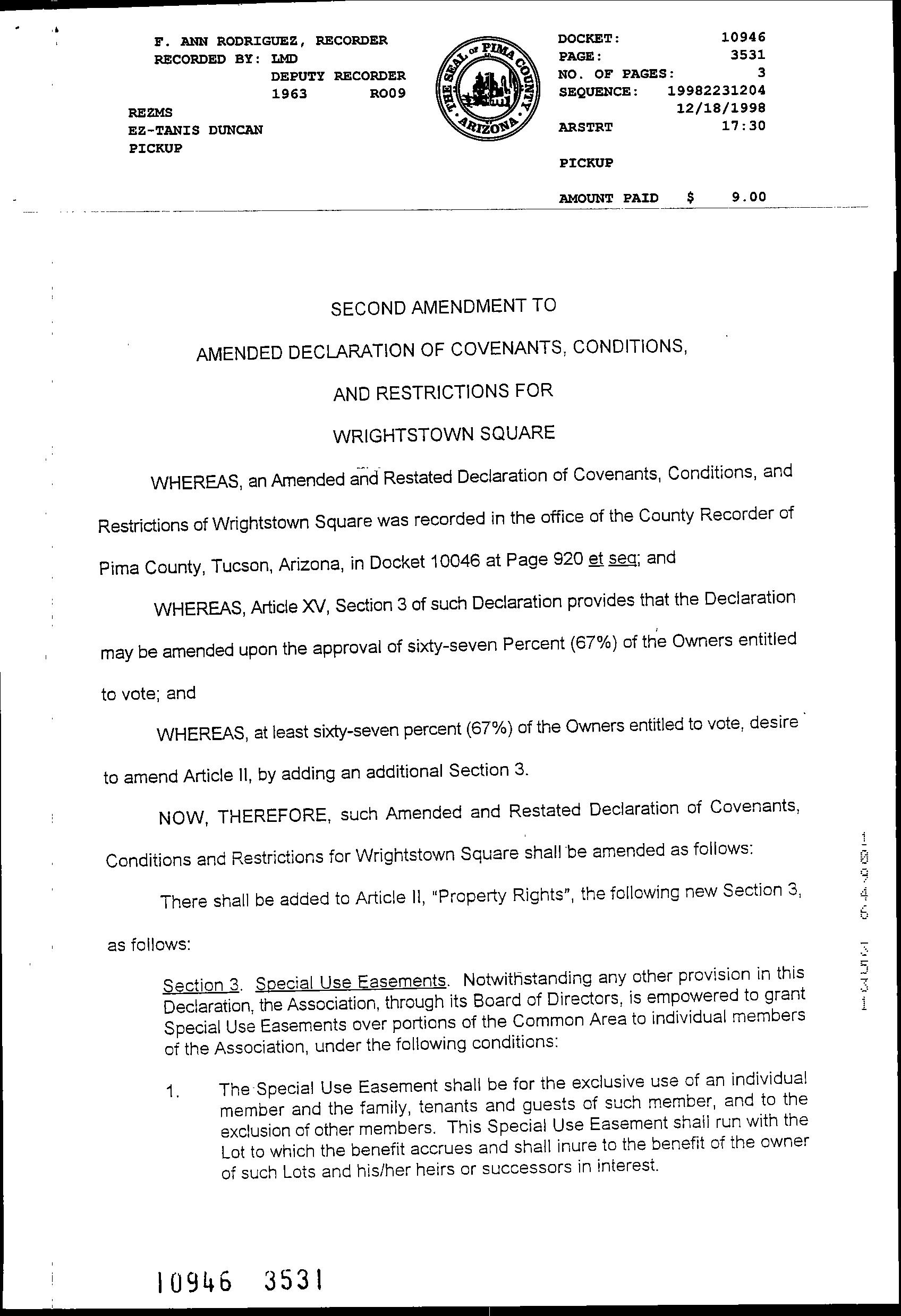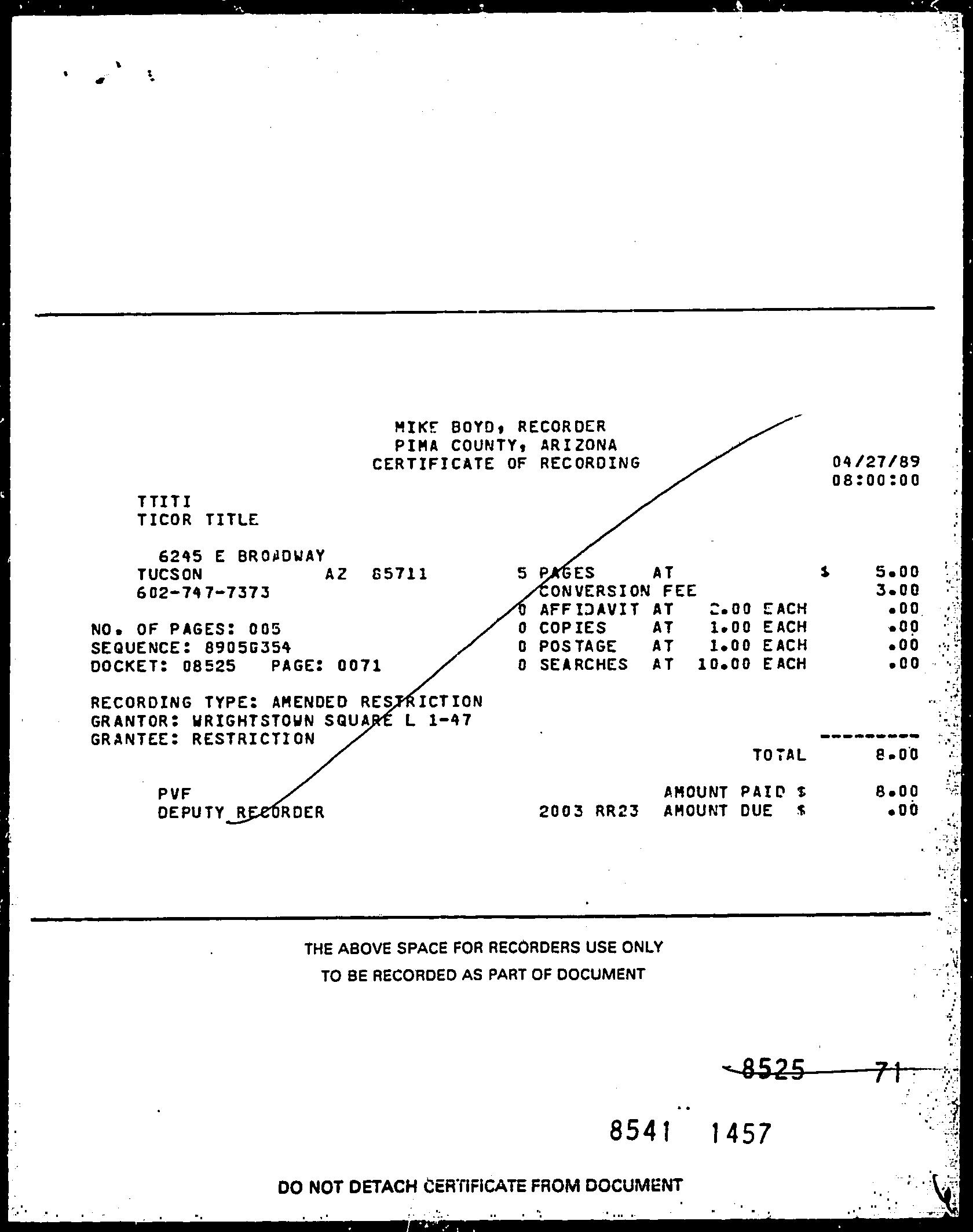 ConditionsCovenants,&Restrictions Thank you for the opportunity to be of service. Restrictions indicating a preference, limitation or discrimination based on race, color, religion, sex, handicap, familial status, or national origin are hereby deleted to the extent such restrictions violate 42 USC 3604(c). This information is furnished without fee and without benefit of a complete title search. No liability is assumed by First American Title or Title Security. If it is desired that liability be assumed, you may apply for a policy of title insurance with First American Title Insurance Company.