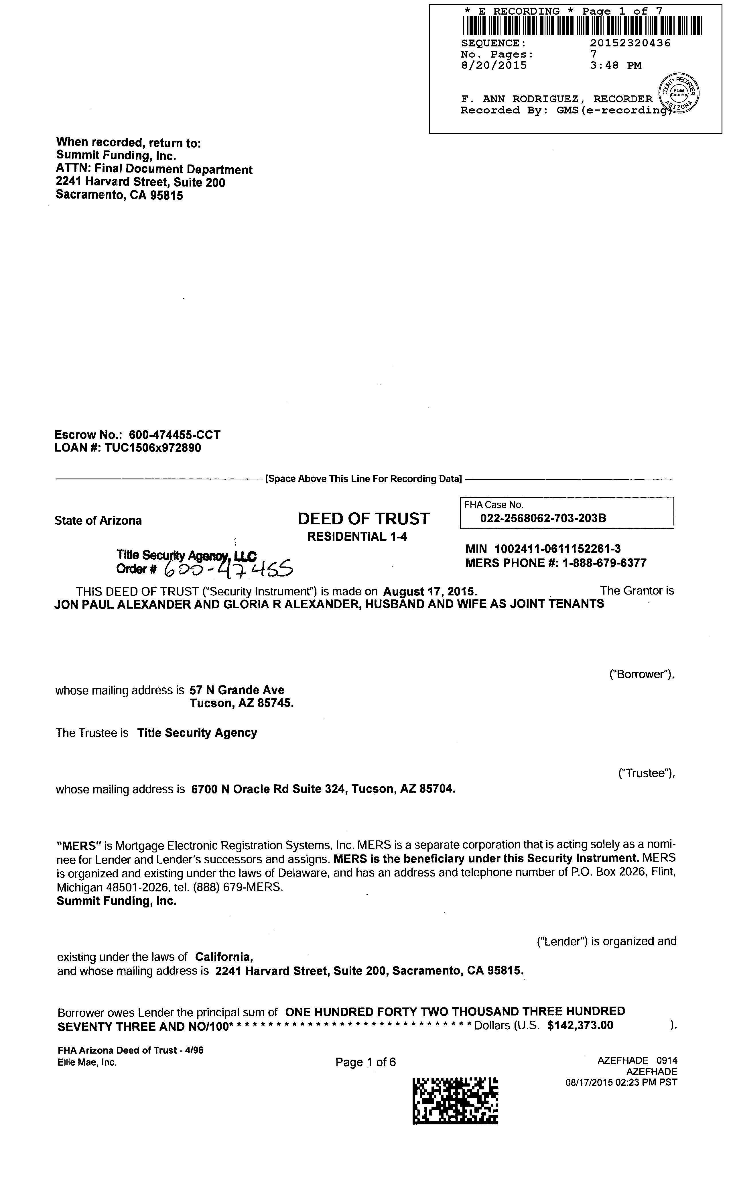 Recording/Sale Date : 08/20/2015 / 08/18/2015 1st Mtg Amount/Type : $142,373 / Fha
