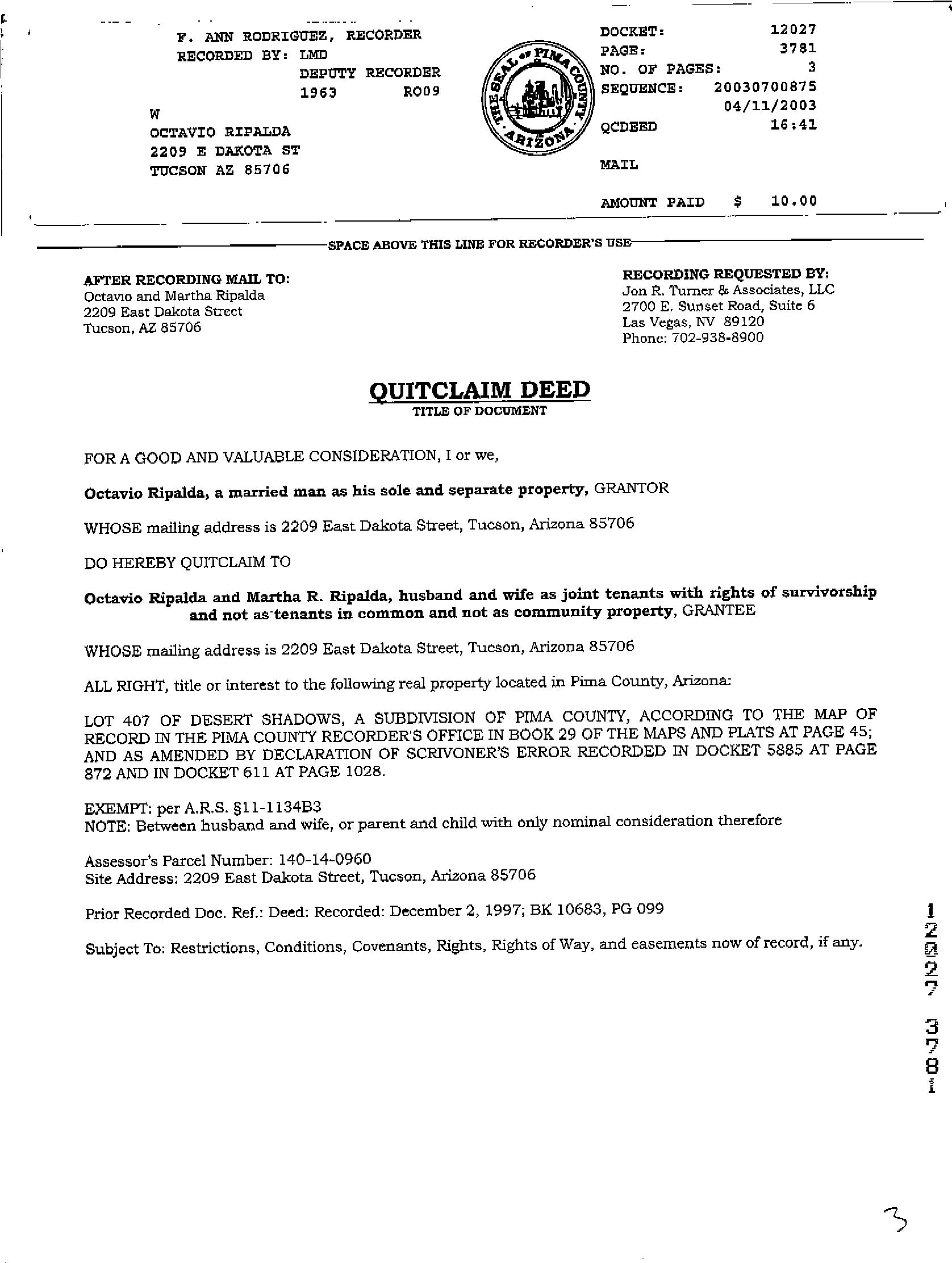 Deed Type : Quit Claim Deed Document # : 12027-3781