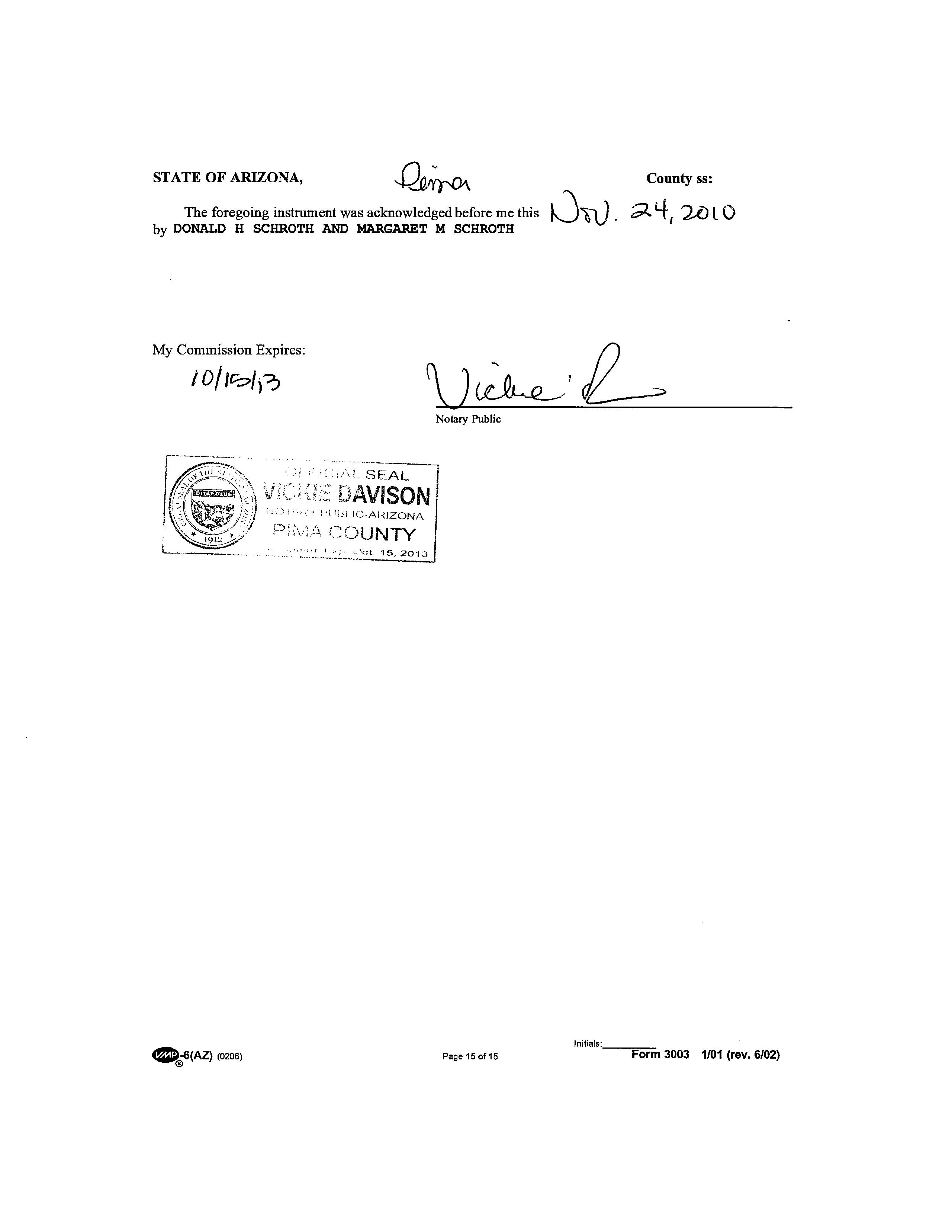 + FIRST AMERICAN TITLE, FC0, CCOR PINAL (PL), AZ 08/30/2022 06:17AM NKFE INVESTIGATIVE SEARCH RESULTS PAGE 1 OF 1 SEARCH PARAMETERS PARCEL: 305-93-6440 PARCEL: 305-93-6440 0 INSTRUMENT REC DATE OWNER: SCHROTH DONALD H 2010 54069 06/07/2010 SITUS: 61034 E DANGLING REINS PL TUCSON MAIL: SCHROTH MARGARET M 61034 E DANGLING REINS PL TUCSON AZ 85739 LEGAL: LOT 653 EAGLE CREST RANCH IV-C CAB G SLD 176 SEC 32-10S-14E CURRENT TAXES INFORMATION THROUGH 08/12/2022 LAND IMPR EXEMPT RATE AREA SPECIAL DISTRICTS PRIMARY 13,901 0 0 8.3775 0204 11649 11900 14613 14900 15625 SECONDARY 5,576 11,710 0 3.7521 24003 2021 TOTAL TAX BILLED 1,576.88 2021 TAX AMT TAX DUE INTEREST DATE PAID TOTAL DUE FIRST HALF 788.44 0.00 0.00 10/27/2021 0.00 SECOND HALF 788.44 0.00 0.00 04/27/2022 0.00 TOTAL CURRENT TAXES DUE 08/22 0.00 09/22 0.00 IMPROVEMENTS SINGLE FAMILY HOME PHYSICAL CONDITION ABOVE AVERAGE BLDG SQFT 1,765 FULL CASH VALUE 172,857 YEAR BUILT 2008 LAND USE 01 31 NUMBER OF STORIES 1.0 LOT SIZE 6,969 FR FT STORIES HEIGHT 8 SCHOOL DISTRICT 0204 EXTERIOR WALLS LAND FULL CASH VALUE 55,757 GRADE MATERIALS IMPR FULL CASH VALUE 117,100 RESIDENTIAL YARD IMPROVEMENTS PHYSICAL CONDITION ABOVE AVERAGE BLDG SQFT 1 FULL CASH VALUE 172,857 YEAR BUILT 2008 LAND USE 01 31 NUMBER OF STORIES 1.0 LOT SIZE 6,969 FR FT STORIES HEIGHT 1 SCHOOL DISTRICT 0204 EXTERIOR WALLS LAND FULL CASH VALUE 55,757 GRADE MATERIALS IMPR FULL CASH VALUE 117,100 SALES SALE DATE SALE AMOUNT INSTRUMENT TYPE SELLER NAME VALIDITY 06/07/2010 180,000 2010 54069 WD COLE DANIEL B/ARLENE J 07/16/2009 182,500 2009 72367 SW DR HORTON INC ADDITIONAL PROPERTY INFORMATION STANDARD LAND USE: SFR END SEARCH