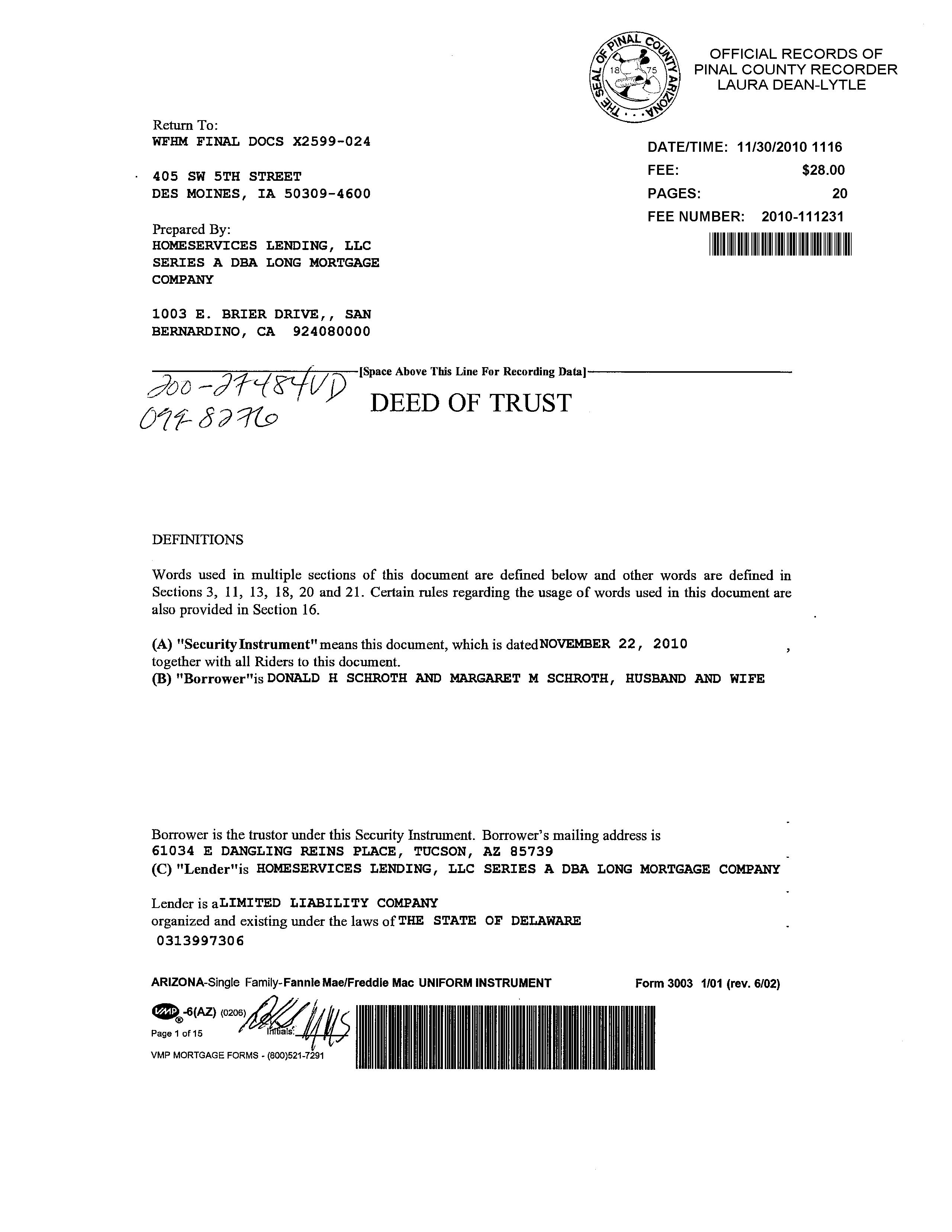Subject Property : 61034 E Dangling Reins Pl Tucson AZ 85739 Owner Information Owner Name : Schroth Donald H / Schroth Margaret M Mailing Address : 61034 E Dangling Reins Pl, Tucson AZ 85739-1365 R087 Vesting Codes : Husband/wife / / Community Property Owner OccupiedIndicator : O Location Information Legal Description : Lot 653 Eagle Crest Ranch Iv-c Cab G Sld 176 Sec 32-10s-14e County : Pinal, Az APN : 305-93-644 Census Tract / Block : 6.03 / 2 Subdivision : Eagle Crest Ranch Iv-c Township-Range- Sect : 10S-14E-32 Map Reference : 3210S14E Legal Lot : 653 Last Market Sale Information Recording/Sale Date : 06/07/2010 / 05/18/2010 1st Mtg Amount/Type : $144,000 / Cnv Sale Price : $180,000 1st Mtg Document # : 54070 Document # : 54069 1st Mtg Term : 30 Deed Type : Warranty Deed Price Per SqFt : $101.98 Title Company : First American Title Lender : Long Mtg Co Seller Name : Cole Daniel B & Arlene J Prior Sale Information Prior Rec/Sale Date : 07/16/2009 / 07/07/2009 Prior Doc Number : 72367 Prior Sale Price : $182,500 Prior Deed Type : Special Warranty Deed Property Characteristics Gross Area : 2,165 Garage Area : 400 Cooling Type : Central Living Area : 1,765 Roof Type : Truss-joist Exterior wall : Plaster Above Grade : 1765 Foundation : Concrete Porch Type : Slab Year Built / Eff : 2008 Roof Material : Concrete Tile Air Cond : Central # of Stories : 1 Construction : Steel/wood Quality : Average Parking Type : GarageAttached Heat Type : Central Floor Cover : Carpet Customer Name : Chantel Cortez Customer Company Name : FIRST AMERICAN TITLE Prepared On : 08/30/2022 © 2022 CoreLogic. All rights reserved