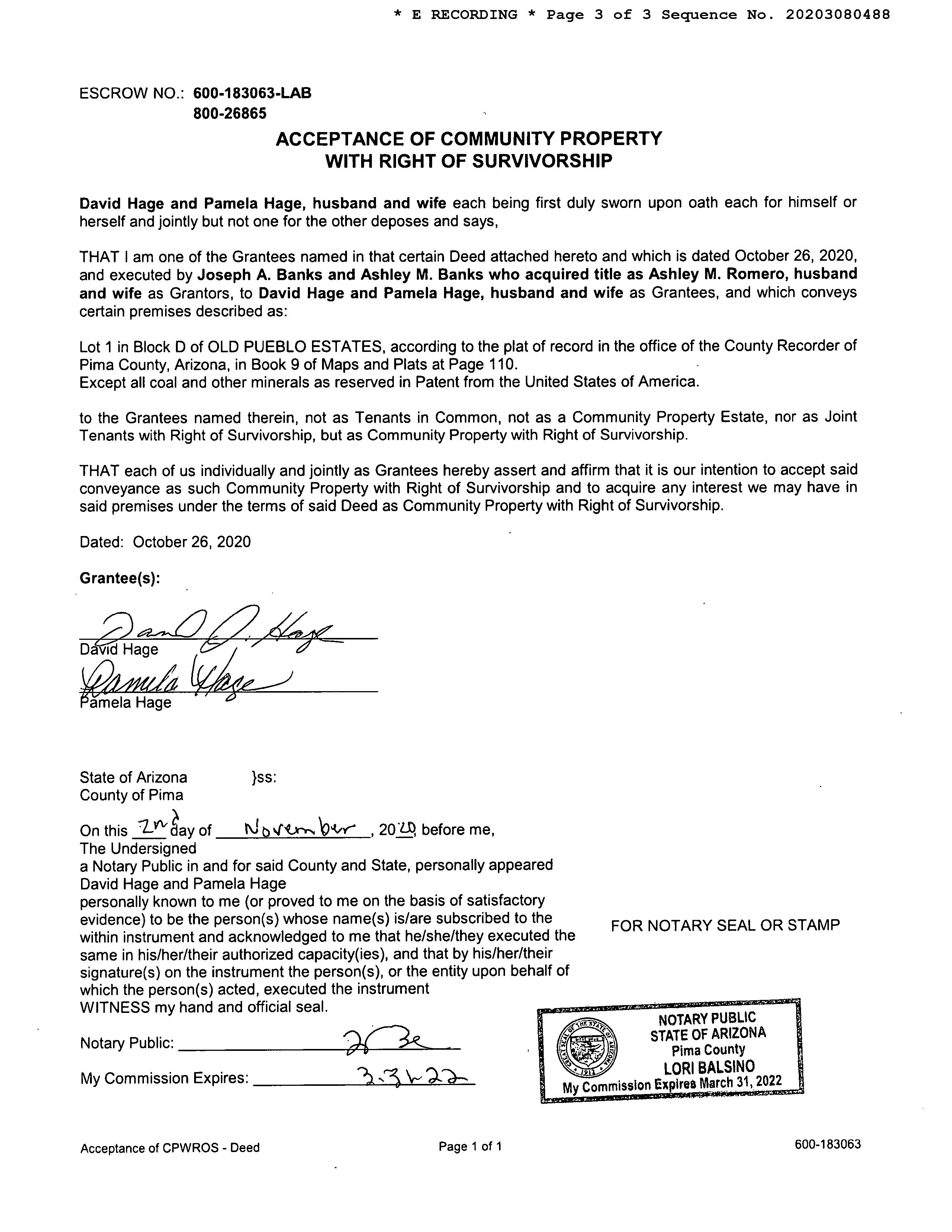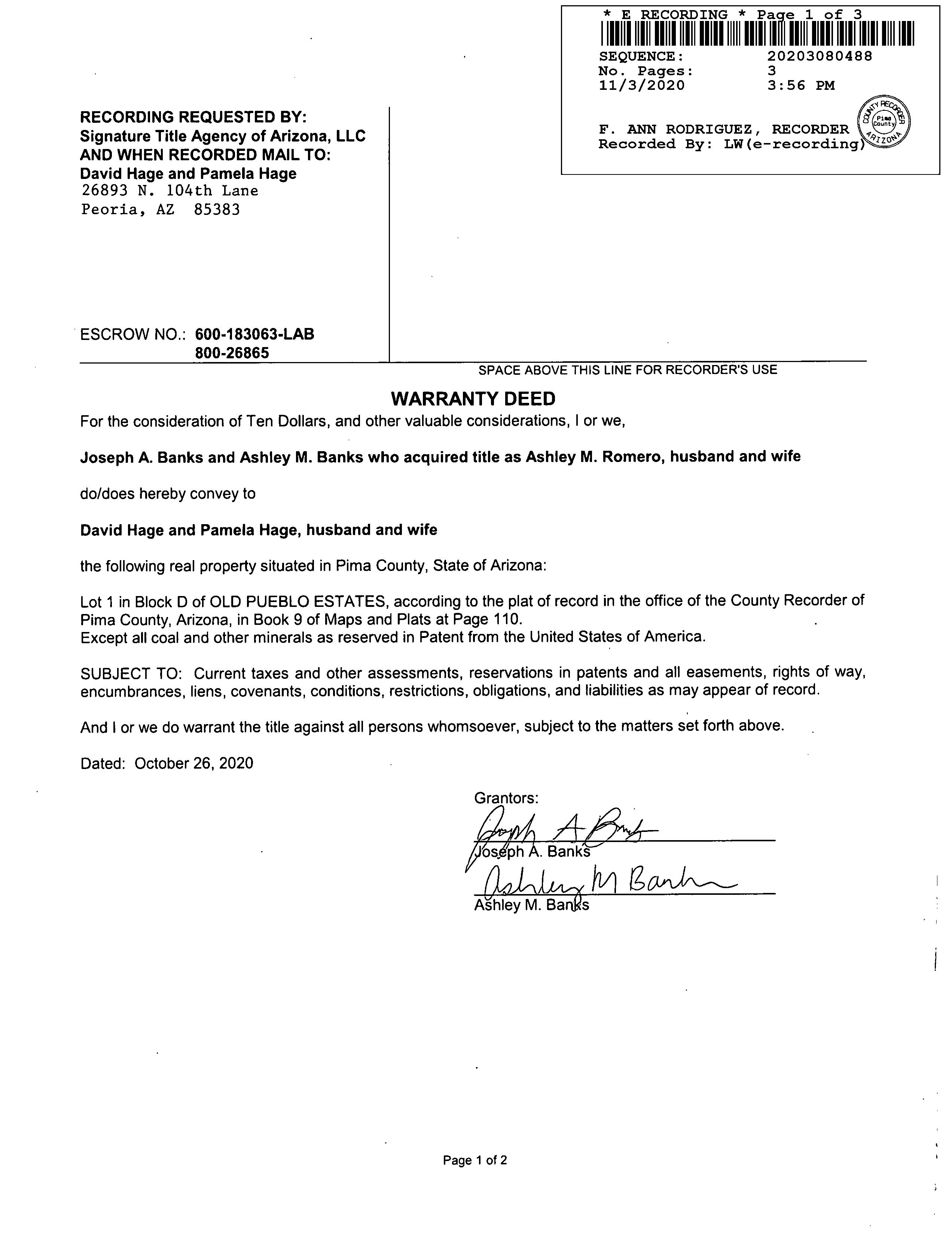 Owner Name: Hage David /Hage Pamela APN / Alternate APN: 134-22-0520 / Deed Type: Warranty Deed Land Use: Sfr Subdivision / Tract: Old Pueblo Estates / Lot Size: 8,579 Year Built / Eff: 1960 / Rec. Date / Price: 11/03/2020 / $262,000 Living Area: 1,610 # of units: