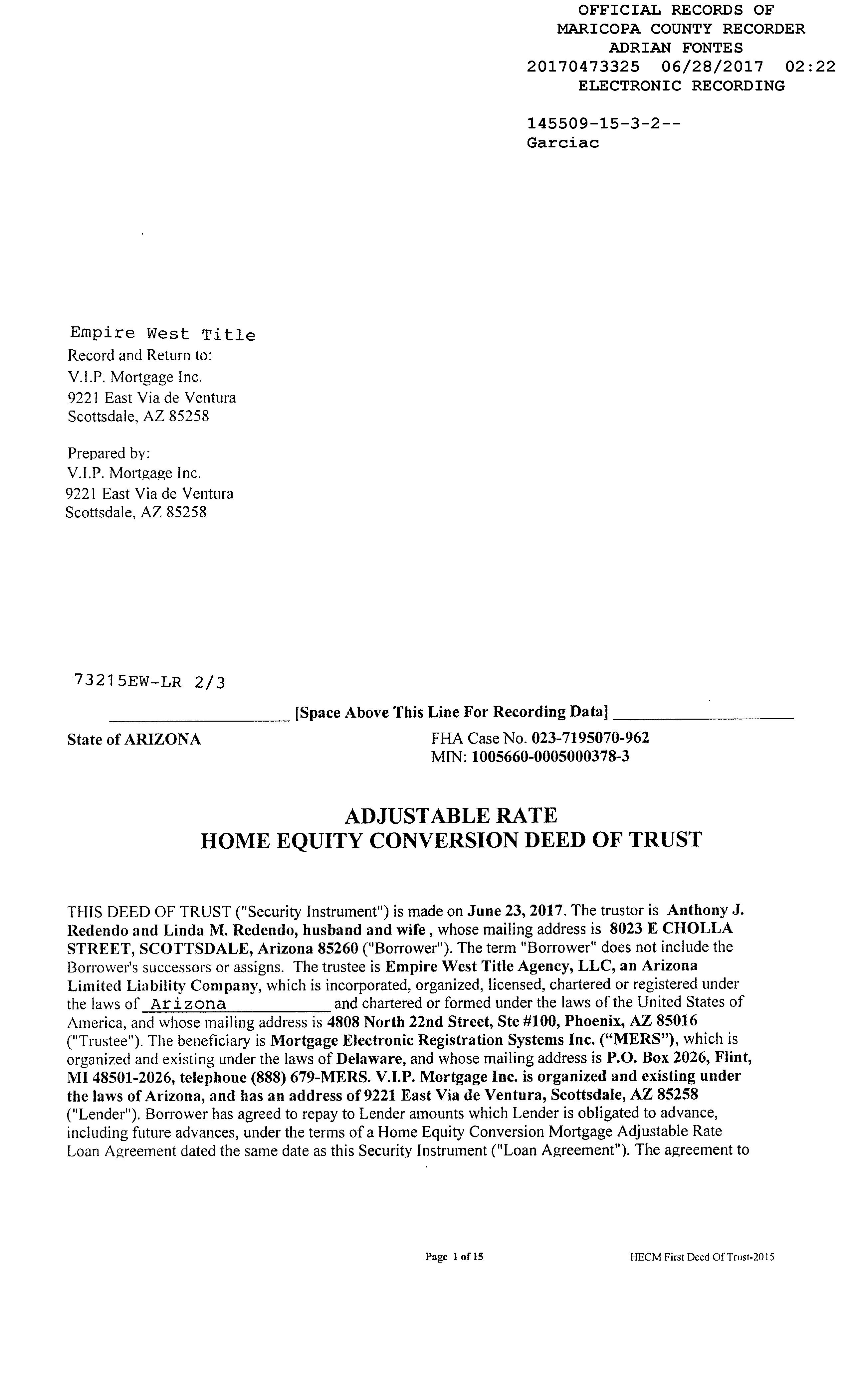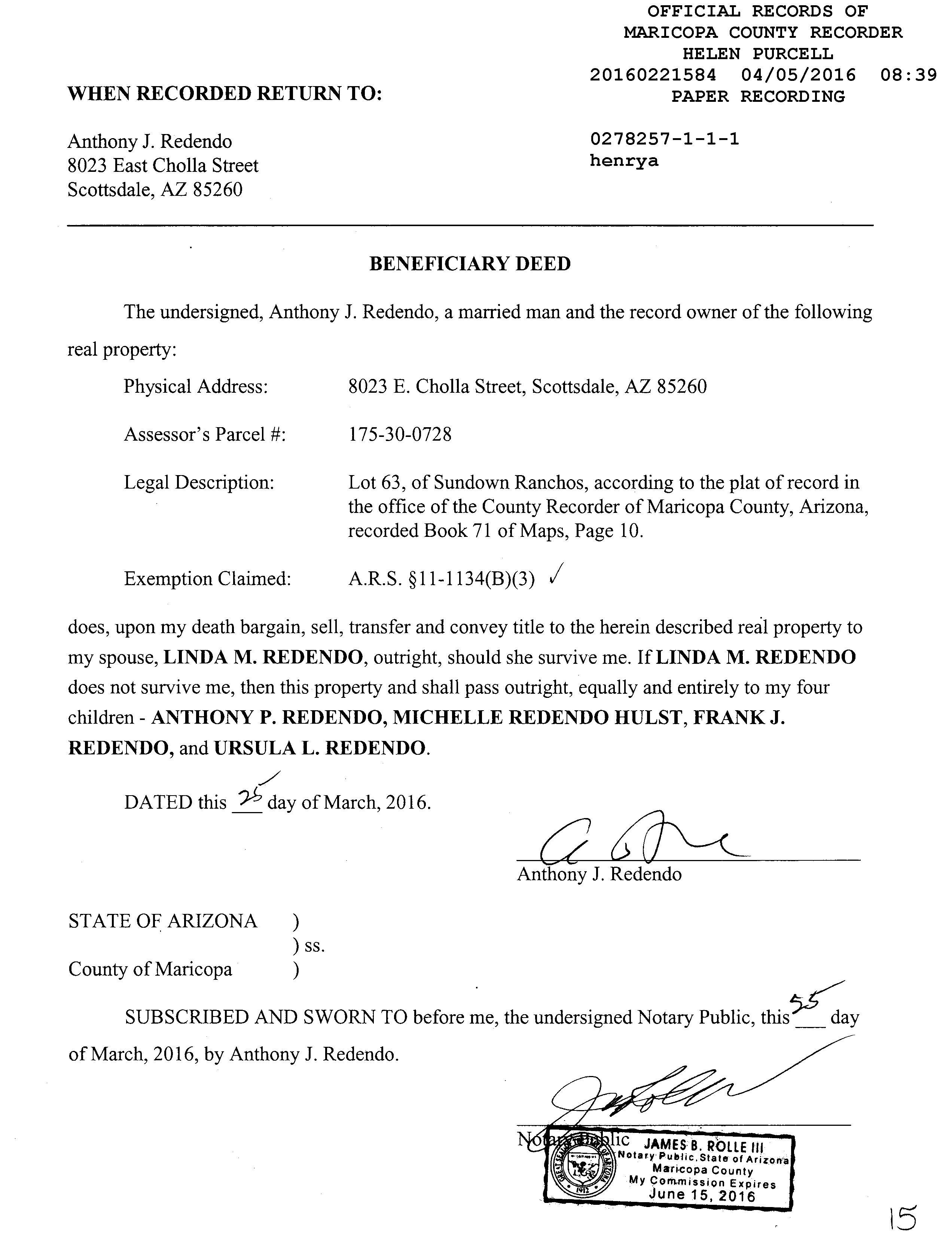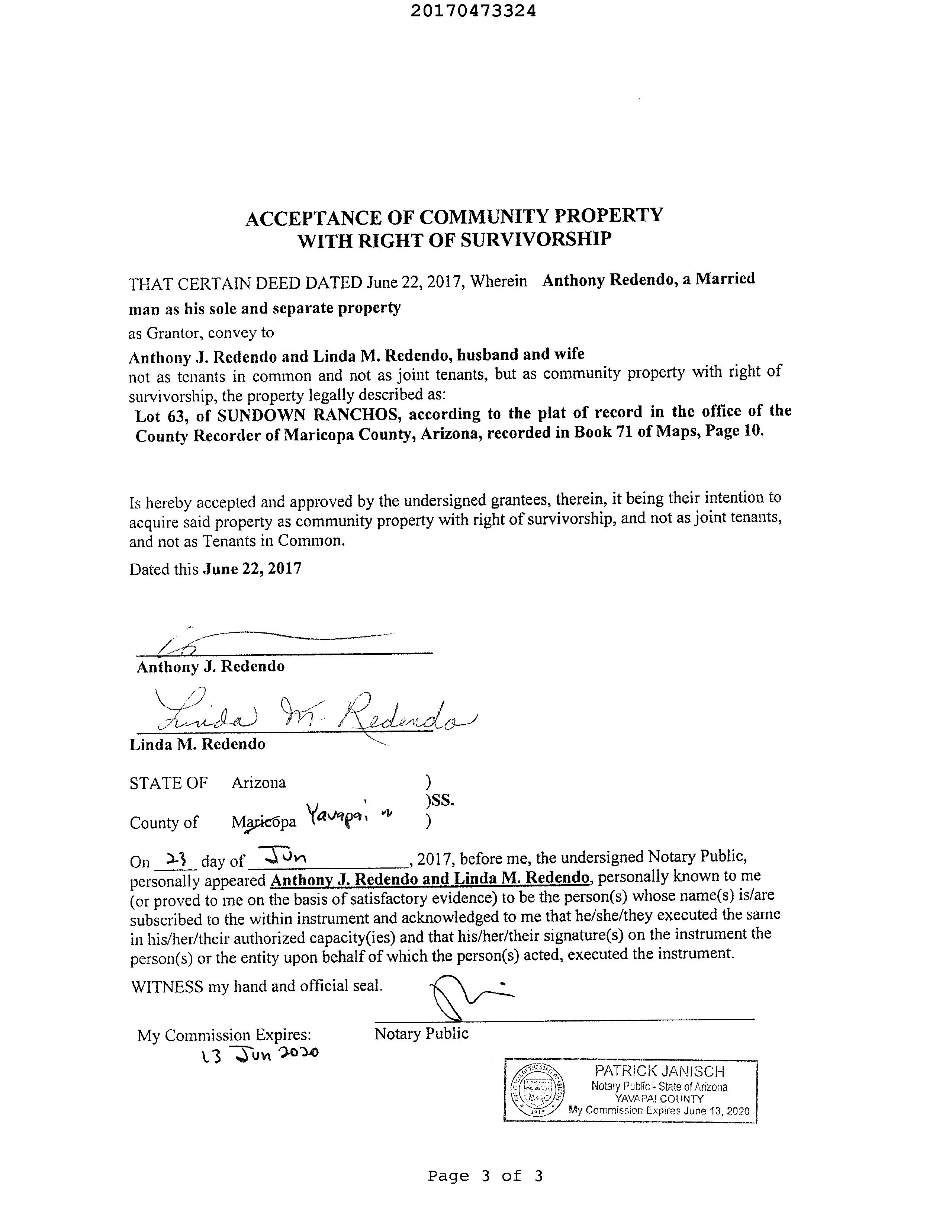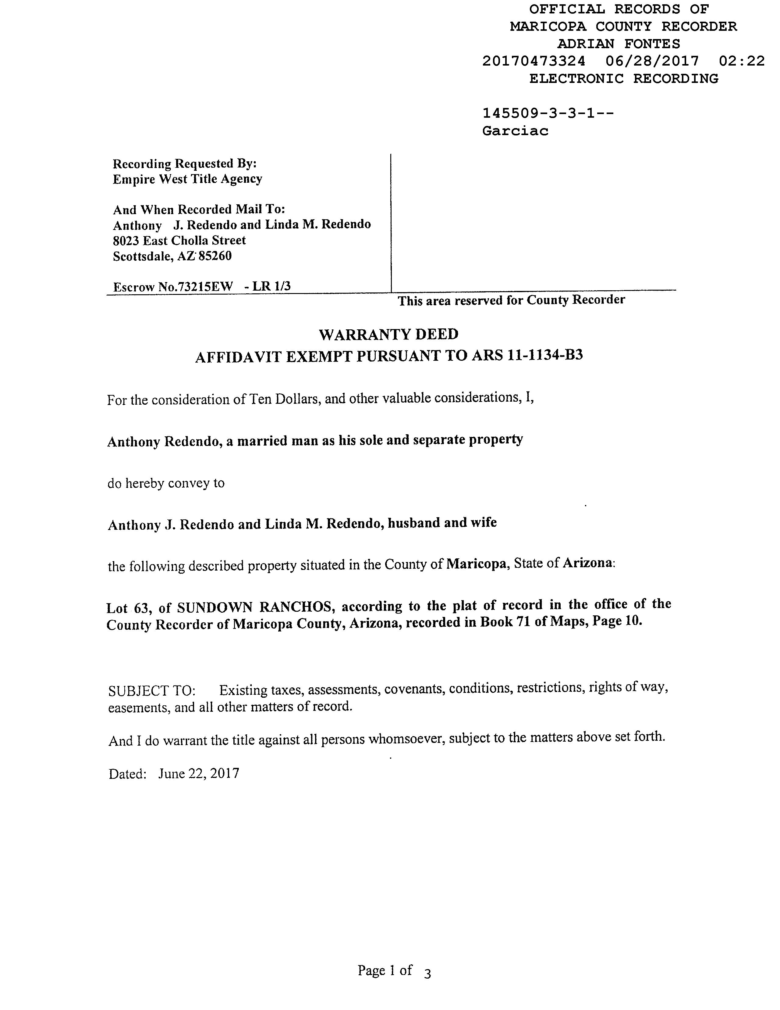 Subject Property : 8023 E Cholla St Scottsdale AZ 85260 Owner Information Owner Name : Redendo Anthony J / Redendo Linda M Mailing Address : 8023 E Cholla St, Scottsdale AZ 85260-6515 C012 Vesting Codes : Married Man / / Separate Property Owner OccupiedIndicator : O Location Information Legal Description : Lot 63 Sundown Ranchos County : Maricopa, Az Subdivision : Sundown Ranchos Census Tract / Block : 2168.16 / 3 Map Reference : 7110 Township-Range- Sect : 03N-04E-24 School District : Scottsdale 48 Legal Lot : 63 Munic/Township : Scottsdale APN : 175-30-072 Neighbor Code : 05-012 Owner Transfer Information Recording/Sale Date : 06/28/2017 / 06/22/2017 Deed Type : Warranty Deed Document # : 473324 1st Mtg Document # : 473325 Last Market Sale Information Recording/Sale Date : 06/04/2009 / 05/29/2009 1st Mtg Amount/Type : $400,000 / Pp Sale Price : $500,000 1st Mtg Document # : 505836 Document # : 505834 Price Per SqFt : $123 Deed Type : Warranty Deed Title Company : Greystone Title Agency Lender : Private Individual Seller Name : Mcs Asset Management Llc Prior Sale Information Prior Rec/Sale Date : 07/31/1998 / 07/00/1998 Prior Lender : Mortgage Rsrcs Prior Sale Price : $245,000 Prior 1st Mtg Amt/Type : $196,000 / Conv Prior Doc Number : 664411 Prior 1st Mtg Rate/Type : / Fixed Rate Loan Prior Deed Type : Warranty Deed Customer Name : Chantel Cortez Customer Company Name : FIRST AMERICAN TITLE Prepared On : 08/19/2022 © 2022 CoreLogic. All rights reserved