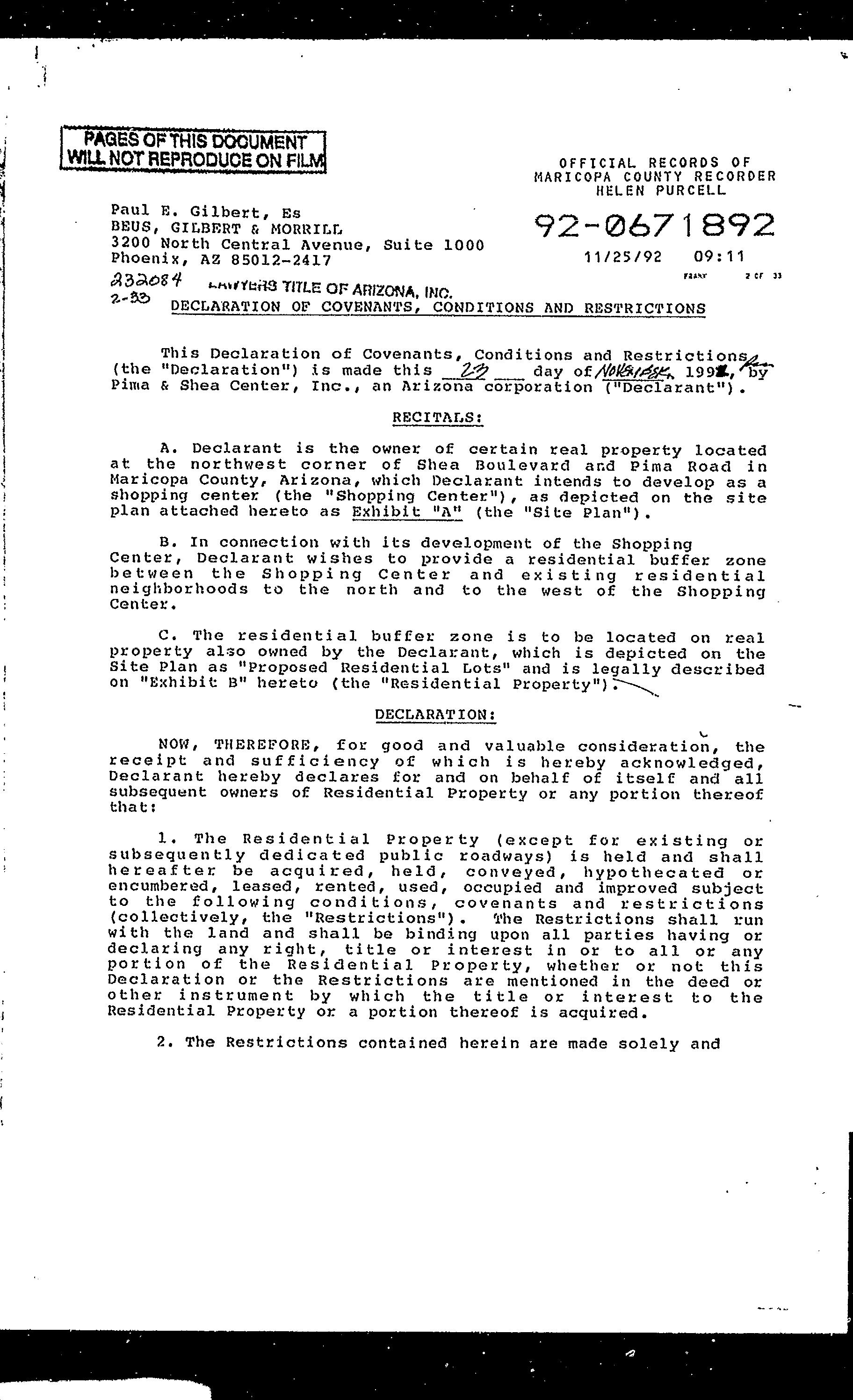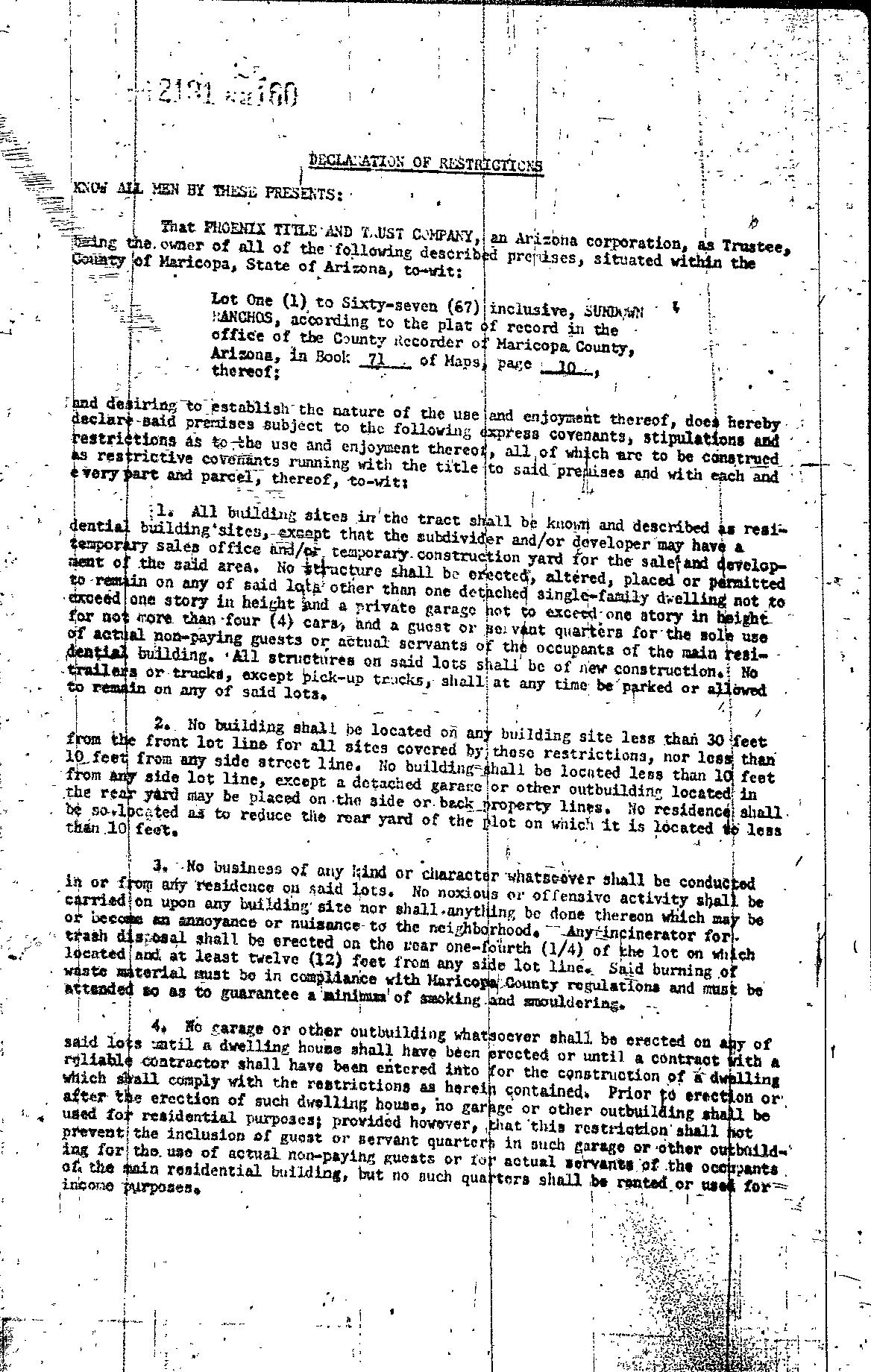 ConditionsCovenants,&Restrictions Thank you for the opportunity to be of service. Restrictions indicating a preference, limitation or discrimination based on race, color, religion, sex, handicap, familial status, or national origin are hereby deleted to the extent such restrictions violate 42 USC 3604(c). This information is furnished without fee and without benefit of a complete title search. No liability is assumed by First American Title or Title Security. If it is desired that liability be assumed, you may apply for a policy of title insurance with First American Title Insurance Company.