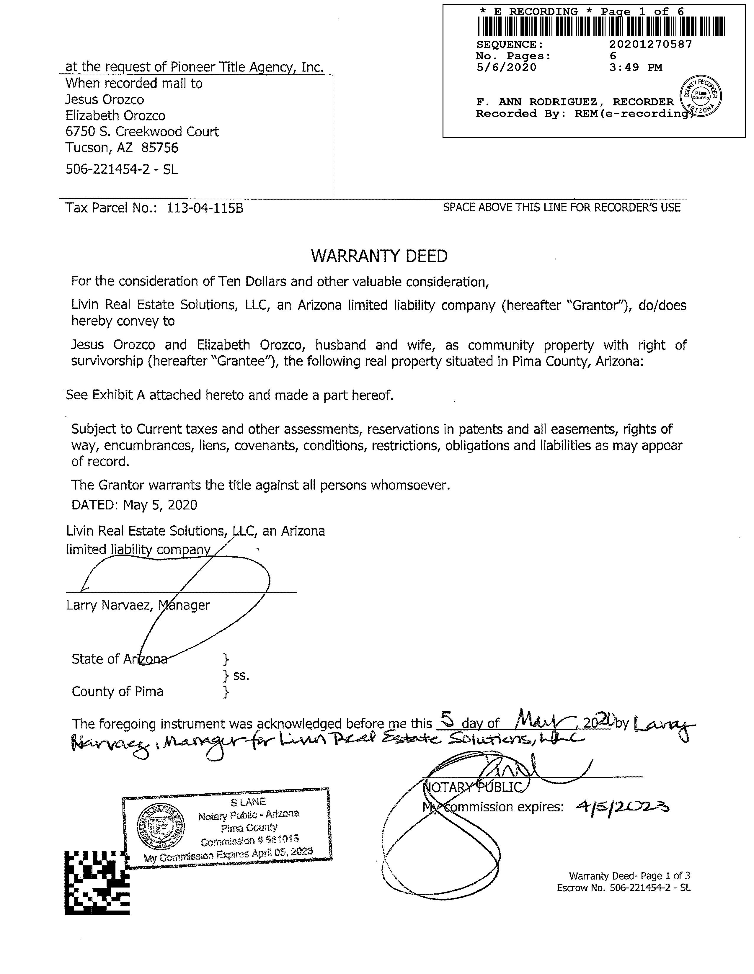 Owner Name: Orozco Jesus /Orozco Elizabeth APN / Alternate APN: 113-04-115B / Deed Type: Warranty Deed Land Use: Residential Lot Subdivision / Tract: / Lot Size: 6,433 Year Built / Eff: / Rec. Date / Price: 09/30/2019 / $155,000 Living Area: # of units: Document #: 2730809 Bedrooms: Pool: Total Tax Value: $26,000 Bath(F/H): /