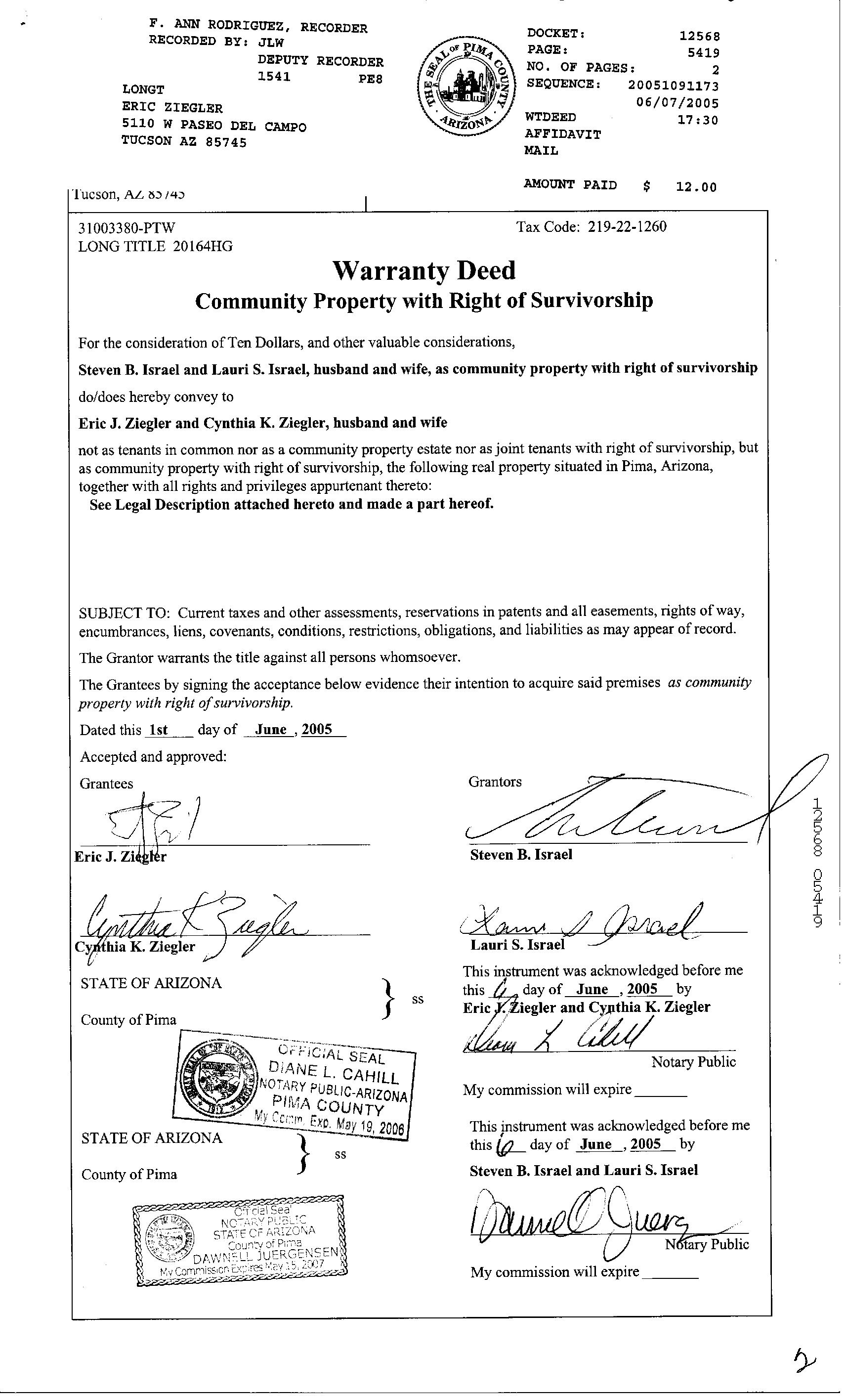 Owner Name: Ziegler Eric J /Ziegler Cynthia K APN / Alternate APN: 219-22-1260 / Deed Type: Warranty Deed Land Use: Sfr Subdivision / Tract: Ranch Vistoso Nbrhd 10 Prcl O&p / Lot Size: 5,018 Year Built / Eff: 2003 / Rec. Date / Price: 06/07/2005 / $330,000 Living Area: 1,928