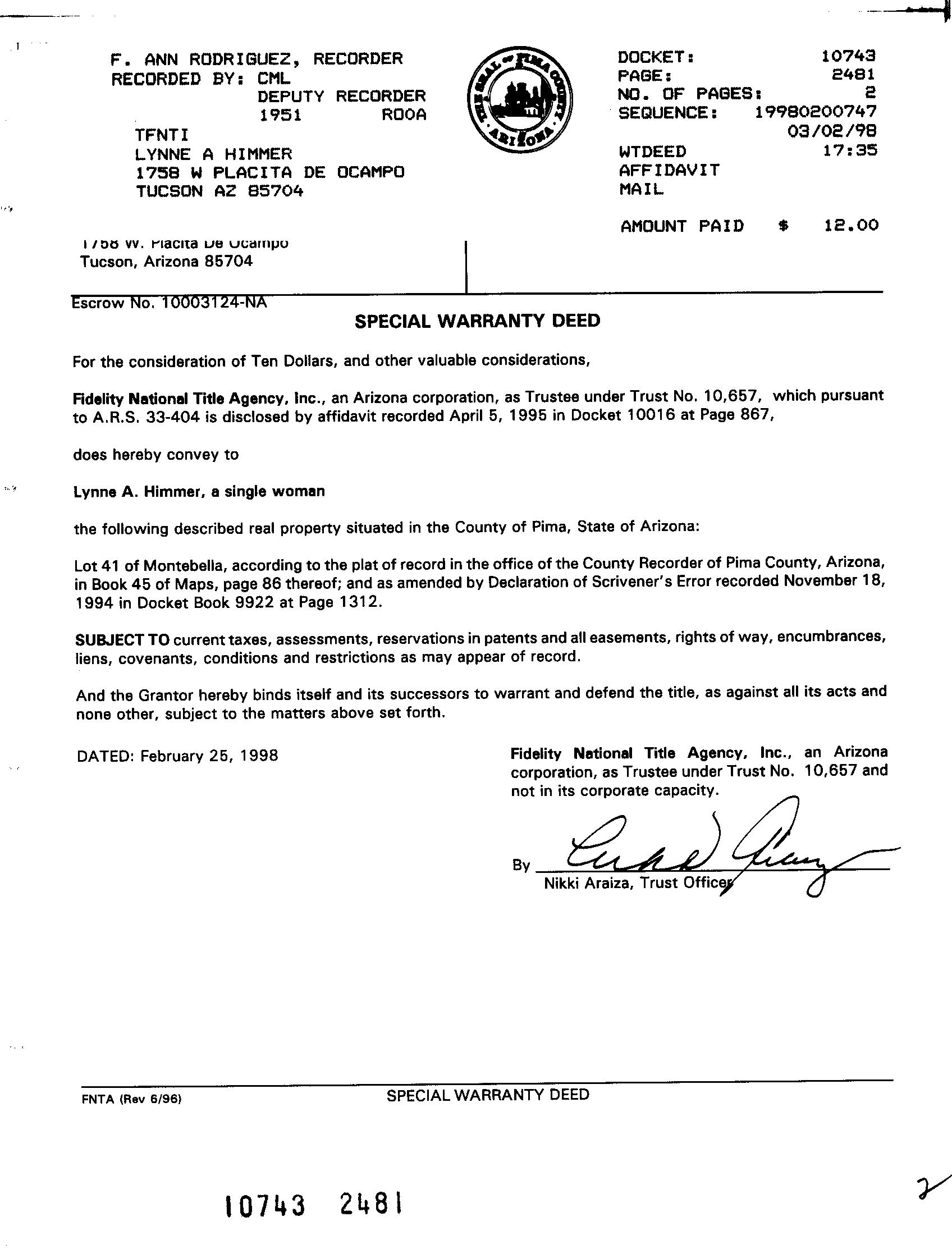 Owner Name: Himmer Lynne A / APN / Alternate APN: 102-11-183A / Deed Type: Special Warranty Deed Land Use: Sfr Subdivision / Tract: Montebella / Lot Size: 16,364 Year Built / Eff: 1998 / Rec. Date / Price: 03/02/1998 / $176,028 Living Area: 1,906 # of units: Document #: 10743-2481 Bedrooms: Pool: Pool Total Tax Value: $290,375 Bath(F/H): /