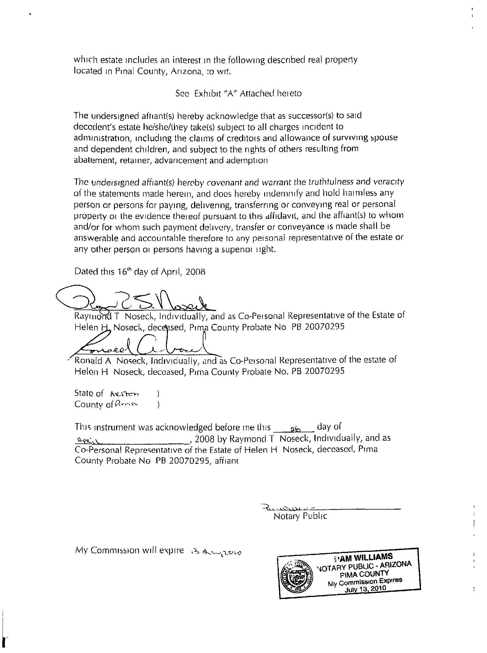 INSTRUMENT REC DATE OWNER: NOSECK RON & DENISE REV TRUST ETAL 2009 129967 12/16/2009 MAIL: 13730 E CAMINO CARTAMO TUCSON AZ 85749