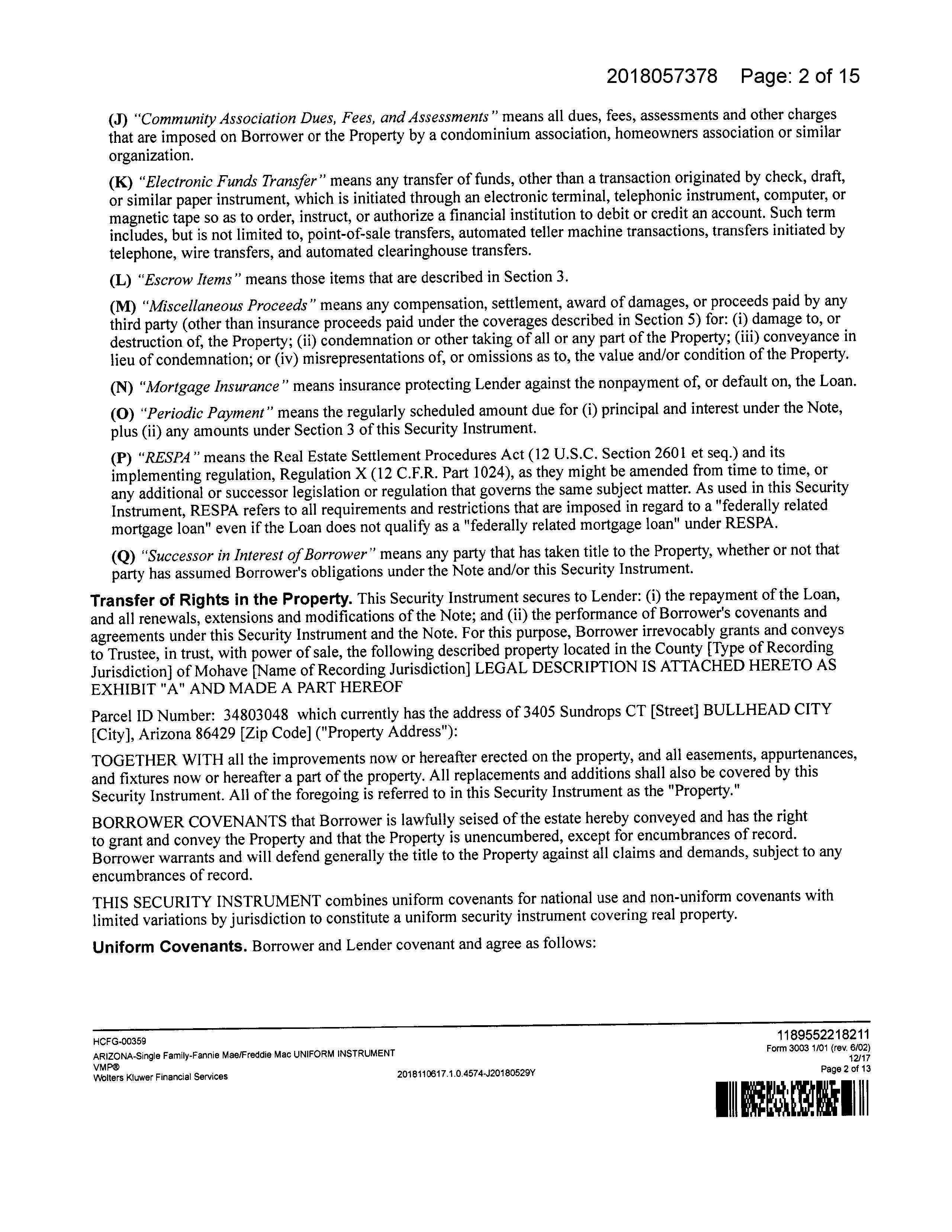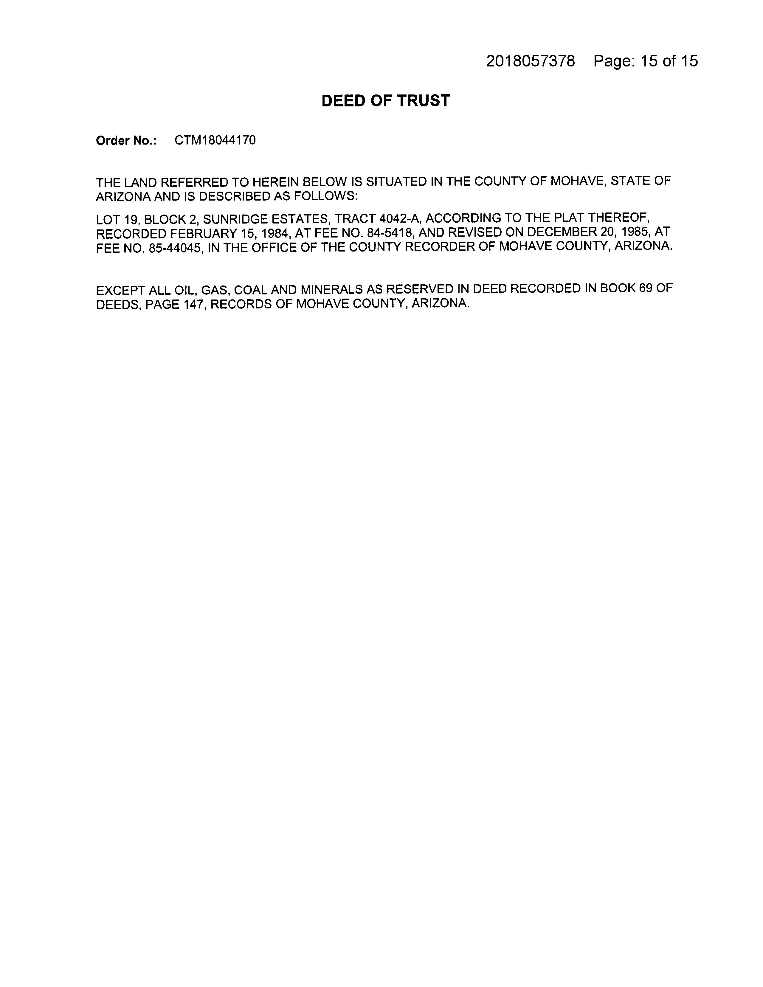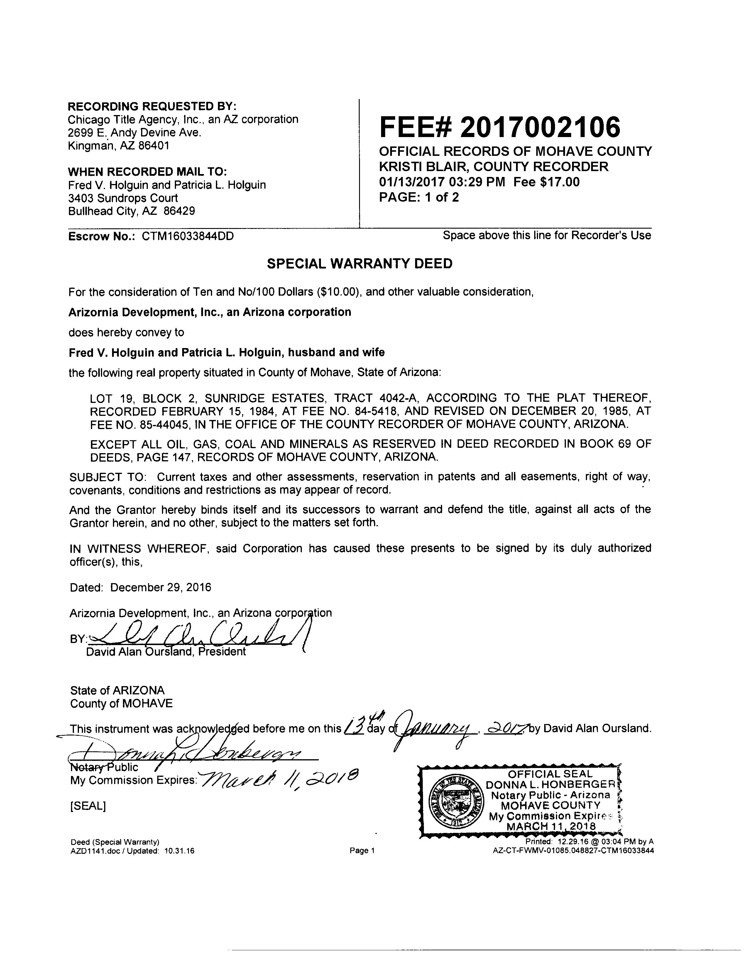 Subject Property : 3405 Sundrops Ct Bullhead City AZ 86429 Owner Information Owner Name : Holguin Fred V / Holguin Patricia L Mailing Address : 3405 Sundrops Ct, Bullhead City AZ 86429-7630 H074 Owner OccupiedIndicator : O Location Information Legal Description : T21n R21w Sec 21 First Revised Plat Of Sun Ridge Estates Tract 40 42a Blk 2 Lot 19 Cont 12716 Sq Ft County : Mohave, Az APN : 348-03-048 Census Tract / Block : 9514.01 / 2 Alternate APN : R0243587 Township-Range- Sect : 21N-21W-21 Subdivision : Sun Ridge Estate Legal Lot : 19 Map Reference : 2121N21W / 2121N21W Legal Block : 2 Tract : 40 Last Market Sale Information Recording/Sale Date : 01/13/2017 / 12/29/2016 Deed Type : Special Warranty Deed Sale Price : $25,000 Price Per SqFt : $13.32 Document # : 2106 Title Company : Chicago Title Agency Seller Name : Arizornia Dev Inc Prior Sale Information Prior Rec/Sale Date : 03/15/1990 / 03/15/1990 Prior Doc Number : 1685-139 Prior Sale Price : $35,500 Prior Deed Type : Warranty Deed Property Characteristics Gross Area : 3,644 Parking Type : GarageAttached Cooling Type : Central Living Area : 1,877 Garage Area : 767 Exterior wall : Stucco Above Grade : 1877 Roof Material : Concrete Tile Air Cond : Central Year Built / Eff : 2017 Construction : Steel/wood Quality : Good # of Stories : 1 Heat Type : Central Customer Name : Chantel Cortez Customer Company Name : FIRST AMERICAN TITLE Prepared On : 08/18/2022 © 2022 CoreLogic. All rights reserved
