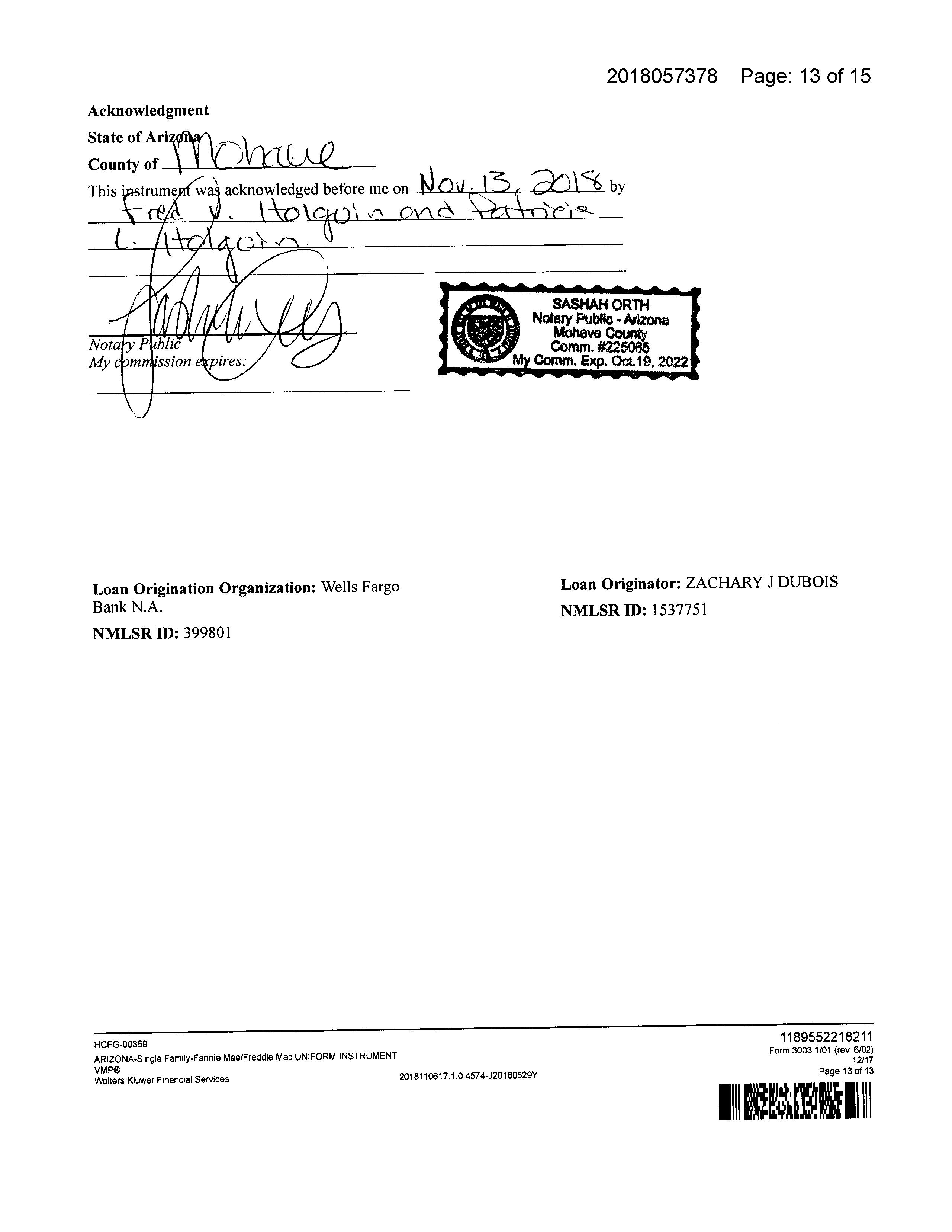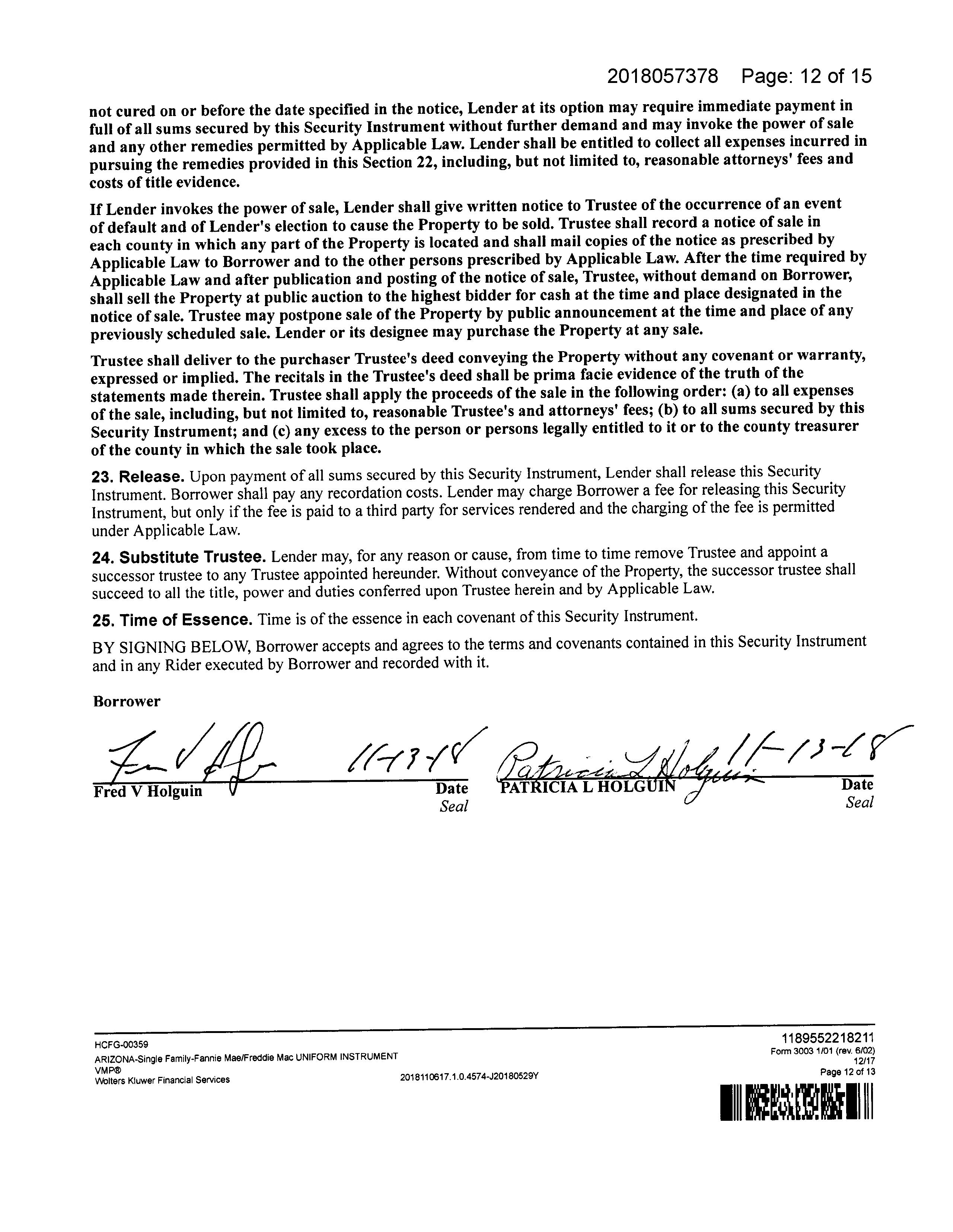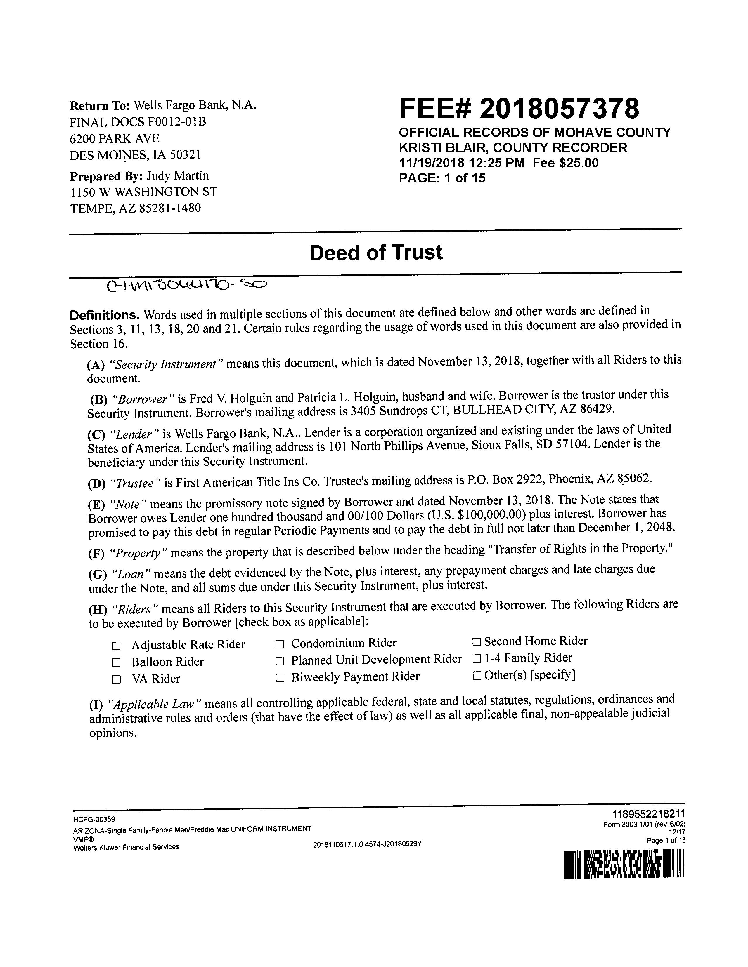 Subject Property : 3405 Sundrops Ct Bullhead City AZ 86429 Owner Information Owner Name : Holguin Fred V / Holguin Patricia L Mailing Address : 3405 Sundrops Ct, Bullhead City AZ 86429-7630 H074 Owner OccupiedIndicator : O Location Information Legal Description : T21n R21w Sec 21 First Revised Plat Of Sun Ridge Estates Tract 40 42a Blk 2 Lot 19 Cont 12716 Sq Ft County : Mohave, Az APN : 348-03-048 Census Tract / Block : 9514.01 / 2 Alternate APN : R0243587 Township-Range- Sect : 21N-21W-21 Subdivision : Sun Ridge Estate Legal Lot : 19 Map Reference : 2121N21W / 2121N21W Legal Block : 2 Tract : 40 Last Market Sale Information Recording/Sale Date : 01/13/2017 / 12/29/2016 Deed Type : Special Warranty Deed Sale Price : $25,000 Price Per SqFt : $13.32 Document # : 2106 Title Company : Chicago Title Agency Seller Name : Arizornia Dev Inc Prior Sale Information Prior Rec/Sale Date : 03/15/1990 / 03/15/1990 Prior Doc Number : 1685-139 Prior Sale Price : $35,500 Prior Deed Type : Warranty Deed Property Characteristics Gross Area : 3,644 Parking Type : GarageAttached Cooling Type : Central Living Area : 1,877 Garage Area : 767 Exterior wall : Stucco Above Grade : 1877 Roof Material : Concrete Tile Air Cond : Central Year Built / Eff : 2017 Construction : Steel/wood Quality : Good # of Stories : 1 Heat Type : Central Customer Name : Chantel Cortez Customer Company Name : FIRST AMERICAN TITLE Prepared On : 08/18/2022 © 2022 CoreLogic. All rights reserved