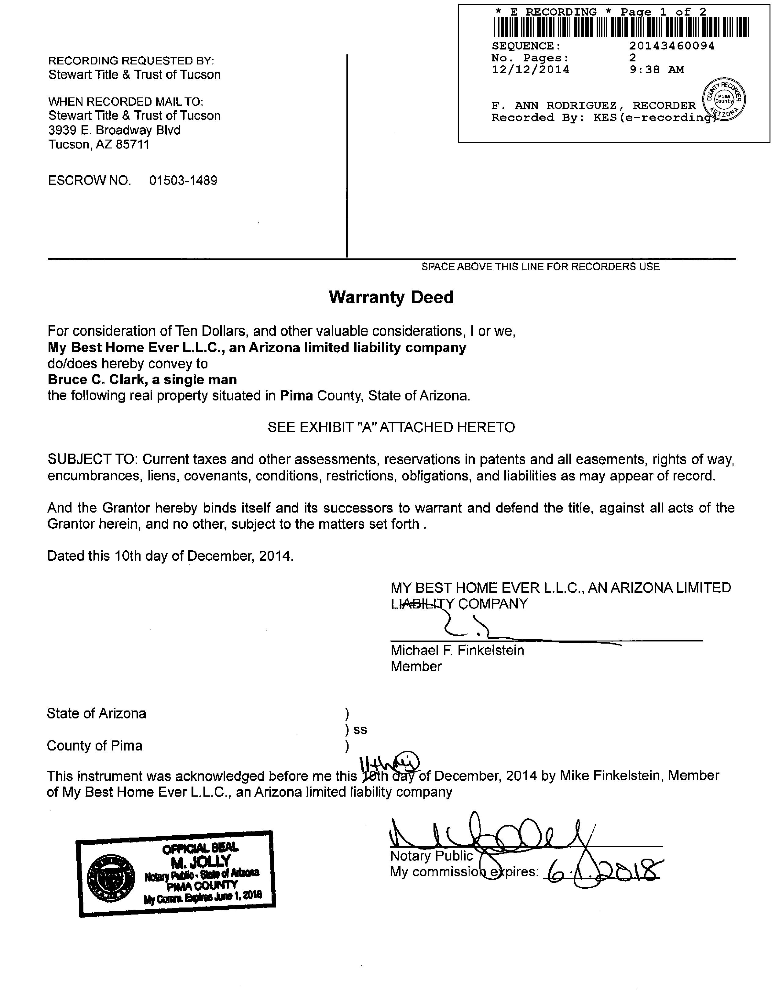 + FIRST AMERICAN TITLE, FC0, CCOR PIMA, AZ 08/24/2022 09:14AM NKFE INVESTIGATIVE SEARCH RESULTS PAGE 1 OF 1 SEARCH PARAMETERS PARCEL: 125-11-260C PARCEL: 125-11-260C INSTRUMENT REC DATE OWNER: CLARK BRUCE C AFFIDAVIT 2014 3460094 12/12/2014 SITUS: 623 N DODGE BL TUC MAIL: 3643 E 6TH ST TUCSON AZ 85716 PLAT: LOT 00009 BLOCK LEGAL: SPEEDWAY VIEW RESUB PTN WLY 113.72' LOT 9 & SPEEDWAY VIEW ADDITION NLY PTN W2 LOT 9 BLK 8 CURRENT TAXES INFORMATION THROUGH 07/28/2022 LAND IMPR EXEMPT RATE AREA SPECIAL DISTRICTS PRIMARY 5,467 0 0 11.6619 0150 SECONDARY 4,950 1,069 0 2.8778 2021 TOTAL TAX BILLED 794.87 2021 TAX AMT TAX DUE INTEREST DATE PAID TOTAL DUE FIRST HALF 397.44 0.00 0.00 12/26/2021 0.00 SECOND HALF 397.43 0.00 0.00 12/26/2021 0.00 TOTAL CURRENT TAXES DUE 08/22 0.00 09/22 0.00 IMPROVEMENTS RESIDENTIAL BLDG SQFT 0 FULL CASH VALUE 40,126 YEAR BUILT 1947 LAND USE 00 16 NUMBER OF STORIES 1.0 LOT SIZE 9,806 SQ FT STORIES HEIGHT 0 SCHOOL DISTRICT 0150 EXTERIOR WALLS PAINTED BLOCK LAND FULL CASH VALUE 33,000 GRADE MATERIALS IMPR FULL CASH VALUE 7,126 SALES SALE DATE SALE AMOUNT INSTRUMENT TYPE SELLER NAME VALIDITY 12/12/2014 80,000 2014 3460094 WD MY BEST HOME EVER LLC M ADDITIONAL PROPERTY INFORMATION STANDARD LAND USE: RESIDENTIAL LOT END SEARCH