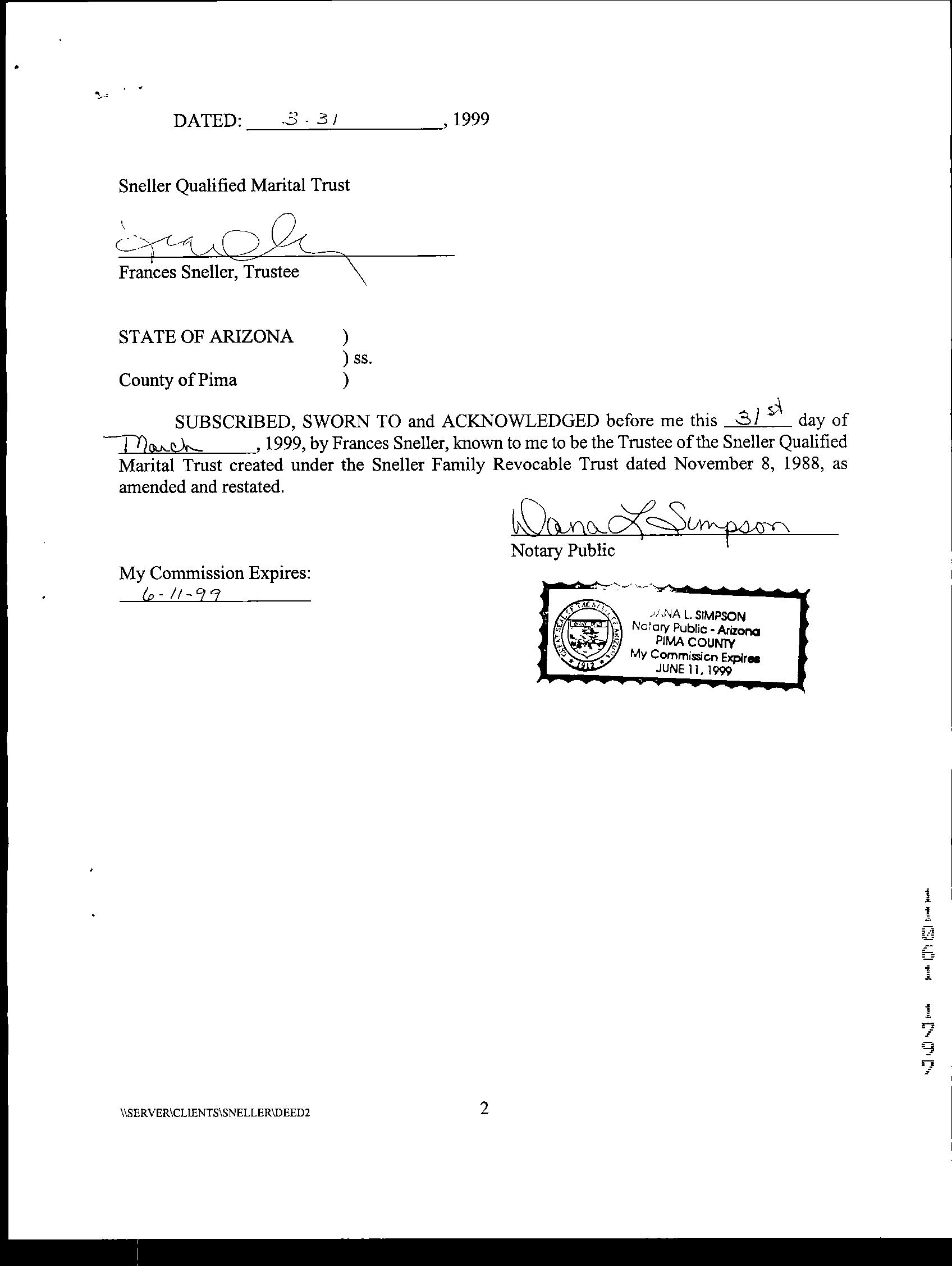 + FIRST AMERICAN TITLE, FC0, LMRA PIMA, AZ 08/19/2022 04:13PM RL13 INVESTIGATIVE SEARCH RESULTS PAGE 1 OF 1 SEARCH PARAMETERS PARCEL: 205-64-110C PARCEL: 205-64-110C INSTRUMENT REC DATE OWNER: SNELLER HOLDINGS LLC 11061 1796 06/04/1999 MAIL: PO BOX 31504 TUCSON AZ 85751-1504 LEGAL: PTN E650.58' PCL 8 RINCON VALLEY RANCHES RS 3/24 AKA PTN SE4 SW4 8.59 AC SEC 24-15-16 CURRENT TAXES INFORMATION THROUGH 07/28/2022 LAND IMPR EXEMPT RATE AREA SPECIAL DISTRICTS PRIMARY 12,785 0 0 9.6792 2002 SECONDARY 13,529 0 0 7.7196 2021 TOTAL TAX BILLED 2,224.42 2021 TAX AMT TAX DUE INTEREST DATE PAID TOTAL DUE FIRST HALF 1,112.21 0.00 0.00 10/07/2021 0.00 SECOND HALF 1,112.21 0.00 0.00 04/25/2022 0.00 TOTAL CURRENT TAXES DUE 08/22 0.00 09/22 0.00 IMPROVEMENTS BLDG SQFT 0 FULL CASH VALUE 90,195 YEAR BUILT 0 LAND USE 00 14 NUMBER OF STORIES LOT SIZE 8.590 ACRES STORIES HEIGHT 0 SCHOOL DISTRICT 2002 EXTERIOR WALLS LAND FULL CASH VALUE 90,195 GRADE MATERIALS IMPR FULL CASH VALUE 0 SALES NO SALES ADDITIONAL PROPERTY INFORMATION STANDARD LAND USE: RESIDENTIAL LOT END SEARCH