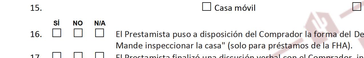y las divulgaciones del Prestamista / / 48.   Se recibió el pago por la evaluación / / 49.   El Prestamista solicitó la evaluación / / 50.   El Prestamista identificó la fuente del enganche / / 51.   El Prestamista recibió y revisó el Compromiso de título / / 52.   El Comprador fijó el programa de préstamos y términos de financiamiento, incluyendo la tasa y puntos de interés / / 53.   Se fijó la fecha de expiración / / 54.   El Prestamista recibió la Documentación inicial que se enumera en los renglones 32 a 35 / / 55.   Se recibió la evaluación / / 56.   El Inmueble/Propiedad se evaluó en al menos el precio de compra / / 57.   La Divulgación de cierre se entregó al Comprador / / 58.   El Comprador recibió la Divulgación de cierre / /
