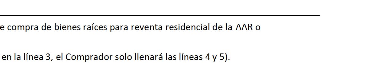 13. El Comprador es:  Casado  Soltero  Separado legalmente 14. El Comprador:  Depende  No depende de la venta o arrendamiento de una propiedad para calificar para este préstamo. 15. El Comprador:  Depende  No depende de las Concesiones del Vendedor para los costos del préstamo del Comprador, incluyendo, embargos, 16. costos de la Agencia del Título o de la Garantía, cuotas de registro y, si aplica, costos del préstamo VA que el Comprador no tiene permitido pagar. 17. (Nota: El Contrato establecerá el monto que el Vendedor acuerda contribuir, si aplica.) 18. Tipo de préstamo:  Convencional  FHA  VA  USDA  Otro: 19. Tipo de habitación:  Principal  Secundaria  No habitada por el dueño 20. Tipo de propiedad:  Residencia unifamiliar  Condominio  Unidad habitacional  Casa manufacturada 21.  Casa móvil  Terreno/Lote baldío  Otro: SÍ NO N/A 22.    El Prestamista pondrá a disposición del Comprador la forma del Departamento de Vivienda y Desarrollo Urbano (HUD) titulado "Para su protección: Mande inspeccionar la casa" (solo para préstamos de la FHA) 23.    El Prestamista finalizó una discusión verbal con el Comprador, incluyendo los temas de ingresos, activos y deudas. 24.    El Prestamista obtuvo un Reporte crediticio residencial triple. 25. Según la información provista, el Comprador precalifica para préstamo por un monto de: $ , 26. suponiendo un pago mensual principal y de intereses por el préstamo de $ , siempre y cuando el pago total mensual 27. (el cual incluye pago principal, intereses, seguro de hipoteca, impuesto sobre la propiedad, seguro sobre la vivienda, cargos de la Asociación de propietarios y seguro 28. contra inundación, según corresponda) no exceda: $ 29. La tasa de interés no excederá: %  Tasa de interés fija  Tasa de interés ajustable  Multa por prepago 30. Documentación inicial recibida: El Prestamista recibió la siguiente información por parte del Comprador: 31. (Se puede solicitar documentación adicional): SÍ NO N/A SÍ NO N/A 32.    Recibos    Documentación del enganche o las reservas 33.    W 2s    Documentación de obsequio 34.    Declaraciones de impuestos individuales    Documentación crediticia o de responsabilidad 35.    Declaraciones de impuestos corporativos    Otros: 36. Comentarios adicionales: 37. El Comprador instruyó, y el Prestamista acepta poner a disposición del Vendedor y el o los Agentes las actualizaciones del estado del préstamo según esta forma de Actualización del estado del préstamo de la AAR 38. en un plazo de diez (10) días a partir de la aceptación del Contrato, en cumplimiento de la Sección 2e de este Contrato y bajo petición posterior de los mismos. 39. El Comprador se compromete a trabajar con el Prestamista antes mencionado bajo los términos aquí descritos. El Comprador acusa de recibo una copia del mismo. 40. ^ FIRMA DEL COMPRADOR MES / DÍA / AÑO ^ FIRMA DEL COMPRADOR MES / DÍA / AÑO