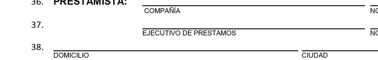 32. El Prestamista identificado a continuación preparó la información anterior junto con el o los Compradores, y llenó las anteriores líneas de acción. 33. Esta información no constituye una aprobación del préstamo. Toda información provista debe estar aprobada por un suscriptor, y todos los cambios materiales 34. en el perfil crediticio o financiero del Comprador dejarán a esta precalificación sin efecto. 35. La precalificación anterior expira en: FECHA 36. PRESTAMISTA: COMPAÑÍA NO. DE LICENCIA EN ARIZONA NO. de NMLS 37. EJECUTIVO DE PRESTAMOS NO. DE LICENCIA EN ARIZONA NO. de NMLS 38. DOMICILIO CIUDAD ESTADO CÓDIGO POSTAL 39. CORREO ELECTRÓNICO TELÉFONO FAX 40. ^ FIRMA DEL EJECUTIVO DE PRESTAMOS MES/DÍA/AÑO 41. El Comprador acusa de recibo una copia del mismo y otorga permiso al Agente a presentar esta Forma de precalificación junto con el Contrato. 42. ^ FIRMA DEL COMPRADOR MES/DÍA/AÑO ^ FIRMA DEL COMPRADOR