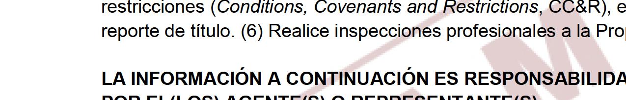 El Comprador y el Vendedor asumen toda responsabilidad en caso de que el rendimiento de la inversión, consecuencias fiscales, efectos sobre el crédito o los términos financieros no cumplan con sus expectativas. Las partes comprenden y aceptan que el o los Agentes no ofrecen asesoría sobre la propiedad como una inversión. El o los Agentes no están calificados para ofrecer asesoría financiera, legal o fiscal relacionada con una transacción de bienes raíces. Por lo tanto, el o los Agentes no realizan ninguna declaración en cuanto a los temas arriba mencionados. Se aconseja al Comprador y al Vendedor obtener asesoría fiscal y legal profesional en cuanto a qué tan conveniente es celebrar esta transacción.