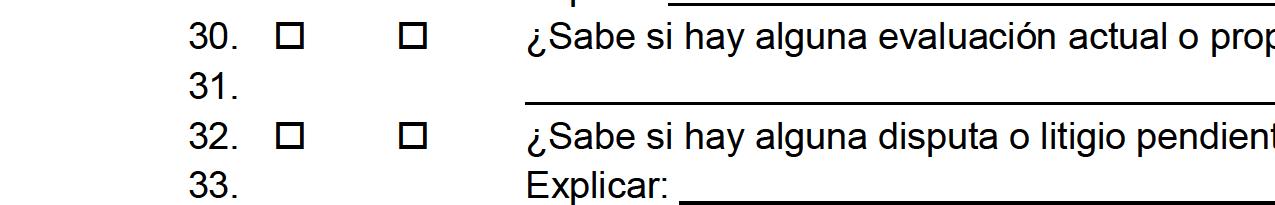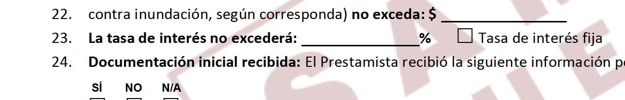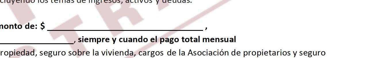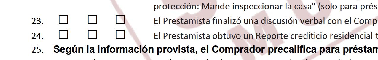 Su tarifa actual, pago, y costos podrían ser más altos. Obtenga un estimado del préstamo oficial antes de hacer una selección PARA PRECALIFICACIÓN Objetivo: Esta Forma de precalificación debe emplearse junto con el Contrato de compra de bienes raíces para reventa residencial de la AAR o Contrato de compra de terreno/lote baldío ("Contrato"). El Comprador NO consultó a un prestamista (si el Comprador marca la casilla en la línea 3, el Comprador solo llenará las líneas 4 y 5). NOMBRE DEL COMPRADOR (LETRA DE IMPRENTA) NOMBRE DEL COMPRADOR (LETRA DE IMPRENTA) ^ FIRMA DEL COMPRADOR MES / DÍA / AÑO ^ FIRMA DEL COMPRADOR MES / DÍA / AÑO El Prestamista indicado en las líneas 36 y 37 consultó a y presenta lo siguiente: El Comprador es: Casado Soltero Separado legalmente El Comprador: Depende No depende de la venta o arrendamiento de una propiedad para calificar para este préstamo El Comprador: Depende No depende de las Concesiones del Vendedor para los costos del préstamo del Comprador, incluyendo embargos, costos de la Agencia del Título o de la Garantía, cuotas de registro y, si aplica, costos del préstamo VA que el Comprador no tiene permitido pagar. (Nota: El Contrato establecerá el monto que el Vendedor acuerda contribuir, si aplica.) Tipo de préstamo: Convencional FHA VA USDA Otro: Tipo de habitación: Principal Secundaria No habitada por el dueño Tipo de propiedad: Residencia unifamiliar Condominio Unidad habitacional Casa manufacturada Casa móvil Terreno/Lote baldío Otro: SÍ NO N/A 16. El Prestamista puso a disposición del Comprador la forma del Departamento de Vivienda y Desarrollo Urbano (HUD) titulado "Para su protección: Mande inspeccionar la casa" (solo para préstamos de la FHA). El Prestamista finalizó una discusión verbal con el Comprador, incluyendo los temas de ingresos, activos y deudas. El Prestamista obtuvo un Reporte crediticio residencial triple. Según la información provista, el Comprador precalifica para préstamo por un monto de: $ , suponiendo un pago mensual principal y de intereses por el préstamo de $ , siempre y cuando el pago total mensual (el cual incluye pago principal, intereses, seguro de hipoteca, impuesto sobre la propiedad, seguro sobre la vivienda, cargos de la Asociación de propietarios y seguro contra inundación, según corresponda) no exceda: $ La tasa de interés no excederá: % Tasa de interés fija Tasa de interés ajustable Multa por prepago Documentación inicial recibida: El Prestamista recibió la siguiente información por parte del Comprador (se puede solicitar documentación adicional): SÍ NO N/A SÍ NO N/A Recibos Documentación del enganche o las reservas W 2s Documentación de obsequio Declaraciones de impuestos individuales Documentación crediticia o de responsabilidad Declaraciones de impuestos corporativos Otros: Comentarios adicionales: El Comprador instruyó, y el Prestamista acepta poner a disposición del Vendedor y el o los Agentes las actualizaciones del estado del préstamo según esta forma de Actualización del 31. estado del préstamo de la AAR en un plazo de diez (10) días a partir de la aceptación del Contrato, en cumplimiento de la Sección 2e de este contrato y bajo petición posterior de los mismos.