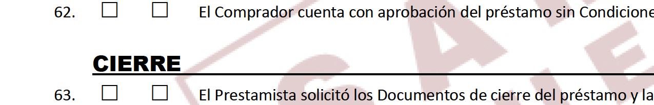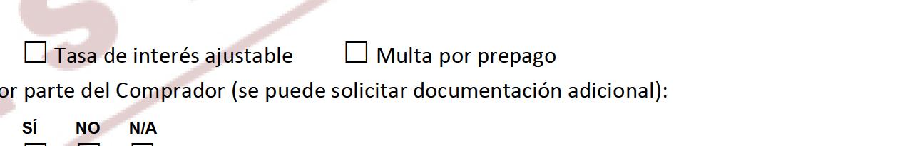 pendientes por parte del Comprador necesarios para obtener la aprobación del préstamo sin condiciones y cerrar esta transacción, no constituyen una