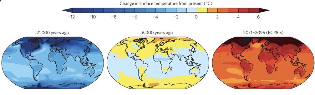 Model-simulated global temperature anomalies for the Last Glacial Maximum (21,000 years ago), the mid-Holocene (6,000 years ago), and projection for 2071–2095. Source: World Bank