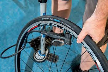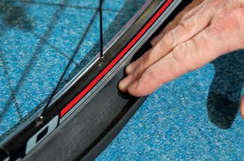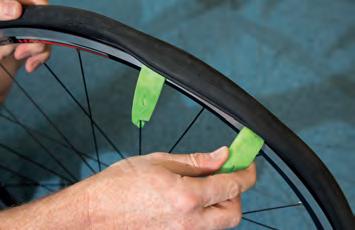 Be sure that one side of the tyre is securely on the wheel, then begin to hook the other side onto the rim. Start at the valve hole and work your way around using both hands so they meet at the far side. The last part of bead may need strong thumbs or some persuasion with a tyre lever, but be careful not to pinch the tube. Check carefully that no inner tube is poking out, then pump the tyre back up to the correct pressure.