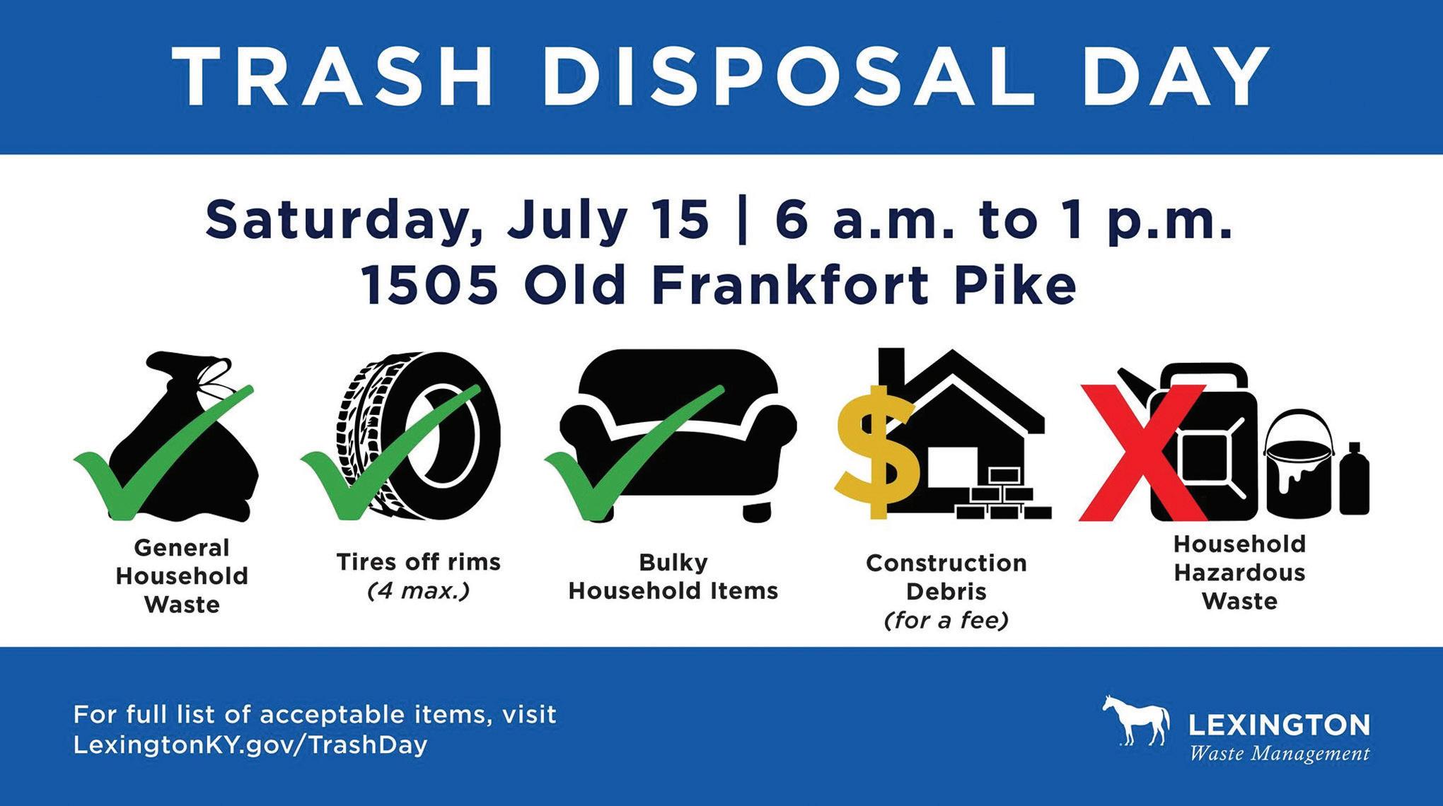 The City of Lexington offers Fayette County residents a free trash disposal day for non-hazardous household waste. The event will be held from 6 a. m. to 1 p.m. at the Bluegrass Regional Transfer Station, 1505 Old Frankfort Pike.