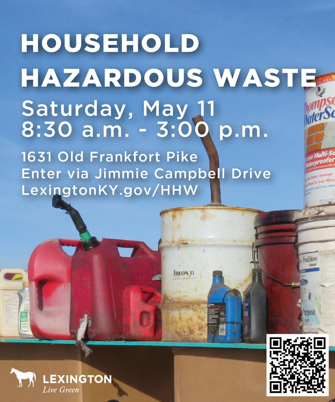 The city’s next Household Hazardous Waste Collection Event is Saturday, May 11, 2024 from 8:30 am –3 pm. Products that contain corrosive, toxic or flammable ingredients are household hazardous wastes (HHW). These materials include common household items such as paints, cleaners, oils, batteries and pesticides. Improper disposal can pollute air, water or soil and pose a threat to human health. During these events, Fayette County residents can drop off the hazardous materials that have accumulated in their homes. The city will properly dispose of them, free of charge. This event is held at 1631 Old Frankfort Pike (enter via Jimmy Campbell Dr.)