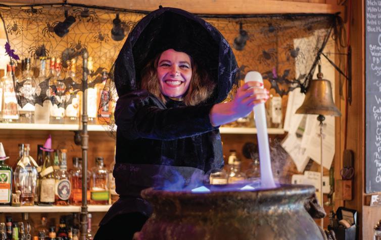 spider and web, creepy photos and two continually smoking cauldrons on the bar, Jill transforms Winchester’s original firehouse into a Halloween work-of-art.