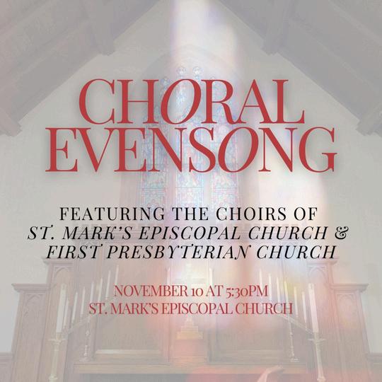 Evensong Service: Join us for an Evensong Service at St. Mark's Episcopal Church on November 10 at 5:30pm, featuring music by the Chancel Choir.