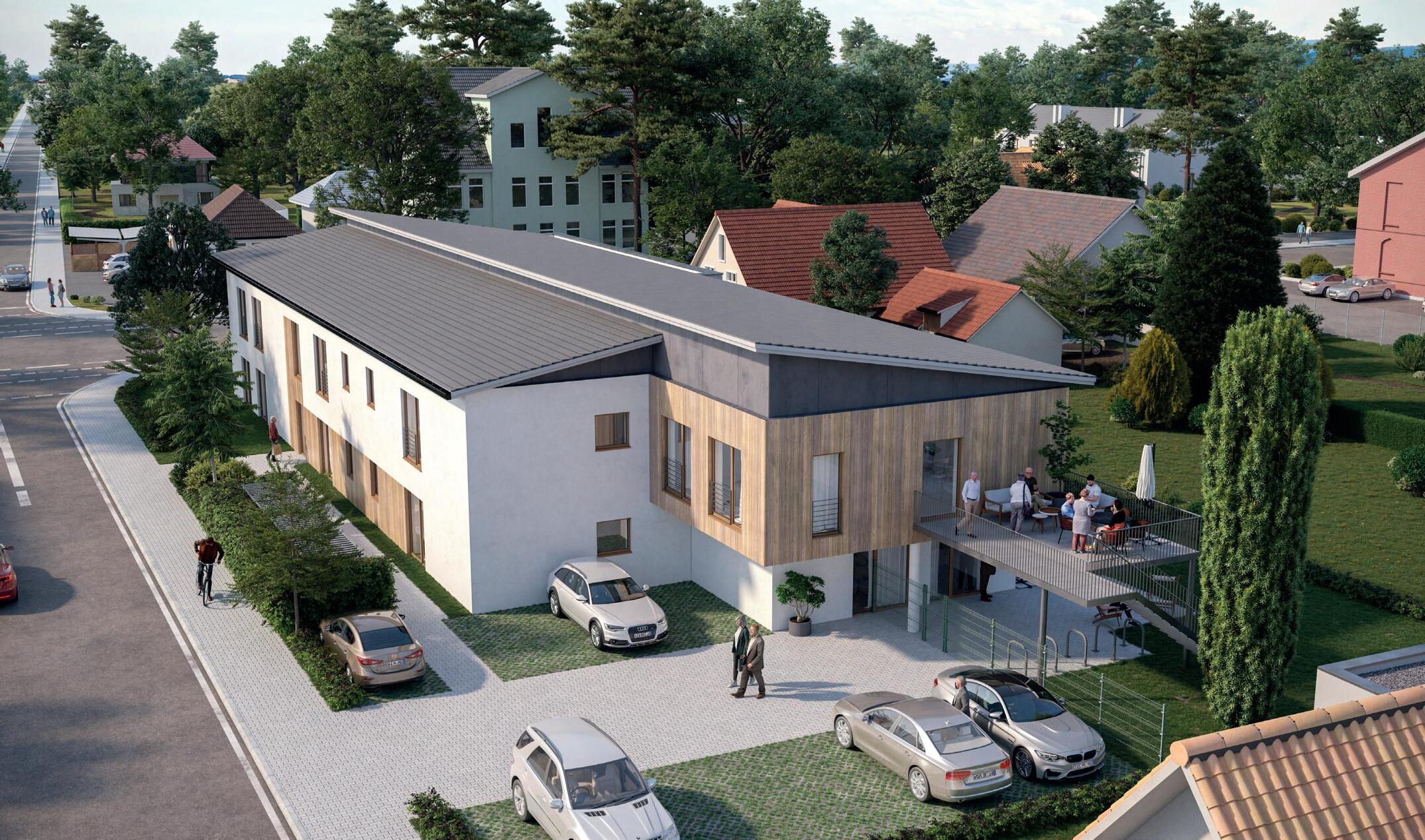 Neubau Pflege- und Wohnquartier – 2 ambulant betreute Wohngruppen mit insgesamt 24 Plätzen, 14 barrierefreie Wohnungen, Tagespflege mit 15 Plätzen und Begegnungscafé.