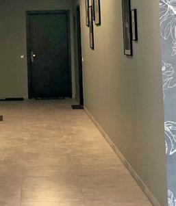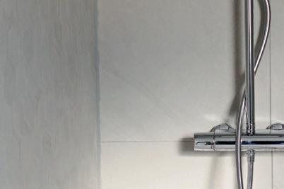 Eine bodengleiche Dusche sowie edle Wand- und Bodenfliesen von Villeroy & Boch machen das Badezimmer zu einem stilvollen Wohlfühlort. Komplettiert wird die Badausstattung durch einen Waschtisch mit integriertem Unterschrank, Spiegel mit indirekter LED-Beleuchtung und Badaccessoires. Der Waschmaschinenanschluss befindet sich im Bad. Ein Einbauschrank für die Waschmaschine kaschiert diese.