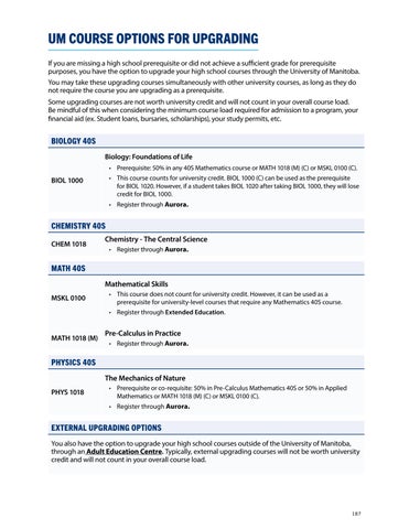 If you are missing a high school prerequisite or did not achieve a sufficient grade for prerequisite purposes, you have the option to upgrade your high school courses through the University of Manitoba. You may take these upgrading courses simultaneously with other university courses, as long as they do not require the course you are upgrading as a prerequisite. Some upgrading courses are not worth university credit and will not count in your overall course load. Be mindful of this when considering the minimum course load required for admission to a program, your financial aid (ex. Student loans, bursaries, scholarships), your study permits, etc.